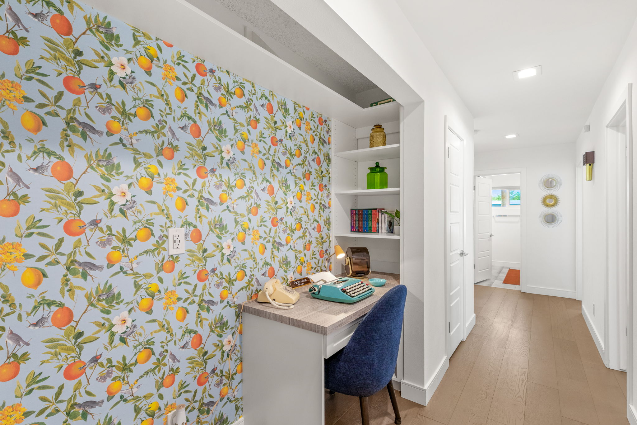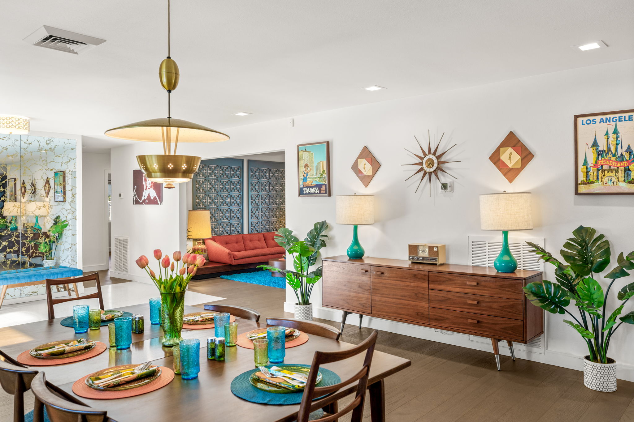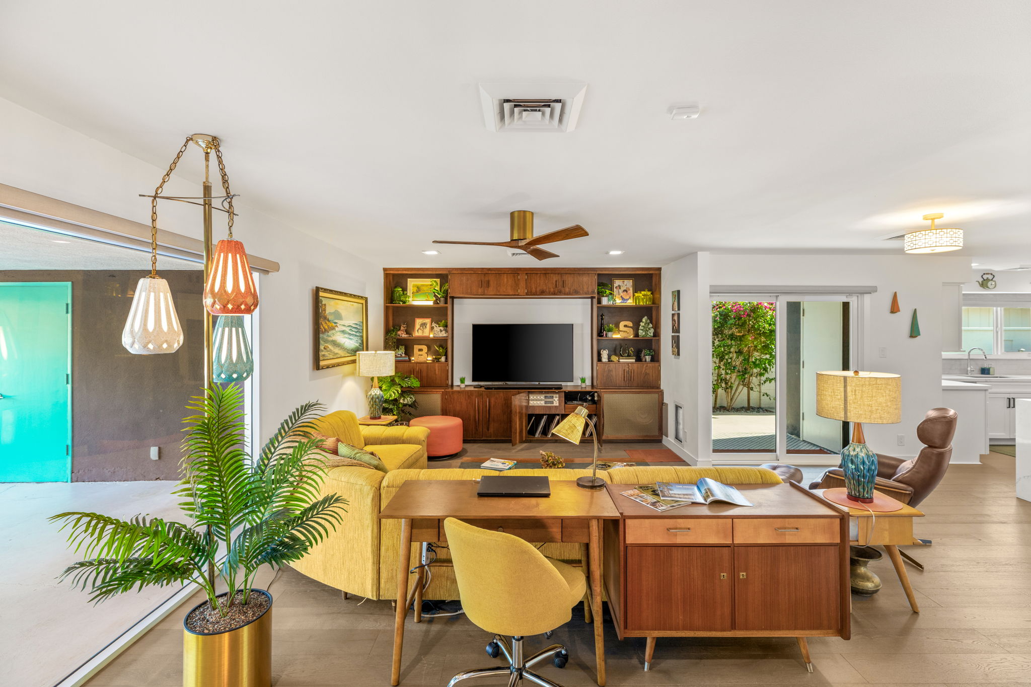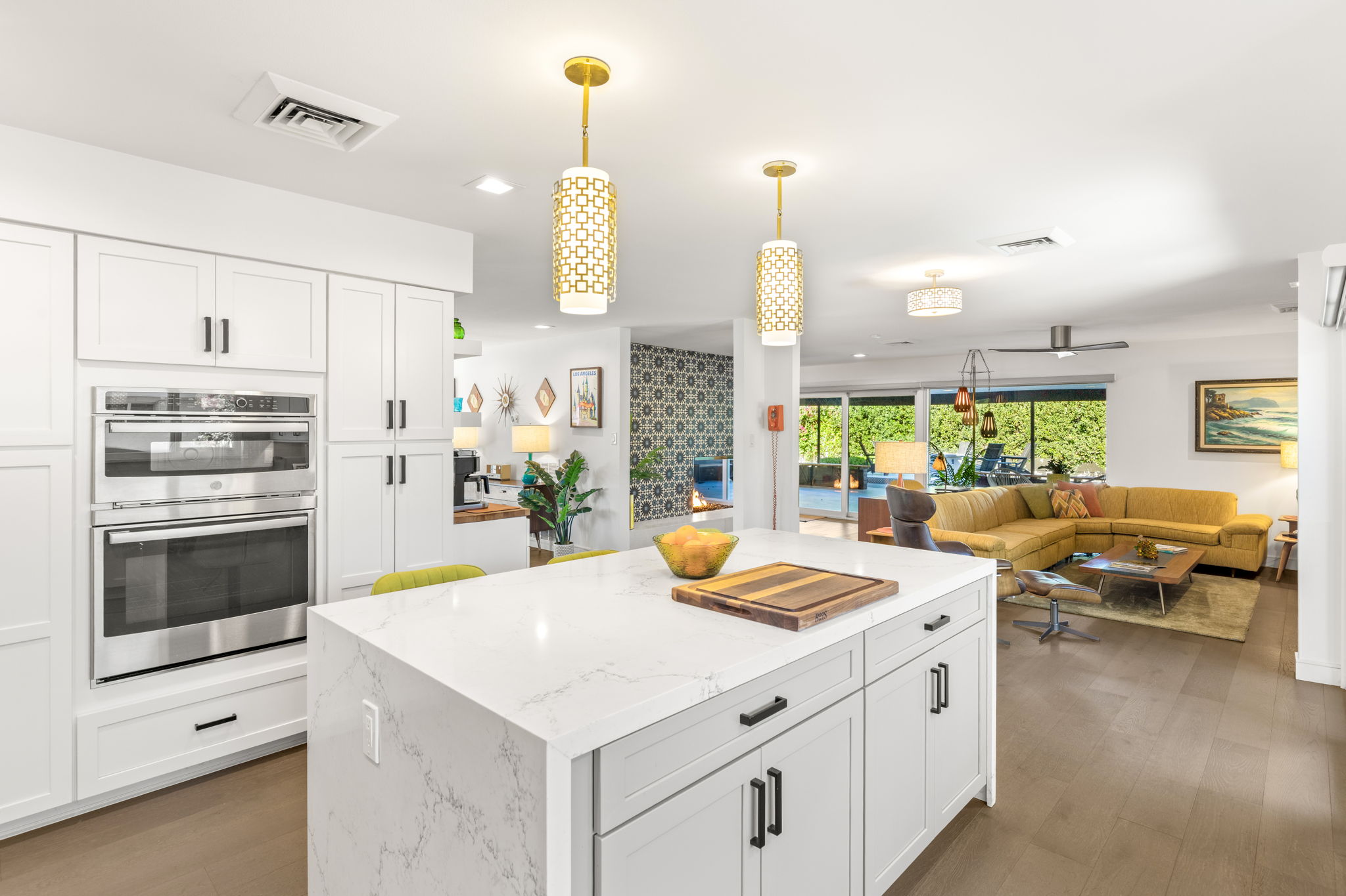 This exceptional residence is located in the heart of the John S. Park Historic District. The home has been fully renovated to honor its architectural roots while blending preserved vintage details within a modern + open floor plan. Original features include gold vein mirrors, original wall dividers, terrazzo floors at the entry, terrazzo fireplace hearth, dramatic three-way fireplace, custom wood entertainment center with original record player—an authentic mid-century design.