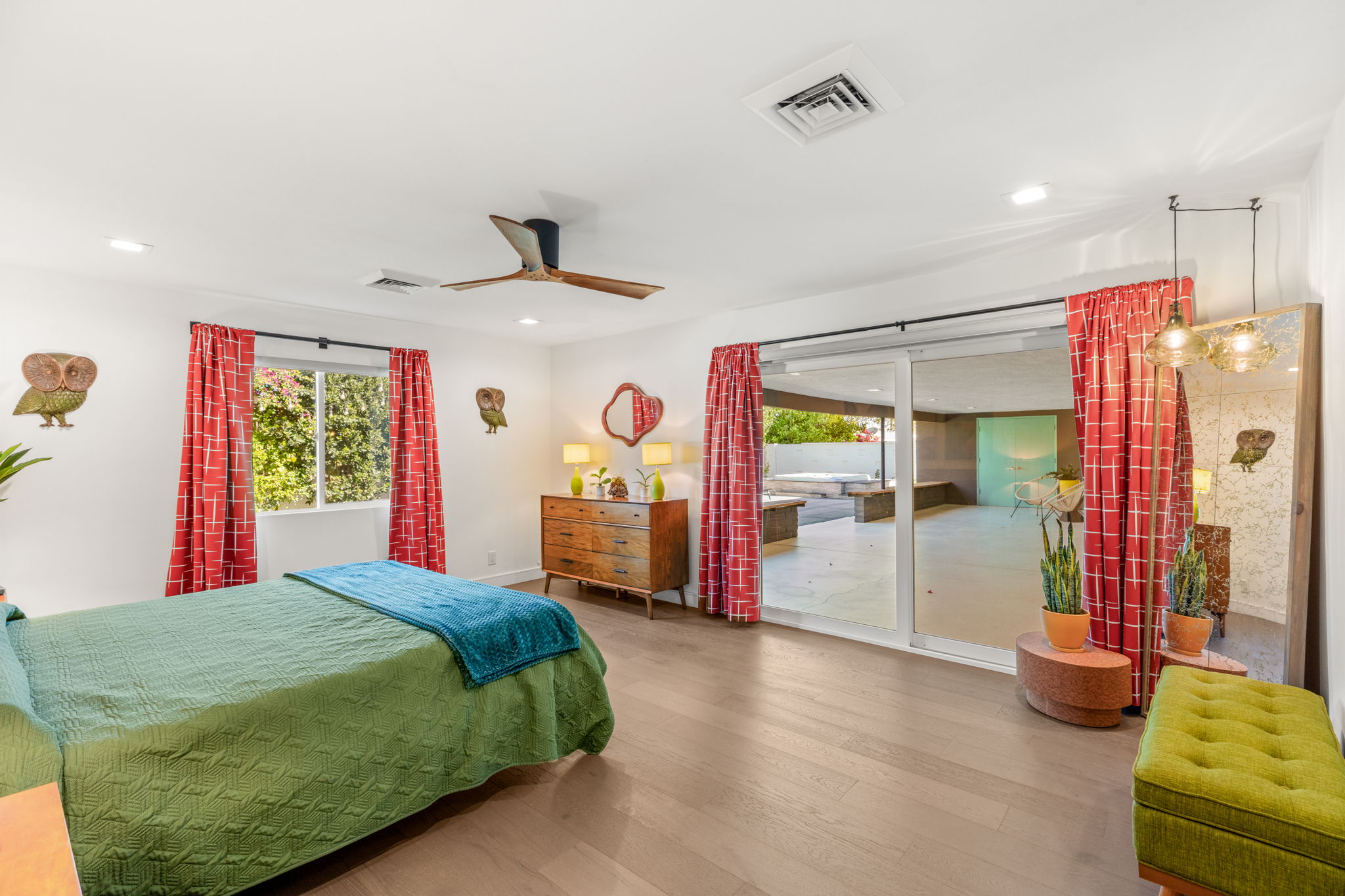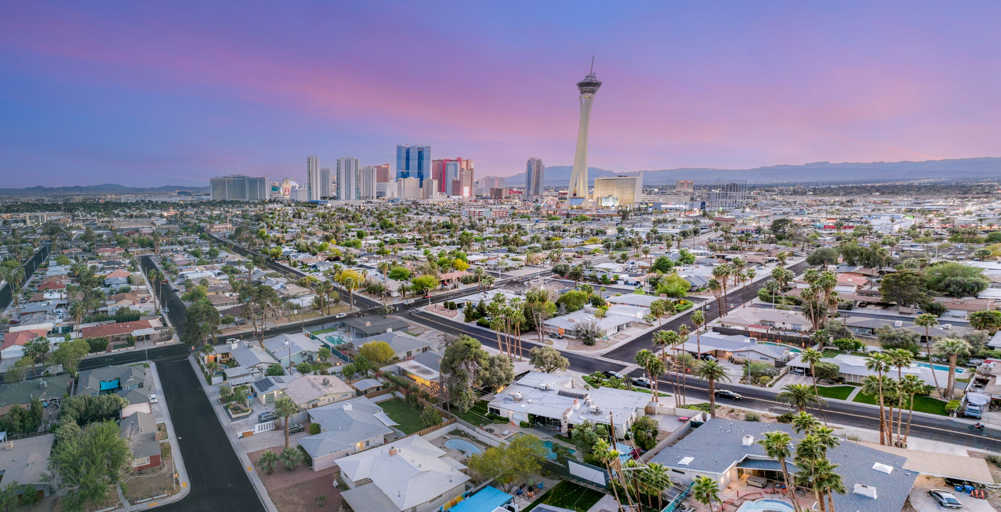 Vintage blue bathroom tile adds timeless character, while expansive floor-to-ceiling windows frame the impeccably manicured backyard, offering seamless indoor-outdoor living. Set on an oversized 11,000+ sq ft lot, the property offers a large covered patio and marquee circular driveway. Enjoy iconic views of the Stratosphere and walkable access to the Arts District. A true mid-century modern jewel, perfectly curated inside and out. Renovated approx. 5 years ago, A/C units replaced within 3 years.
