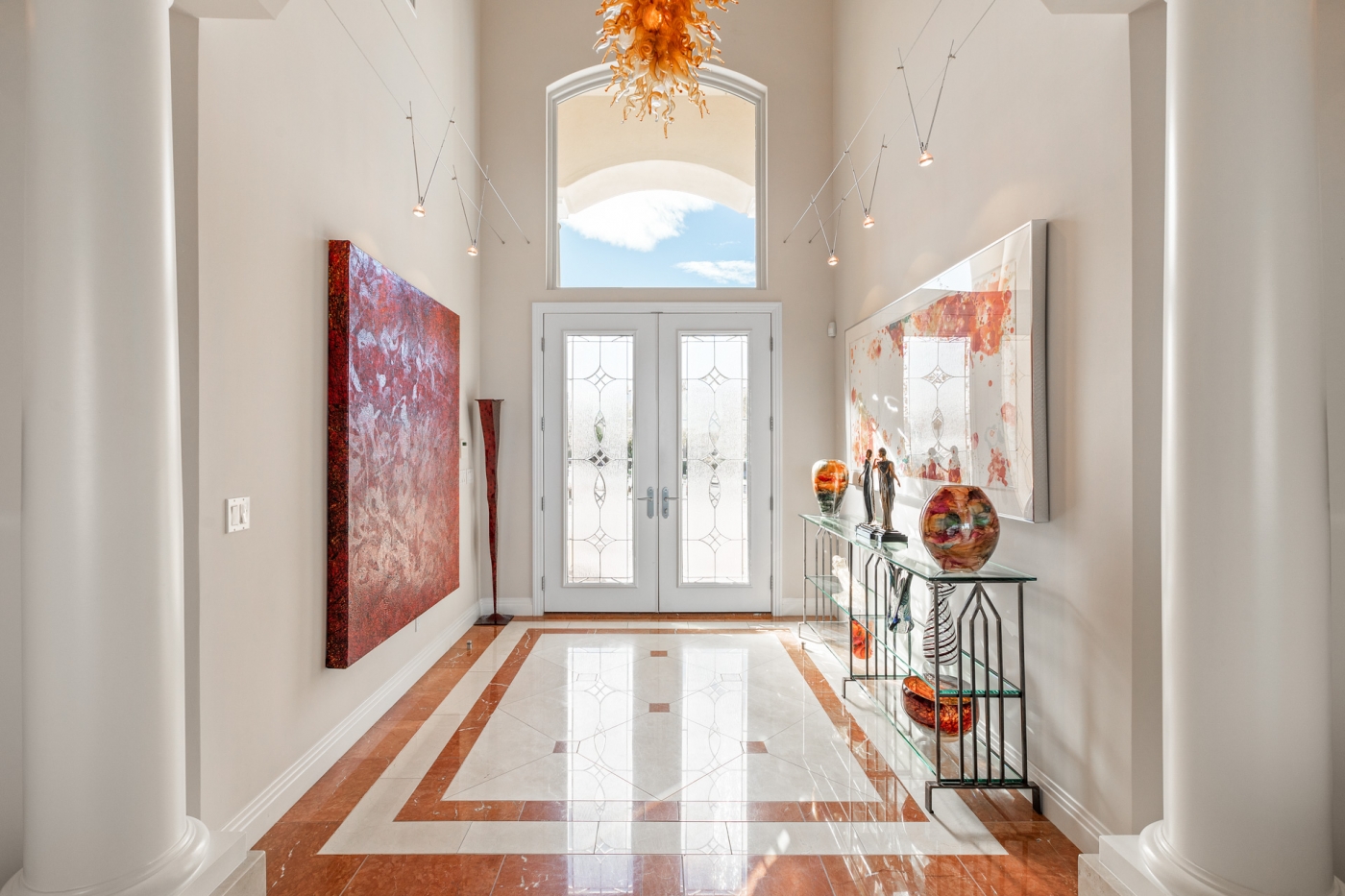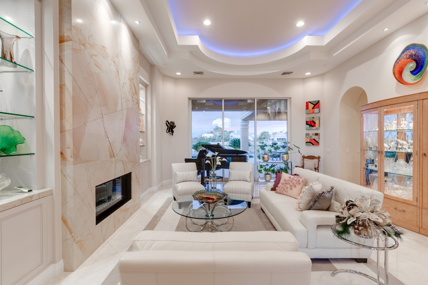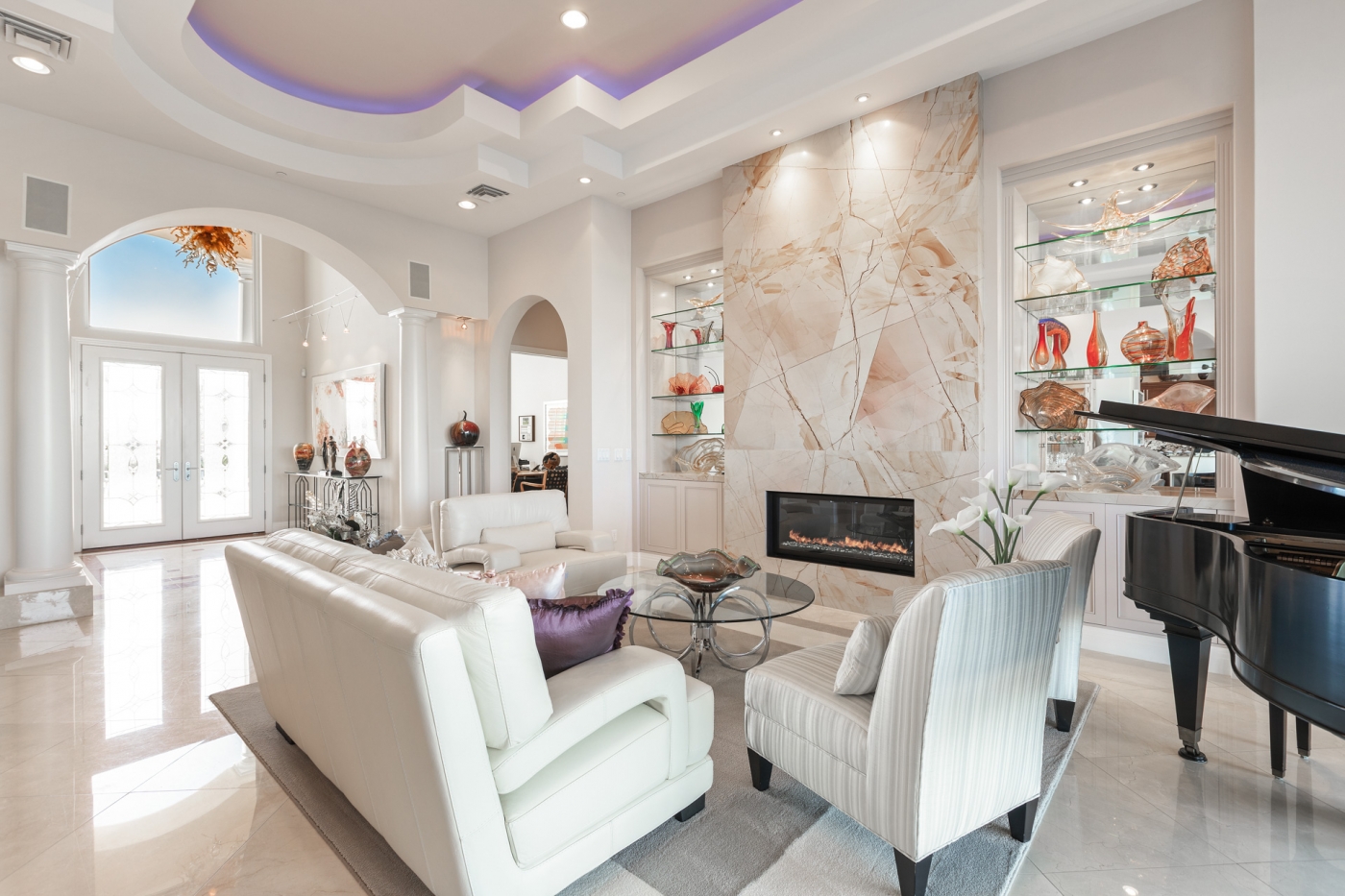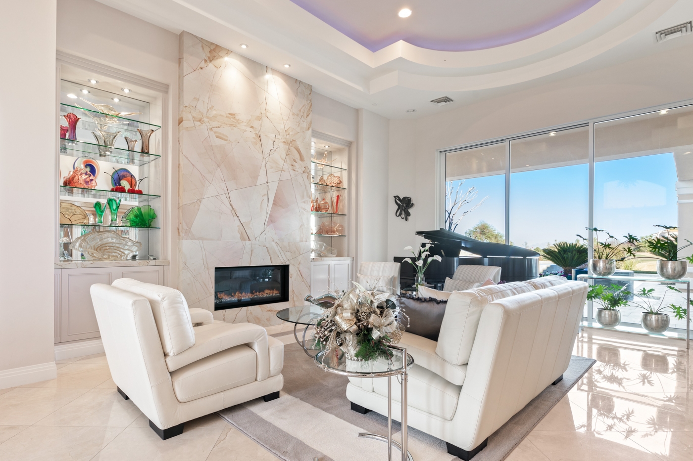 Enter the living room through an elegant foyer with 24āx 24ā Crema Marfil polished marble flooring with Rojo Alicante accents. Take in unobstructed views of the pool area and golf course from the living room which boasts a large, contemporary fireplace with a floor to ceiling āteakwoodā marble surround. The kitchen, family room, and informal dining areas feature Versailles pattern bone travertine with 10' glass sliding/pocket doors that lead seamlessly to the outdoor entertainment area. The kitchen includes Viking Professional series appliances and two dishwashers. The sprawling master bedroom suite includes "His" and "Hers" amenities, open views to the golf course, and four large closets. This 4 bedroom, 2 den, 5 bath home features 4,973 square feet of living space including a game/card room, living room, den/office, dining, and laundry rooms. All rooms are conveniently located on the main floor with the exception of the card/game room and the 4th bedroom suite with a large open balcony on the second story. Views from the second story need to be experienced to be fully appreciated. The master bath includes a large marble shower with two shower heads, a rain shower feature, a handheld showerhead, five body sprays, and a towel warmer. The large pool and entertainment area includes outdoor seating, fire features, access to a half-bath powder room/pool bath, and an outdoor kitchen with high-end appliances. This home includes a full complement of security, smart, and automatic features that provide greater comfort, convenience, and peace of mind.