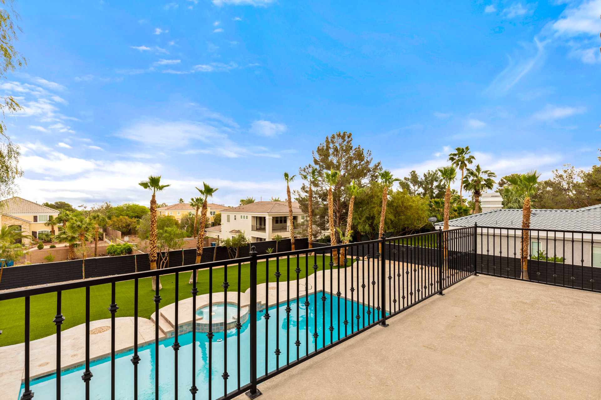 With 6 bedrooms, the 5,034 sq.ft residence offers ample space ensuring privacy and comfort for all residents and guests. The primary bedroom features a spa-like bath finished in marble flooring. Step outside and you'll be captivated by the expansive backyard. The sparkling pool is newly re-plastered. Adjacent to the pool is a generous turf area, perfect for lounging, or alfresco dining. The backyard truly encapsulates the essence of outdoor living in style and tranquility