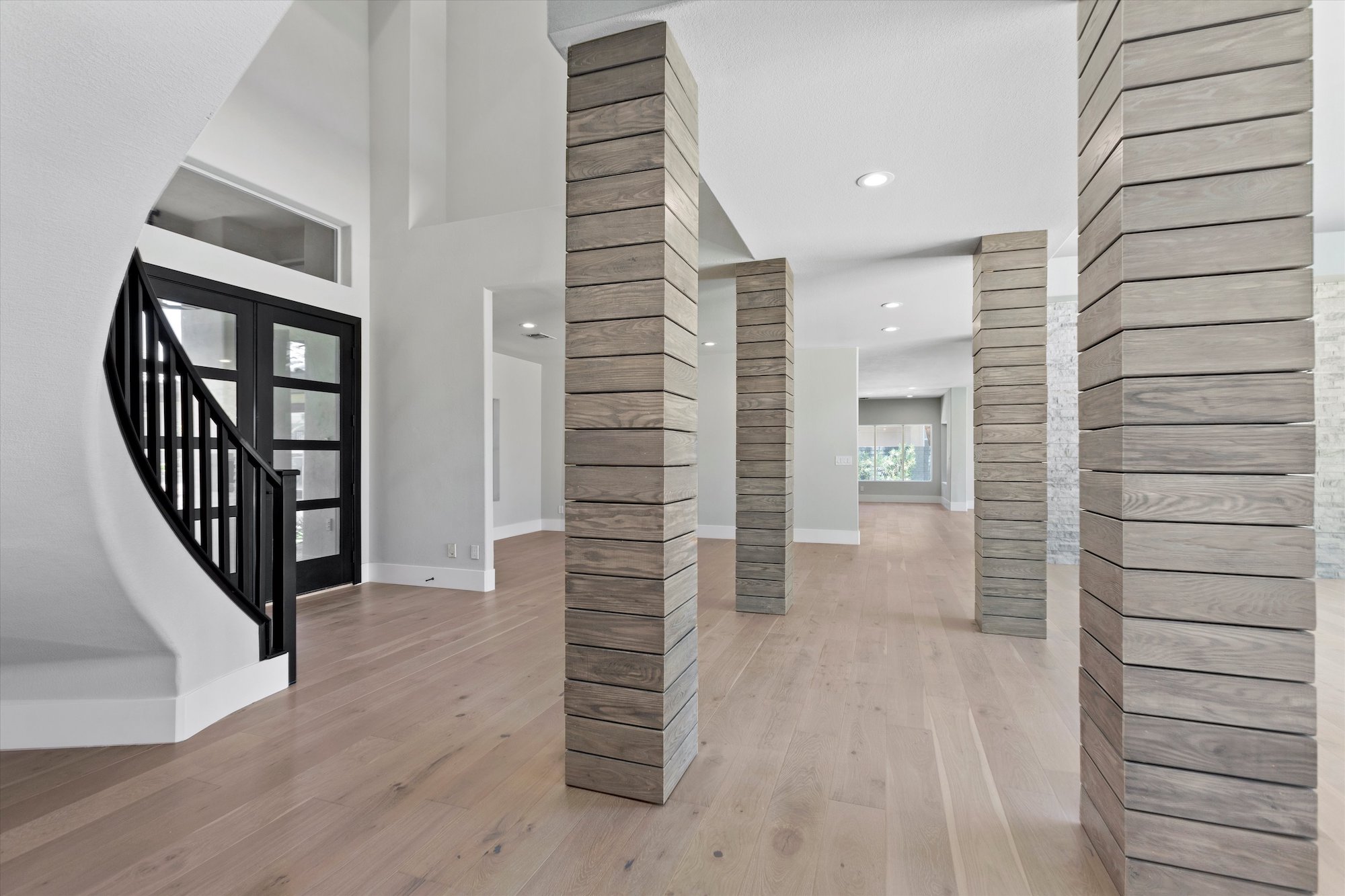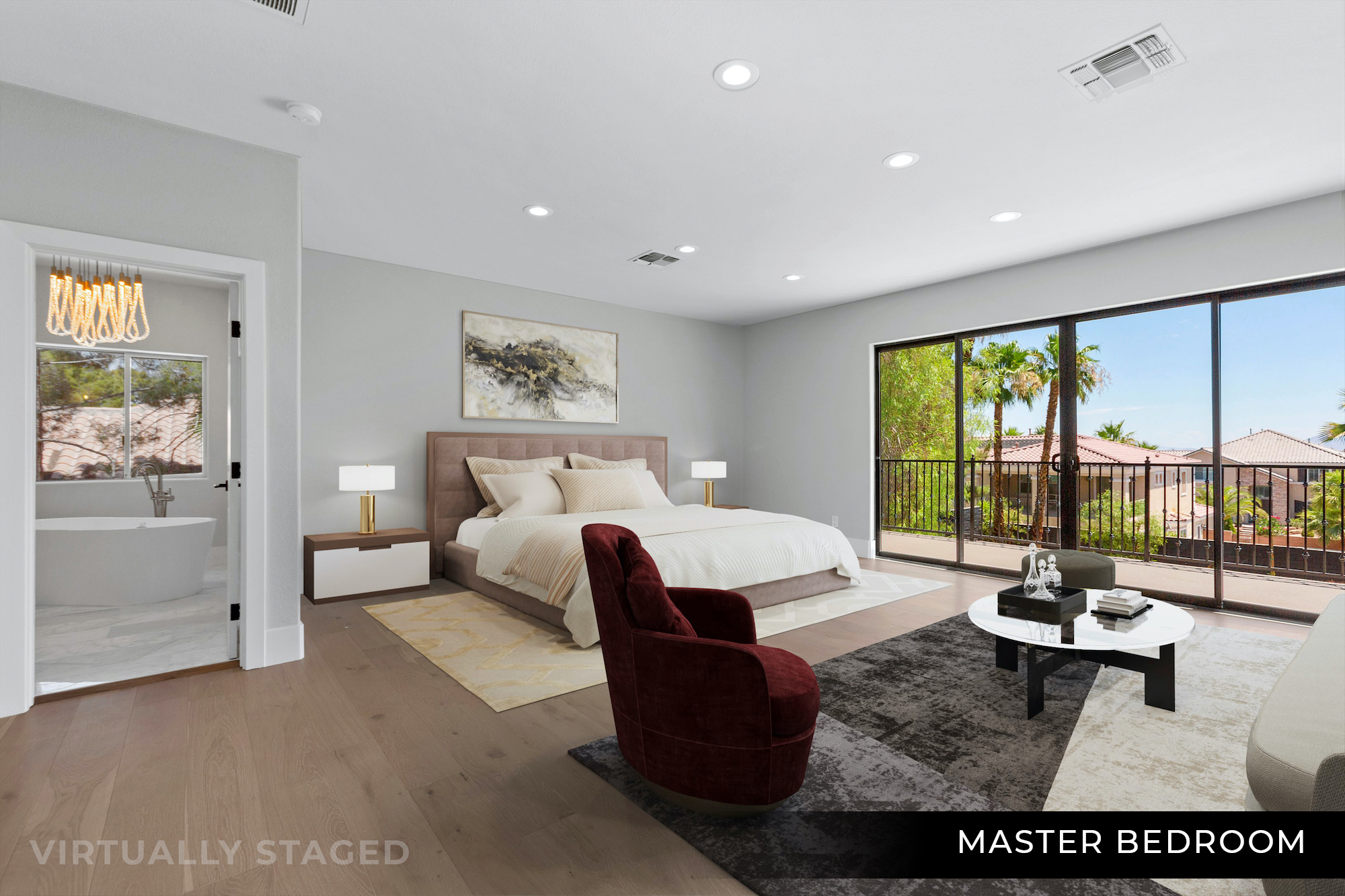 With the master suite and two bedrooms with ensuite baths on the second level, there is also a junior master suite, perfect for aĀ guest room, on the main floor, along with the two additional bedrooms. The upstairs master features a bath with a freestanding corner soaking tub as well as a glass-enclosed shower, dual vanities, a large closet/dressing room, and a private balcony. An open loft at the top of the curving staircase is a perfect retreat, but also could be used as a family den or at-home office. It boasts aĀ small balcony that overlooks the backyardĀ pool.