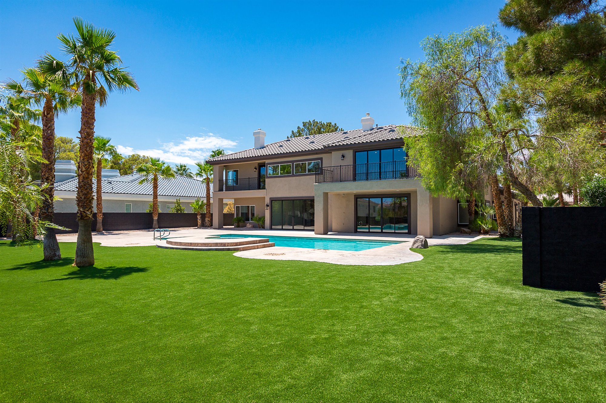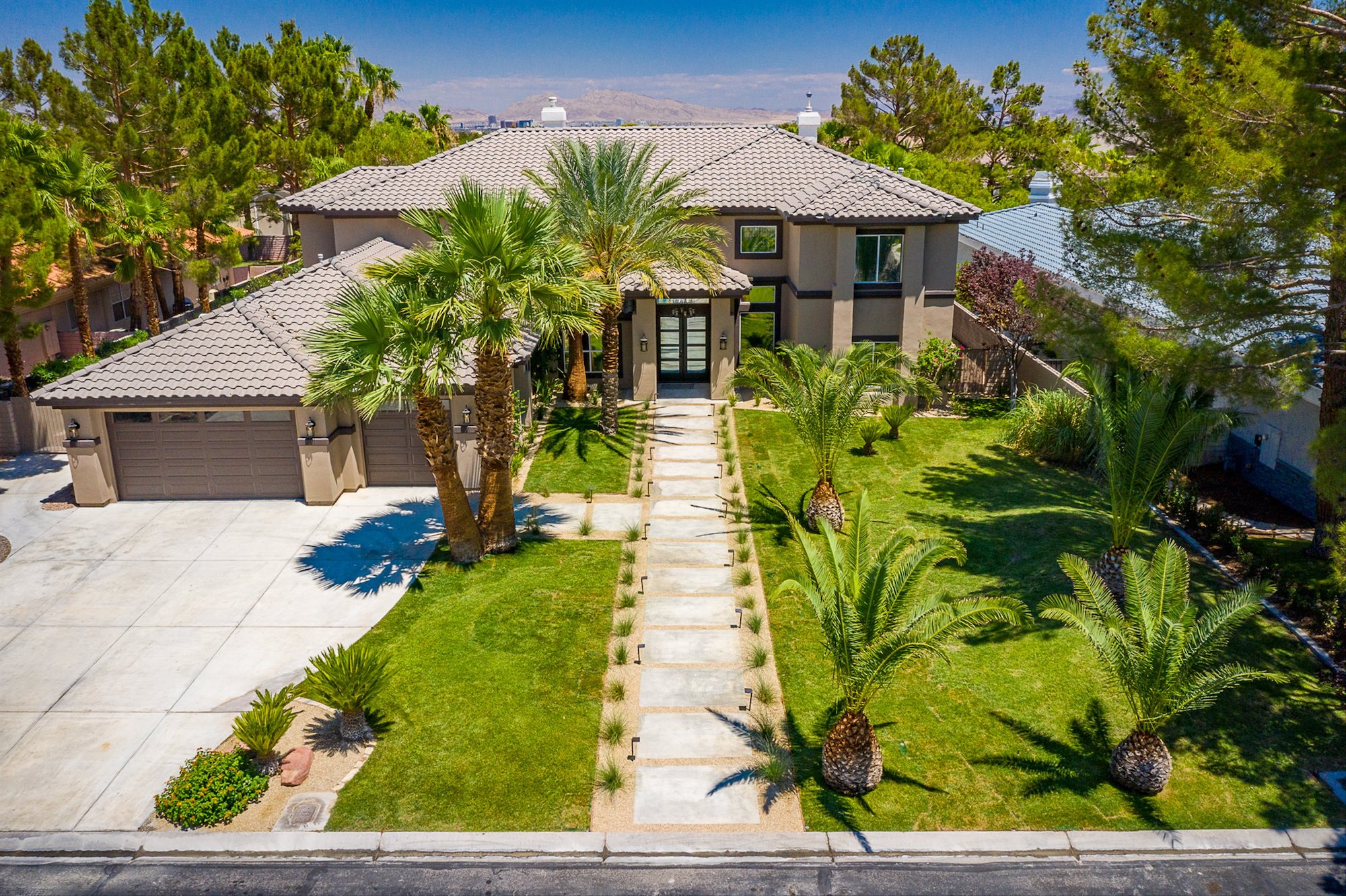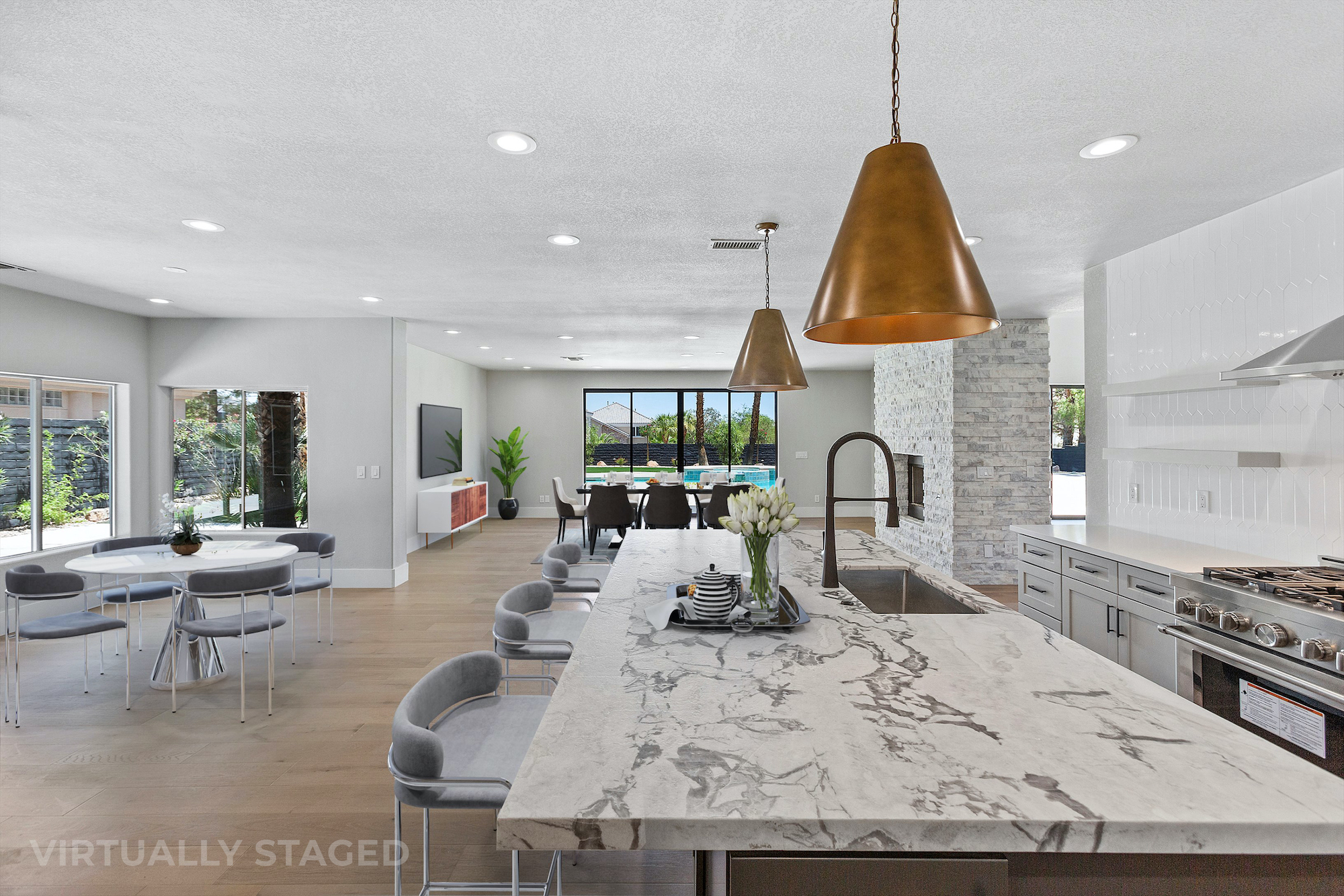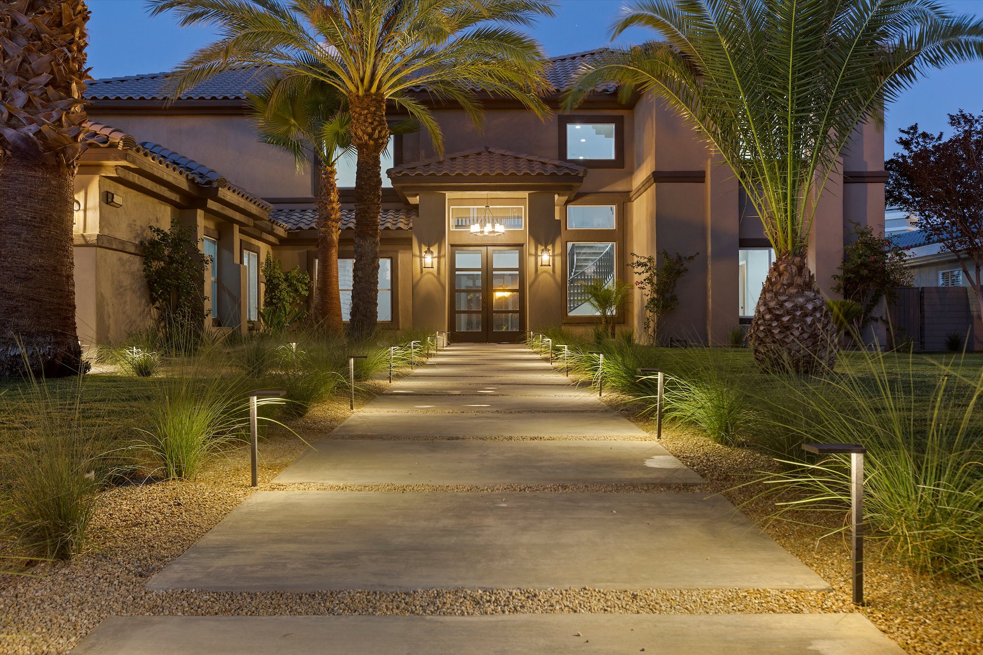 The home's main level includes large formal living and dining space, in addition to an expansive family den withĀ a two-way fireplace set into a stacked stone wall. The kitchen, with pro-style stainless appliances, features a central island with custom cabinetry that contrasts with perimeter cabinets and countertops in the rest of the workspace. Engineered hardwood flooring lends comfortable appeal on the main level. This home's backyard is a vision of landscaped green lawn, centered by a traditional inground pool and attached spa. Towering palms and mature shrubs grace the perimeter of this Mediterranean-style residence toĀ create the feeling of an oasis in the desert. The home boasts an impressive, formal approach and garage parking for three vehicles.
