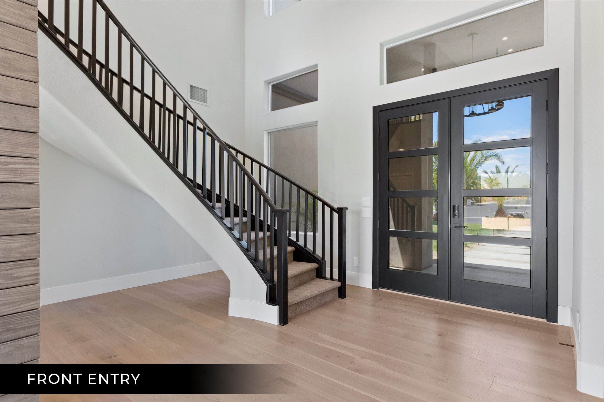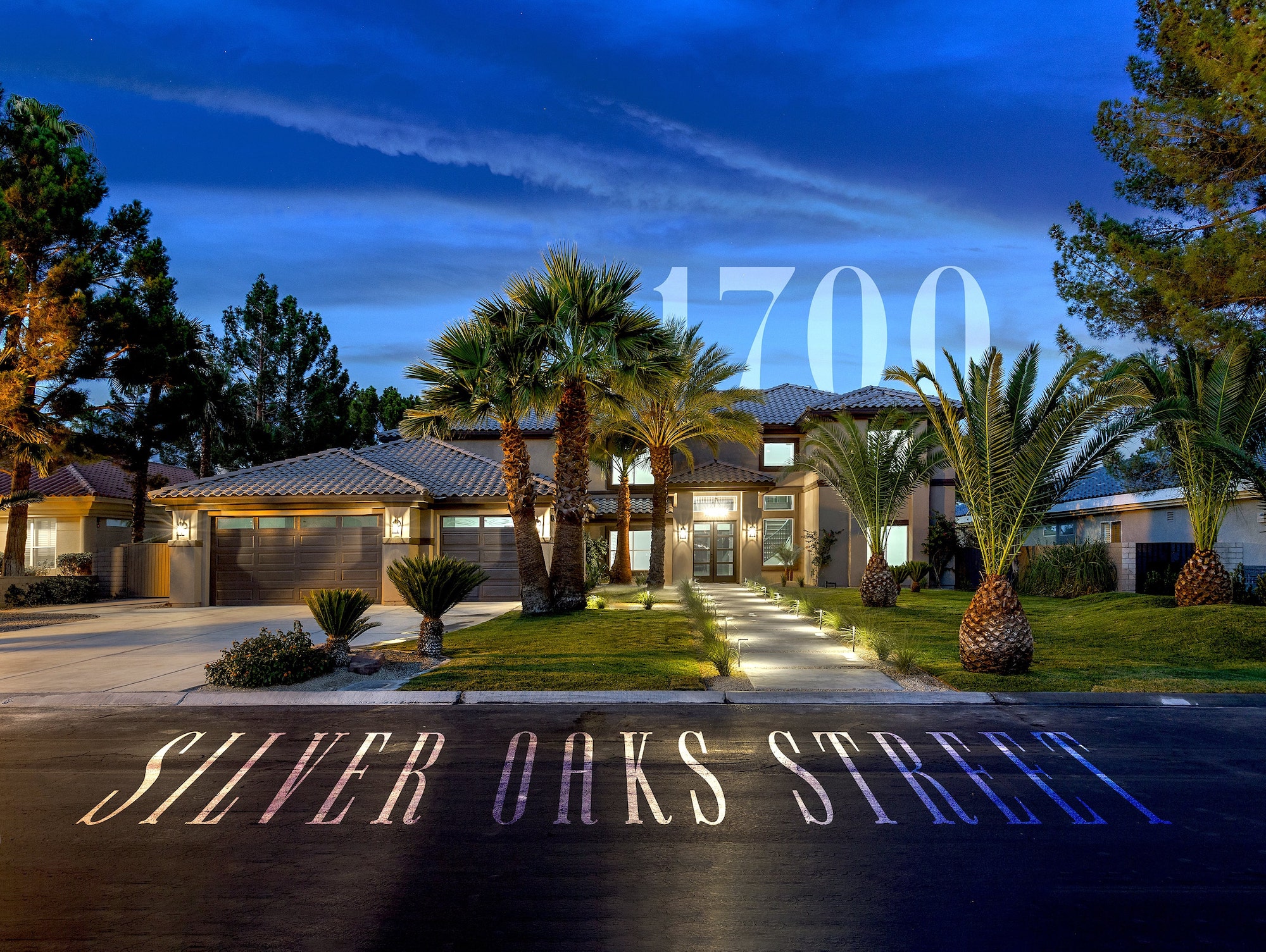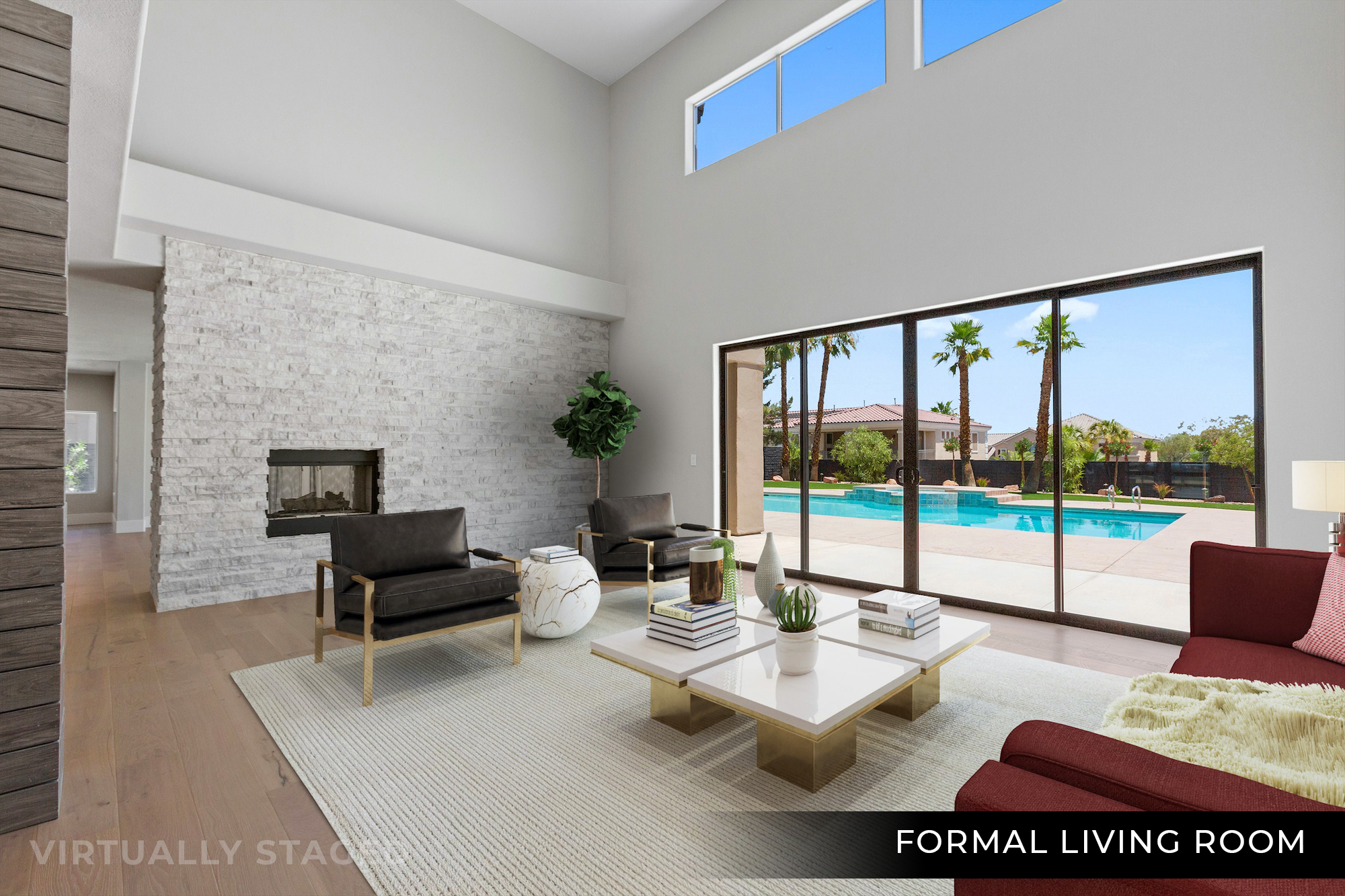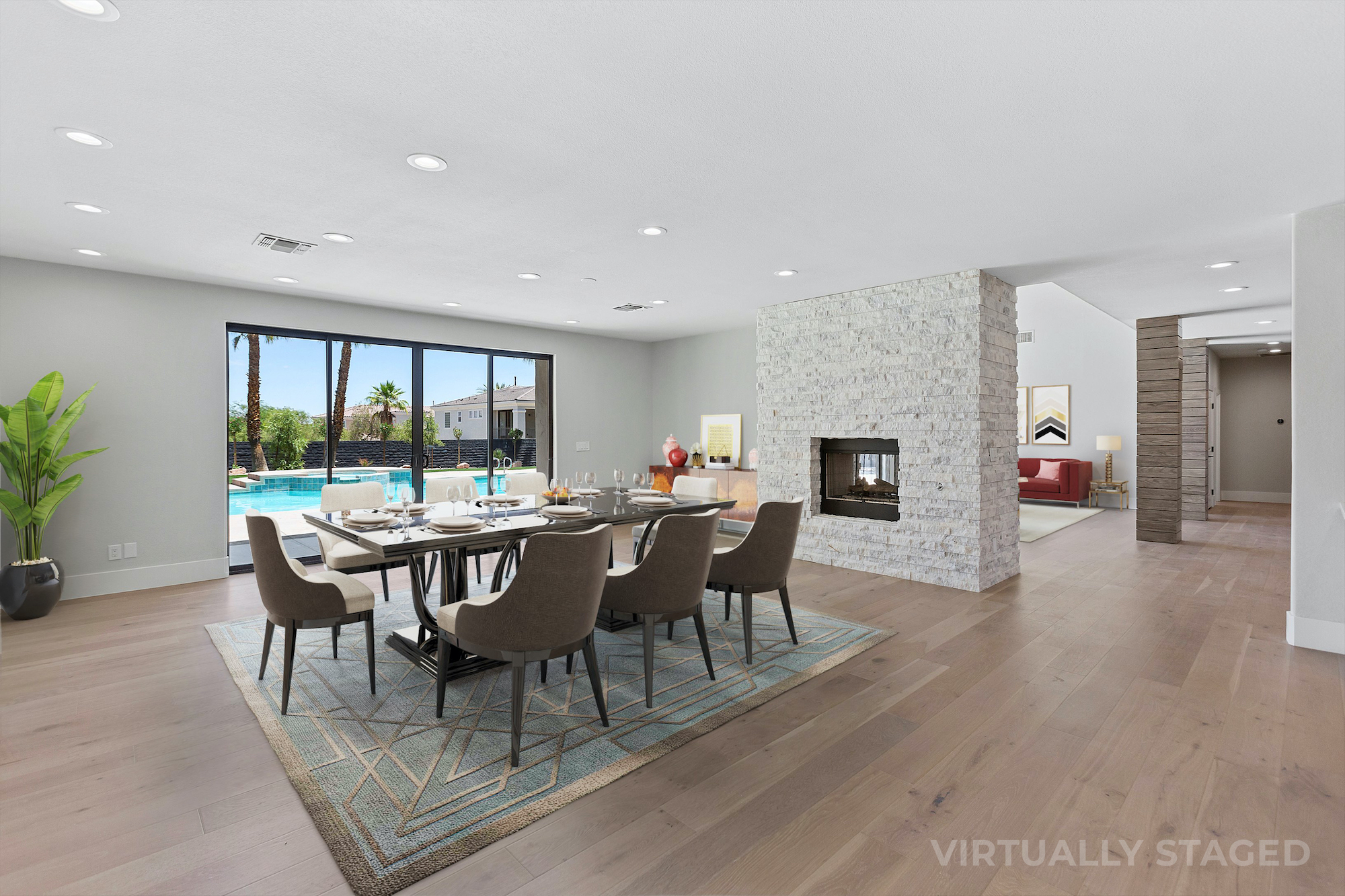 The home's main level includes large formal living and dining space, in addition to an expansive family den withĀ a two-way fireplace set into a stacked stone wall. The kitchen, with pro-style stainless appliances, features a central island with custom cabinetry that contrasts with perimeter cabinets and countertops in the rest of the workspace. Engineered hardwood flooring lends comfortable appeal on the main level. This home's backyard is a vision of landscaped green lawn, centered by a traditional inground pool and attached spa. Towering palms and mature shrubs grace the perimeter of this Mediterranean-style residence toĀ create the feeling of an oasis in the desert. The home boasts an impressive, formal approach and garage parking for three vehicles.