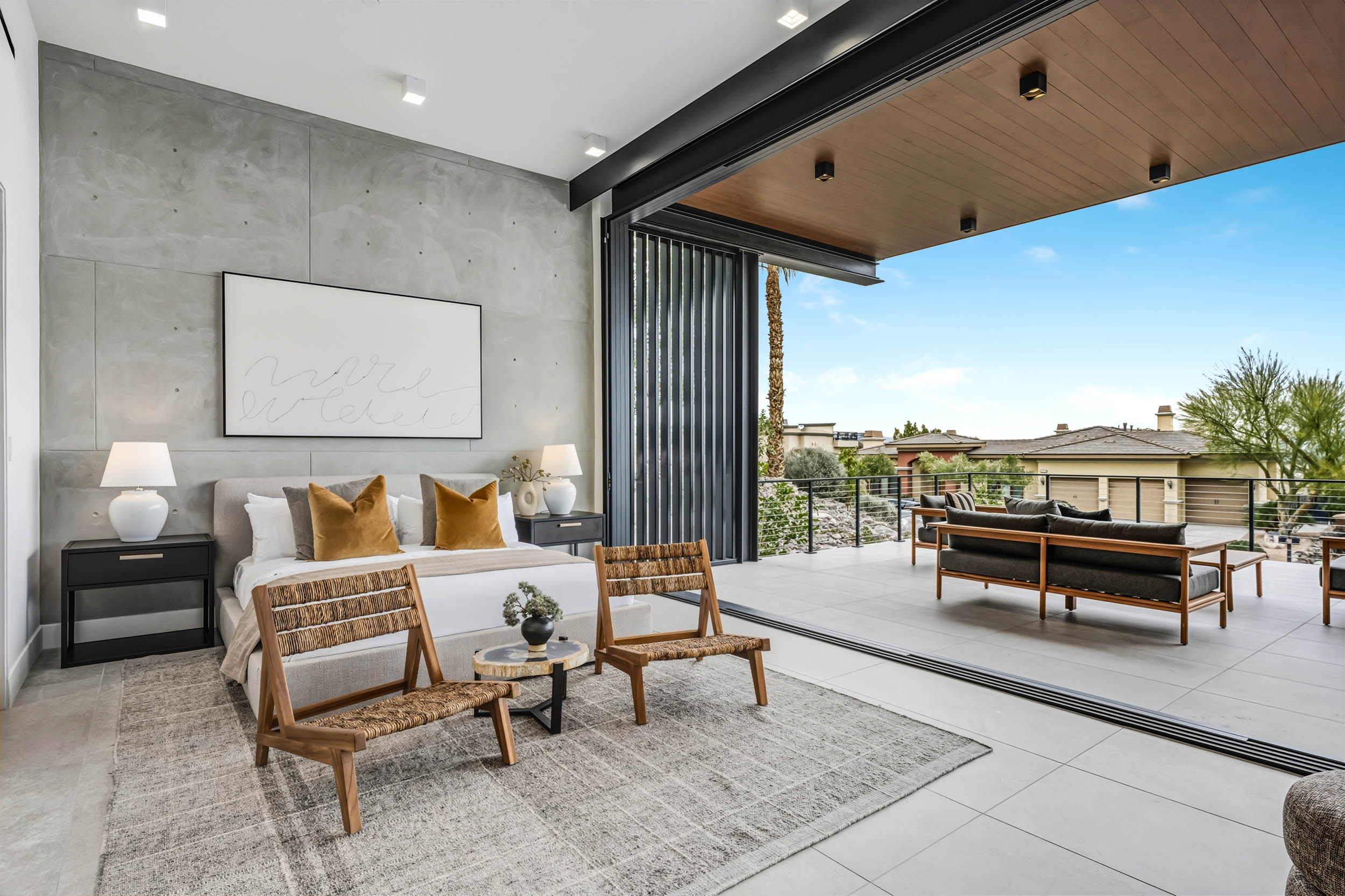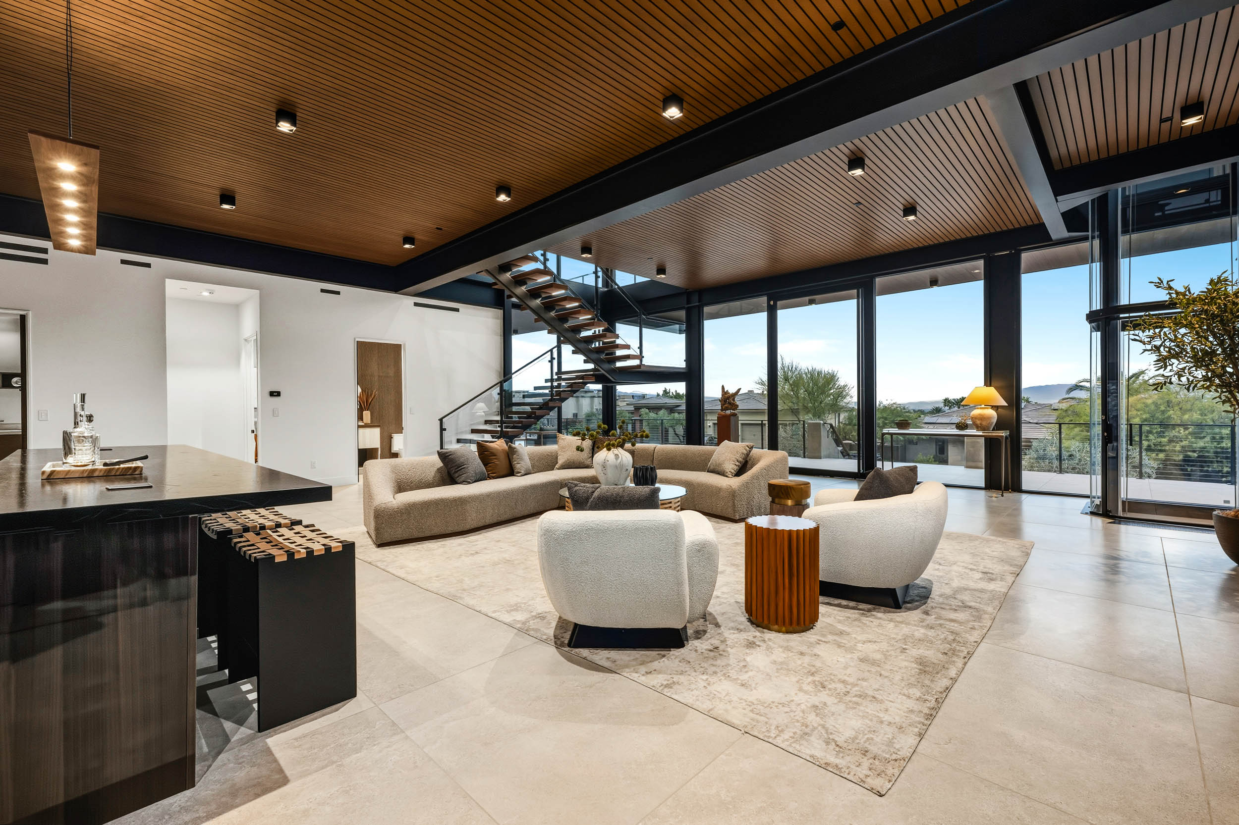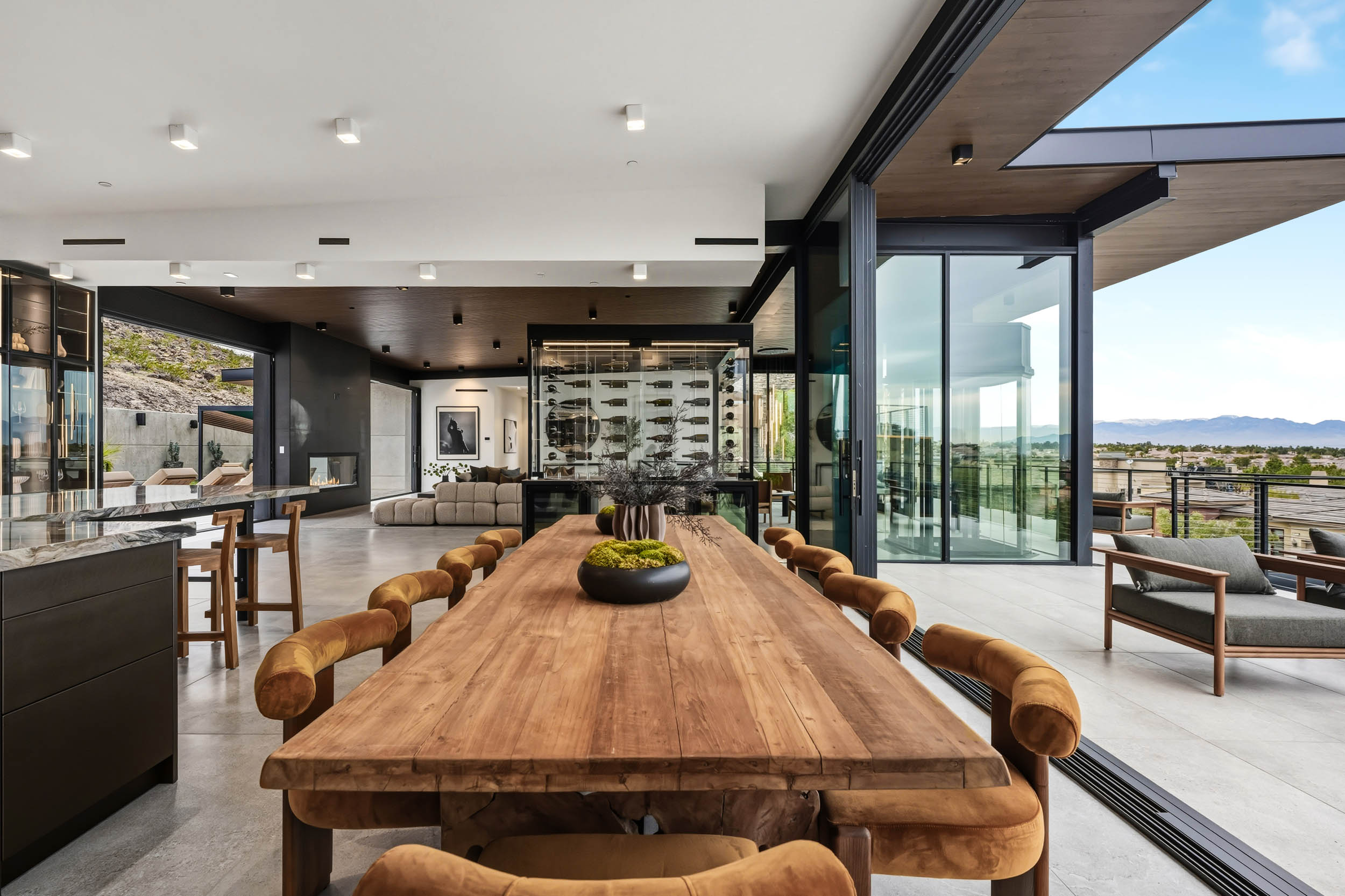 Expansive open-concept living areas are framed by 12-foot Low-E windows and doors that showcase unobstructed Strip and valley views without horizontal mullions. Working closely with Grant Design Group, the owners ensured every space was thoughtfully oriented to maximize light, views, and indoor-outdoor living. Every room, including the bedrooms, opens to outdoor experiences and vistas. The home was designed to face north, allowing the south-to-north sloping āflying roofā to shield the front of the home and its decks from direct sun while simultaneously optimizing solar exposure for maximum energy production. The propertyās location also provides rare convenience within MacDonald Highlandsājust a short walk to DragonRidge Country Club, the sports and recreation facilities, and the main entranceāeliminating the long, steep drives common throughout the community. The dramatic flying roof takes full advantage of the southern sun year-round, creating ideal conditions for comfortable outdoor seating overlooking the Strip and valley. The roof pitch accommodates an integrated solar panel system that is ultra-efficient and discreetly hidden from street and property views. Structurally, the home was engineered using poured-in-place concrete walls supported by exposed steel I-beam framing, allowing for massive clear spans of up to 35 feet. East, south, and west-facing walls utilize either structural concrete or steel framing with eight-inch-thick bonded high-density foam insulation, while all floors and ceilings are steel framed with twelve inches of fully integrated high-density foam for superior sound control and thermal efficiency. The main living level is anchored by a striking kitchen with a large center island and an integrated eight-foot dining table designed for both casual dining and entertaining. The dining and living areas are elegantly divided by a custom wine display featuring floating racks and temperature-controlled refrigerated compartments. On the south side of the living room, 10-foot glass doors open to a resort-style outdoor setting with a lap pool, spa, firepits, gazebo, and BBQ area. Powder rooms on both interior levels and by the pool provide convenience for guests without intruding on private bedroom spaces. Throughout the kitchen, bathrooms, and bar, all cabinetry is crafted by DOCA of Spain. These European-made cabinets elevate the home with sleek design, exceptional function, and a refined visual presence that naturally draws people together. The ground level features two extra-deep garages designed to accommodate large vehicles and trucks. The east garage offers two oversized parking spaces with built-in charging capability, while the west garage includes two additional oversized spaces along with two adjoining flex spaces. These versatile areas can be used for additional vehicle display, a gym, office, wine cellar, or even additional bedrooms. The landscaping thoughtfully incorporates large boulders and stone recovered from the original excavation, paired with drought-tolerant plantings and vibrant citrus trees, all maintained by automatic drip irrigation. Every element of this homeāinside and outāwas meticulously orchestrated to create a seamless, striking contemporary estate. It stands as a testament to what is possible when vision, collaboration, perseverance, and the highest-quality materials come together, resulting in a residence that is not only architecturally dramatic, but exceptionally functional, energy-efficient, and timelessly luxurious.