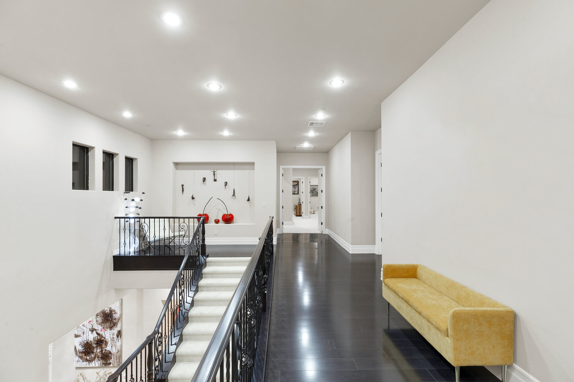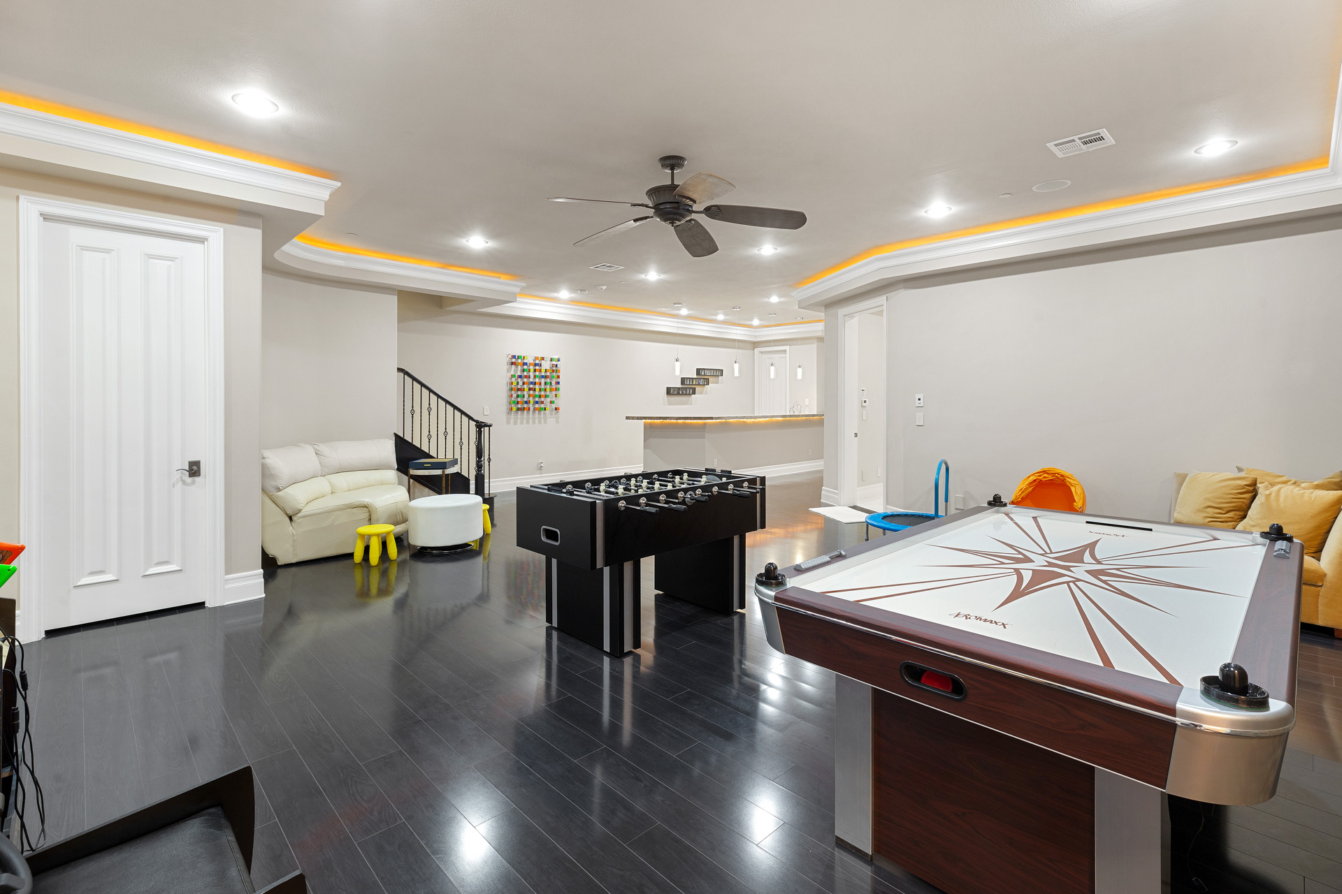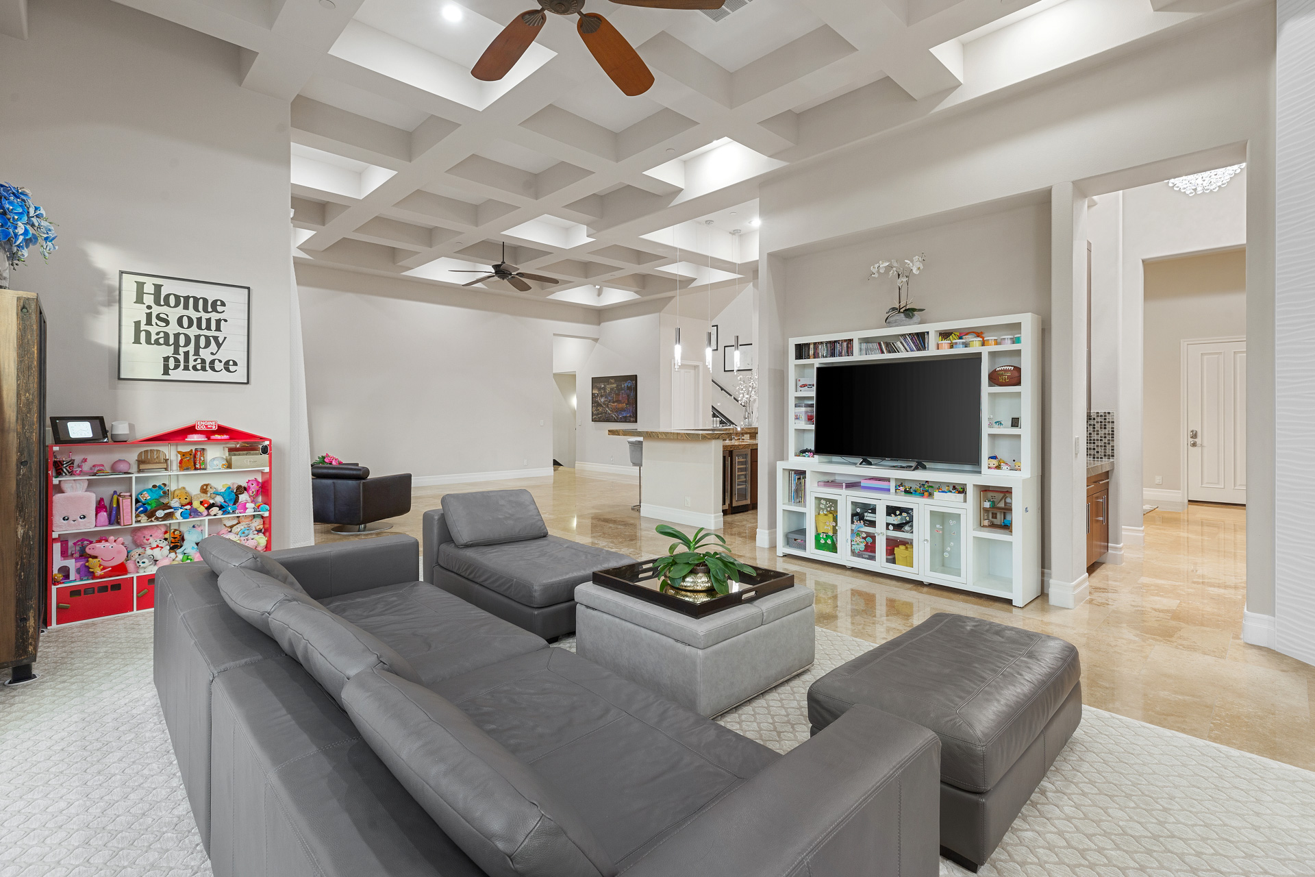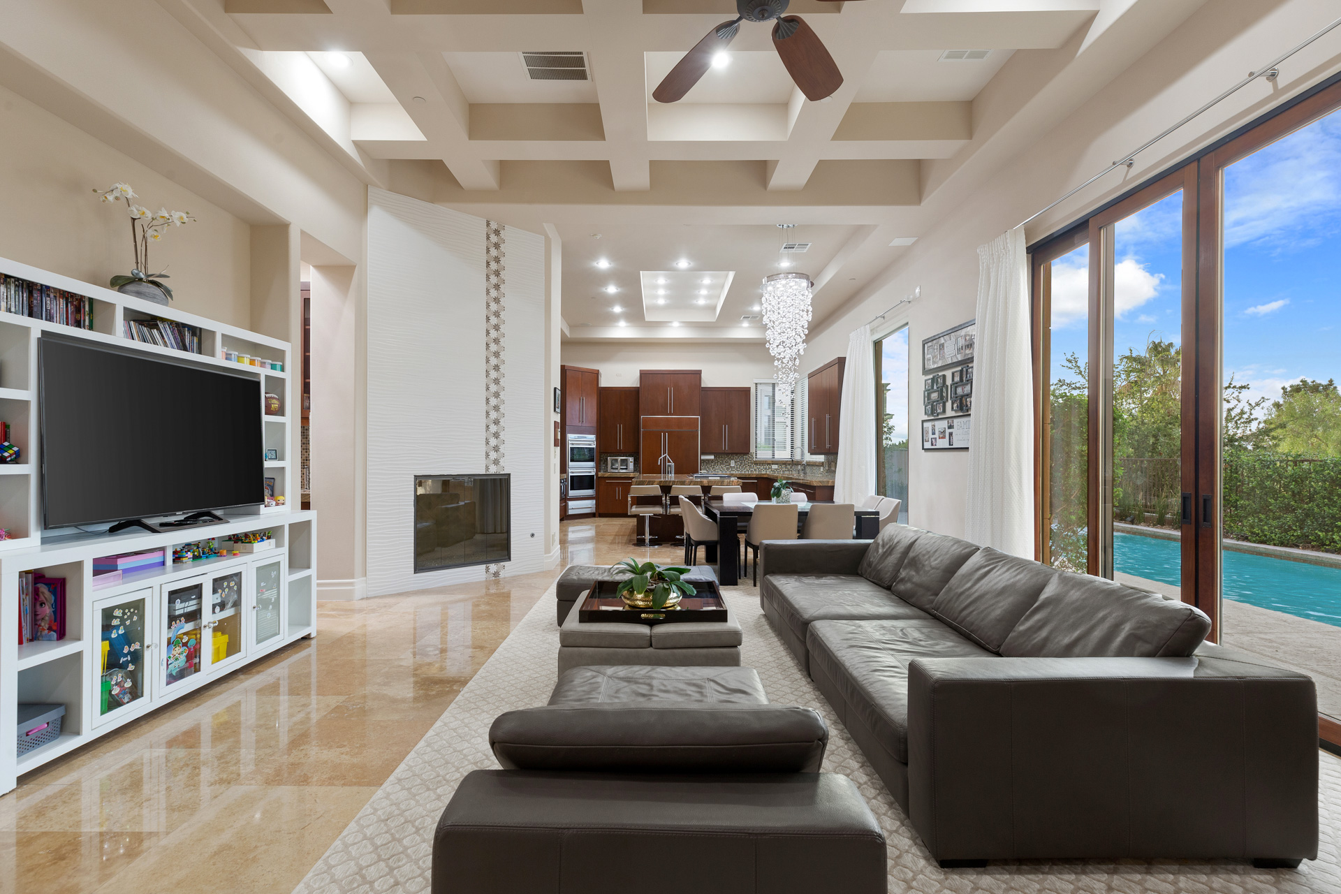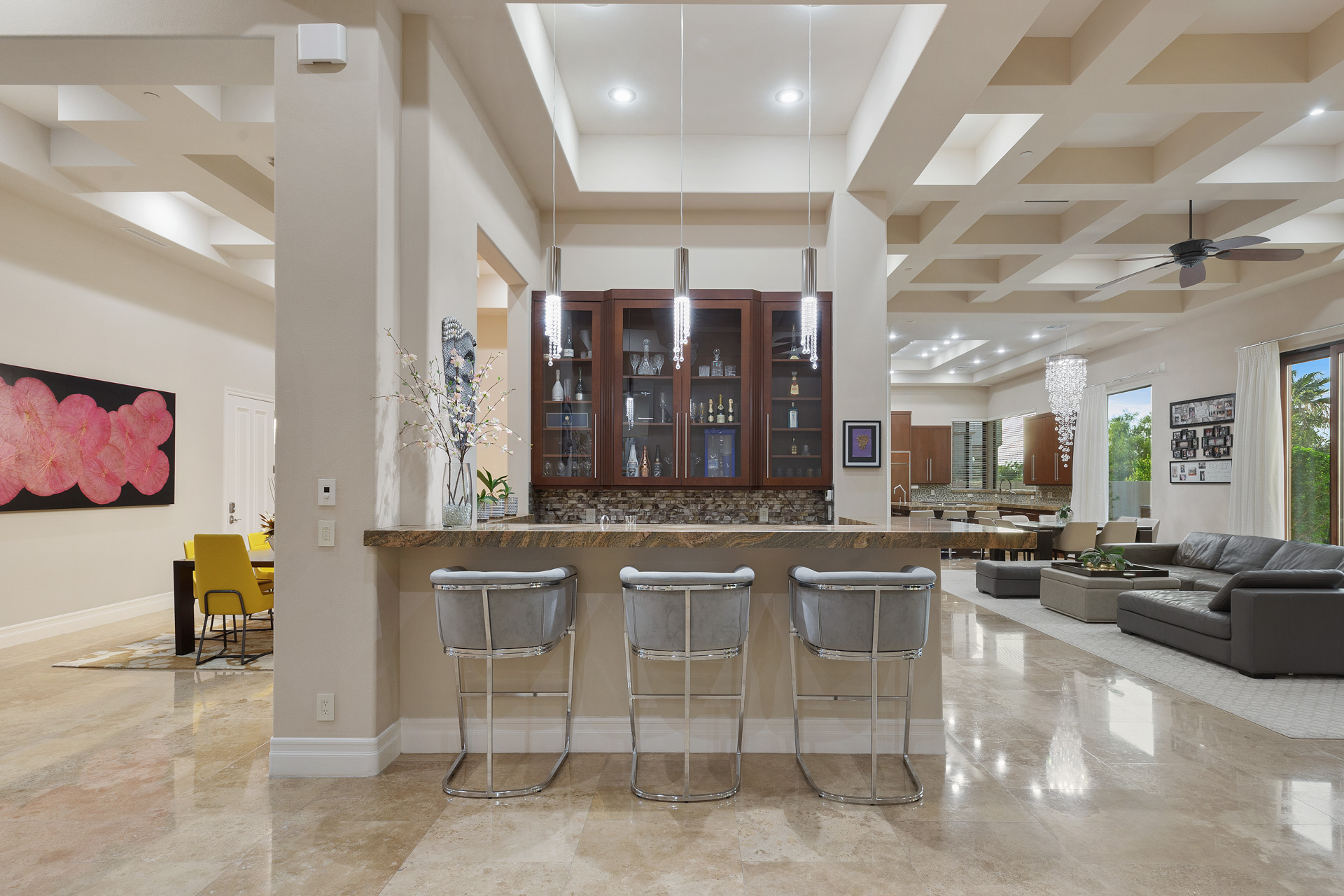 Located in the prestigious guard-gated community of Roma Hills directly across from a lush community park, this custom masterpiece is appointed with top-of-the-line finishes. With a total of 6 bedrooms, 10 bathrooms, and over 8,000 sq ft of living space, this luxurious three-story home is both grand and inviting. The foyer opens to the great room with vaulted ceilings, polished stone floors, and a large bar and seating area. Floor to ceiling glass exit doors lead to a covered patio.