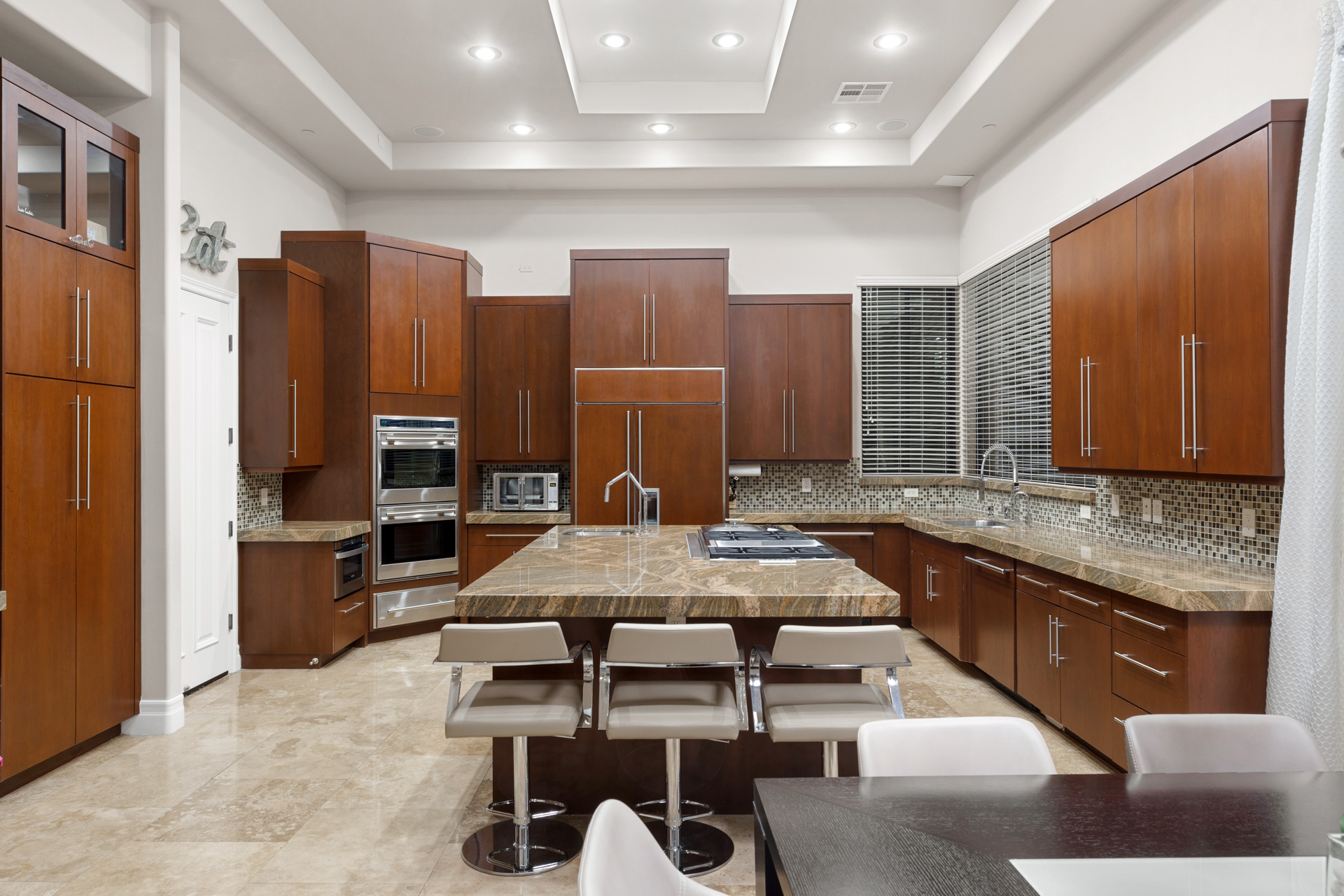 Enjoy the private backyard oasis which includes a heated pool and spa with water features, a garden, and an outdoor kitchen. The indoor kitchen boasts a large breakfast nook which opens to the chefās style kitchen featuring an oversized center island with gourmet cooktop, inset warming stations, dual ovens and sinks, and bar seating. A first-floor bedroom guest suite and spacious office complete with fireplaces complete the main level.