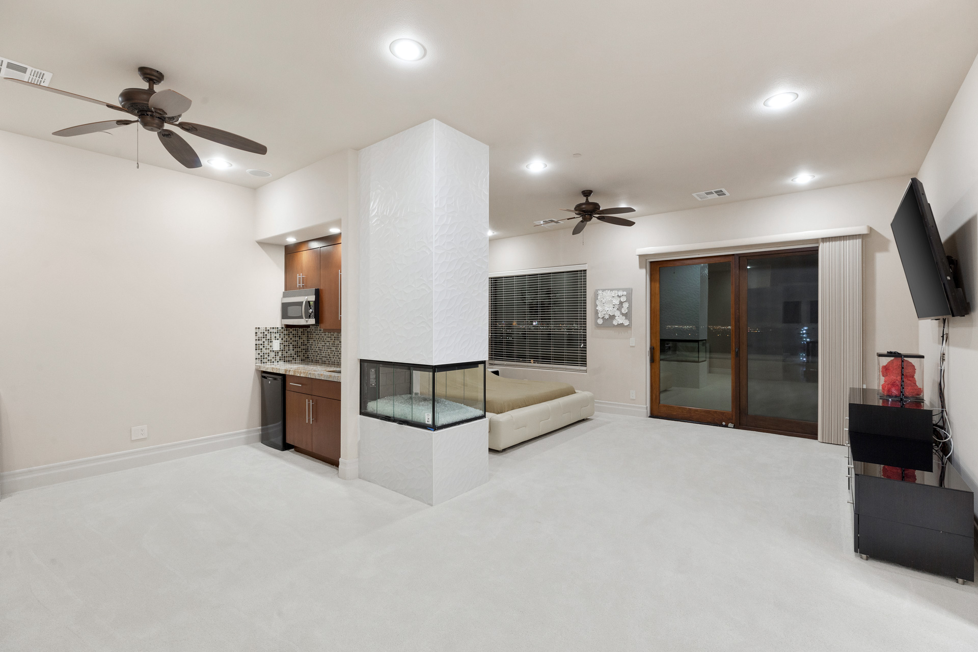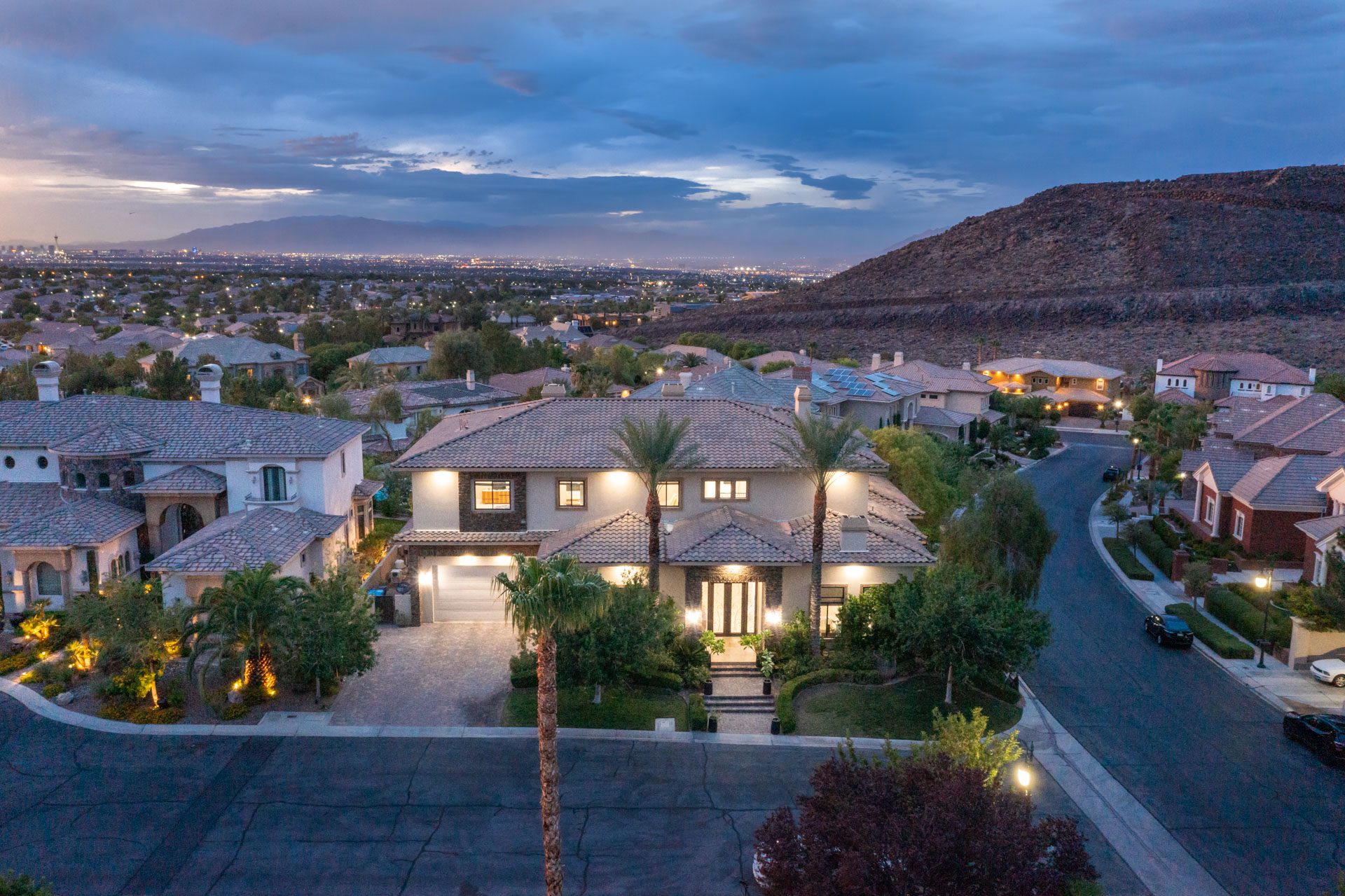 The lower level houses a large recreation space, gym, theatre, wet bar, temperature controlled wine cellar, and bedroom. Upstairs, the master suite provides a tranquil escape with a sitting room, fireplace, and private balcony with stunning Strip views! A second-floor family room is surrounded by three bedrooms, each with walk in closets and en suite bathrooms. An elevator provides easy access to all three levels. This home truly has it all, with convenient access to the 215 Beltway, Airports, Shopping, Dining, and More!