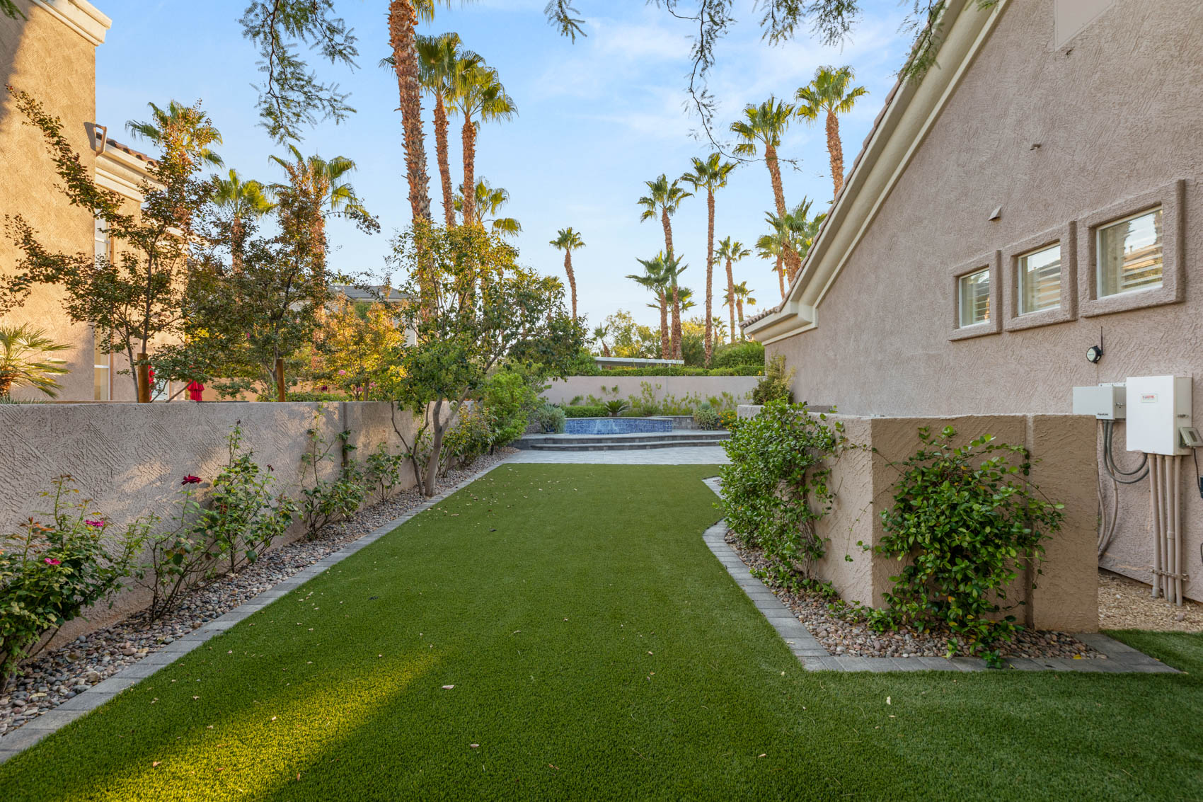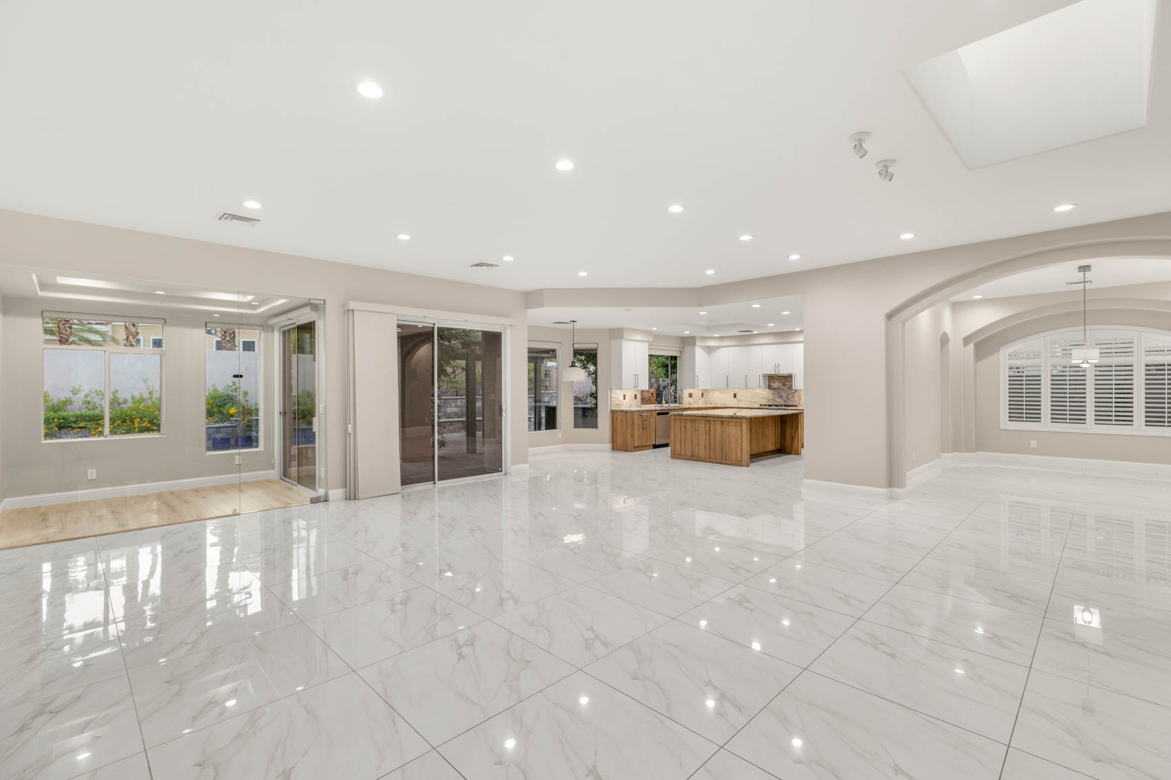 Discover this beautifully renovated modern home in one of Summerlinās most prestigious guard-gated communities. A grand double-door entry opens to a spacious family room with soaring ceilings, sleek wet bar, and seamless flow into the chefās kitchen with large island, custom cabinetry, Monogram appliances, wine fridge, skylight, and garden window. A private glass-walled office creates the perfect work-from-home retreat.