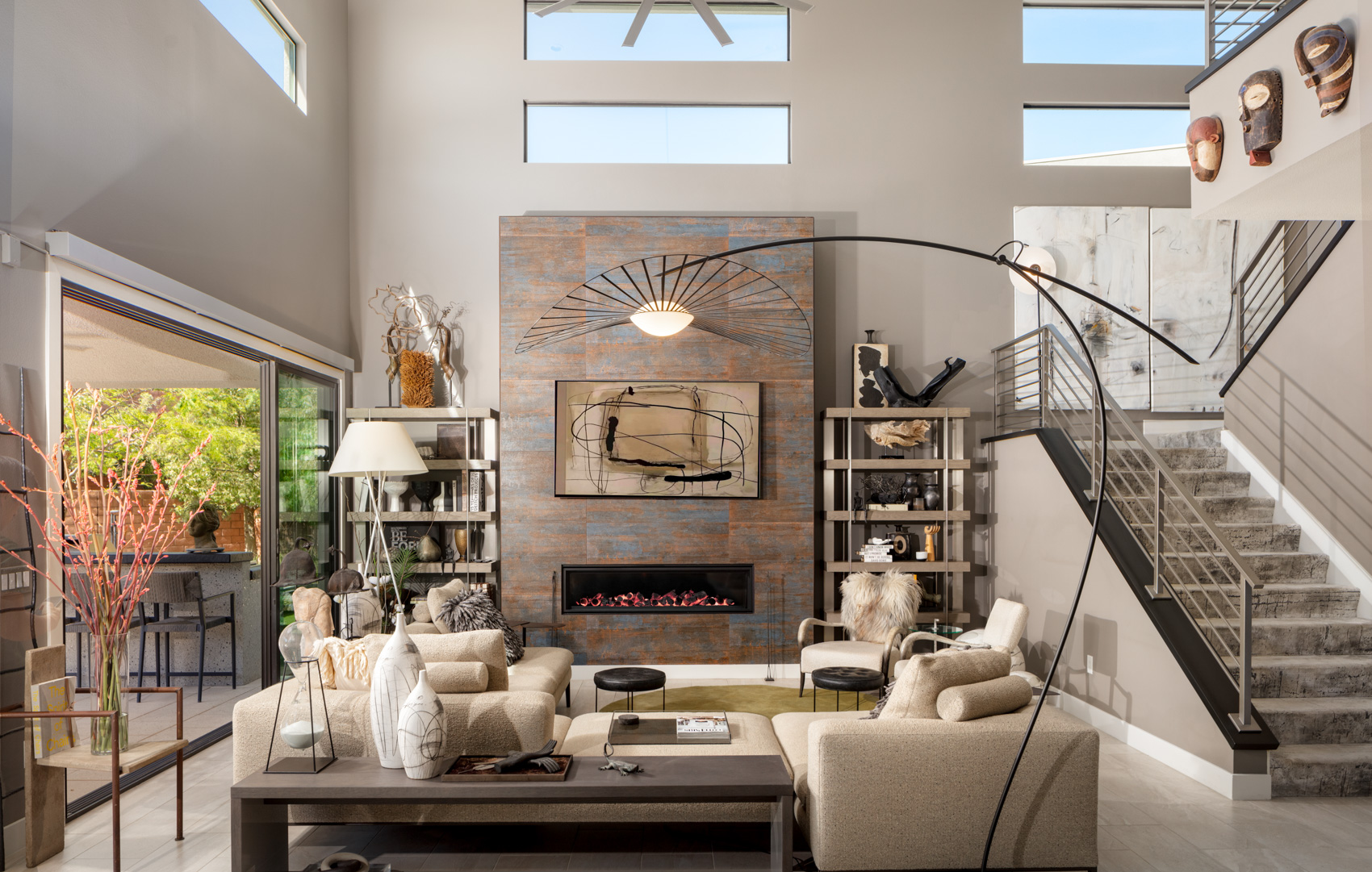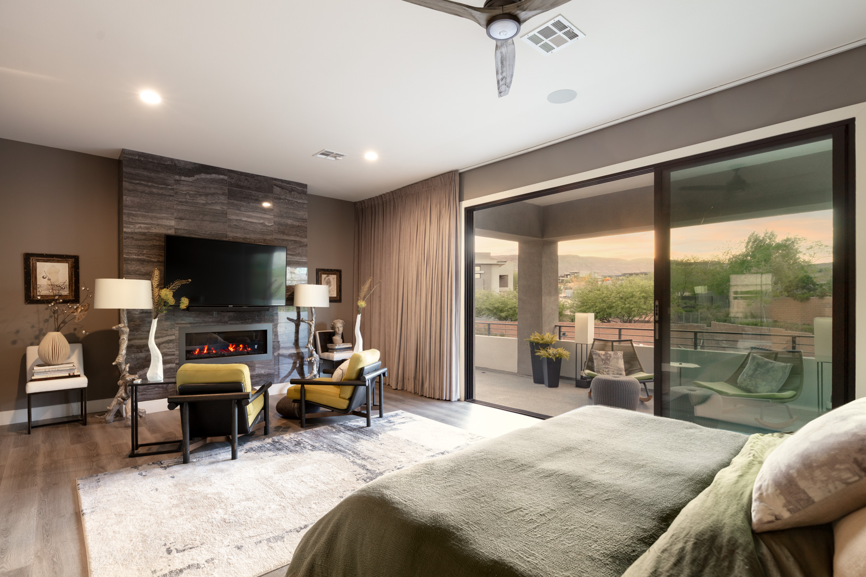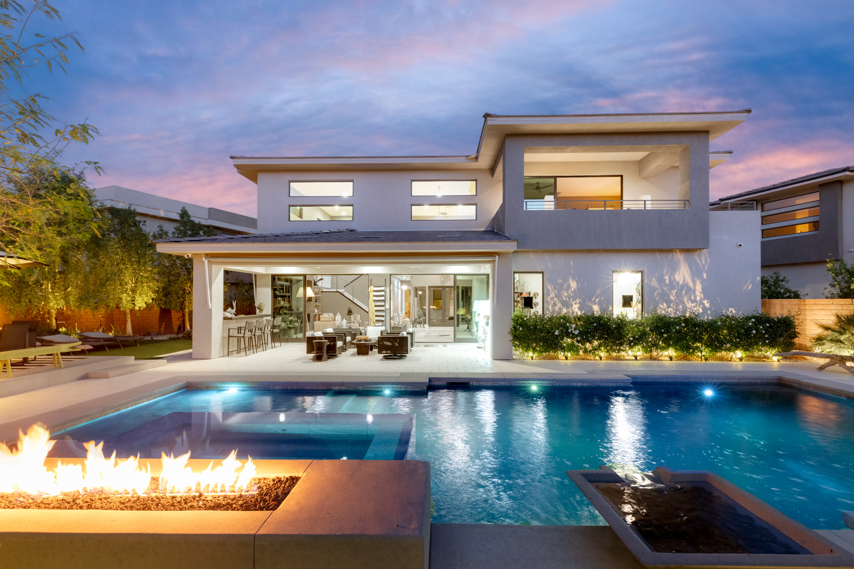 The kitchen is both functional and striking, appointed with high-end stainless-steel appliances, custom cabinetry, and a generous island that serves as a central gathering space for everyday living and entertaining alike. Supporting spaces—including a well-equipped pantry, laundry room with ample storage, and a three-car tandem garage with built-in cabinetry—enhance the home’s livability. The upper-level primary suite is a true sanctuary, occupying its own private level for added comfort and privacy. This retreat features a fireplace, a spacious sitting area, and a custom-designed walk-in closet. The spa-inspired bath has been thoughtfully finished with luxurious materials, creating a calming, resort-like atmosphere. Secondary bedrooms are generously sized and well-appointed, each offering en-suite baths and walk-in closets, ideal for accommodating guests or family with ease. Outdoors, the home transforms into a private resort setting designed for both relaxation and entertaining. The backyard features a beautifully designed pool and spa, complemented by dual fire features that add warmth and ambiance. Multiple lounge and dining areas provide flexibility for gatherings of any size, while the outdoor kitchen enhances the experience of al fresco living. Lush landscaping surrounds the space, and recently added ambient lighting creates a striking atmosphere into the evening hours. Additional highlights include a full security system with cameras and alarms, whole-home water softening, and reverse osmosis, contributing to both comfort and peace of mind. Blending modern design with thoughtful functionality, this exceptional residence offers a polished and private lifestyle within one of Las Vegas’ most sought-after communities.