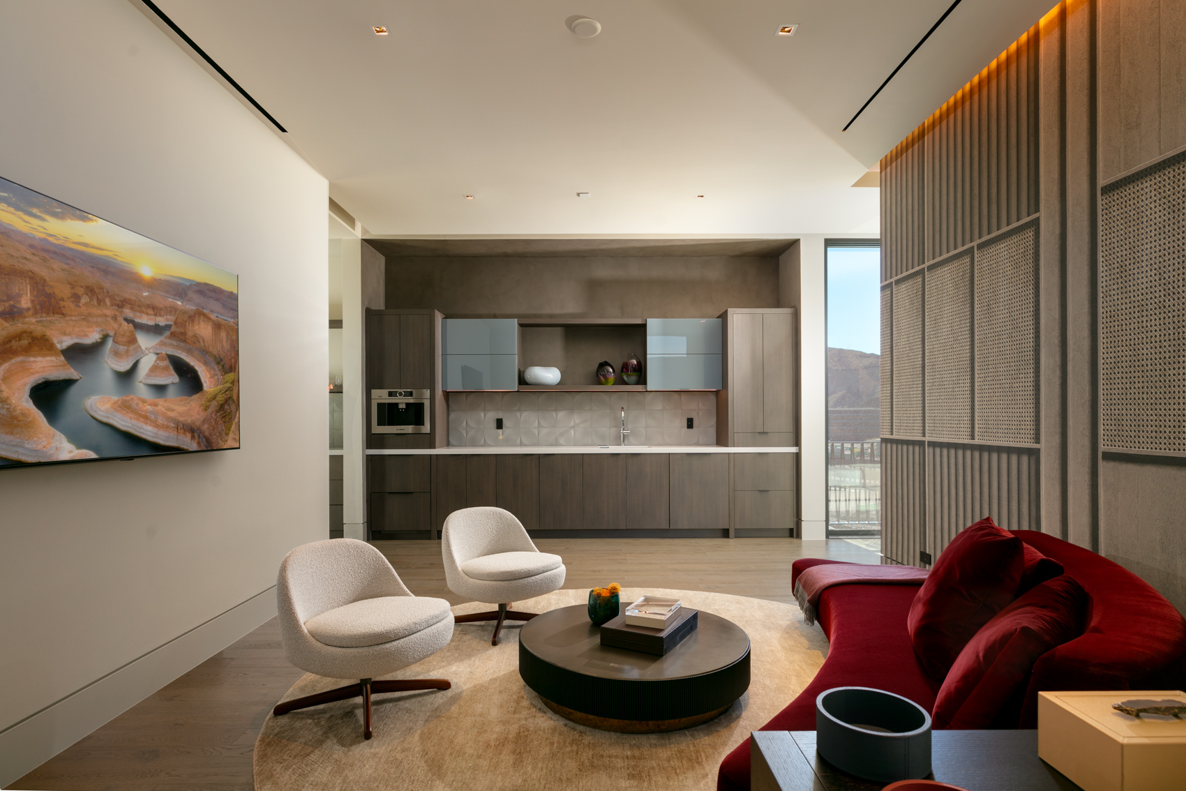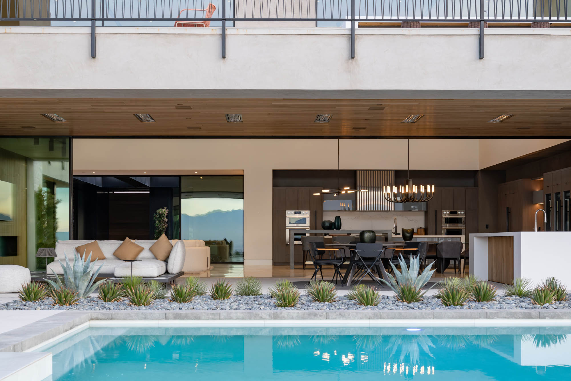 As you approach the residence, an oversized pivoting front door welcomes you into a world of elegance and sophistication. The interior unfolds with an abundance of natural light, seamlessly merging the indoor and outdoor spaces through sliding pocket doors. The result is a home that feels not just connected to nature but harmoniously integrated with its surroundings.