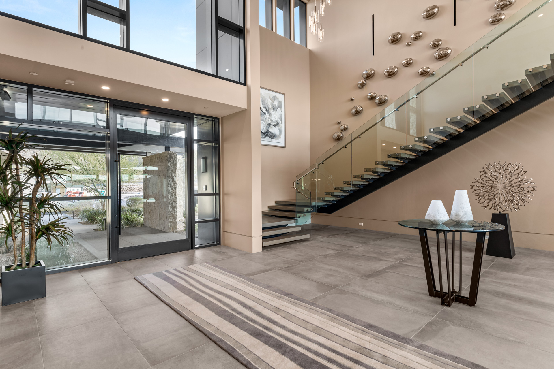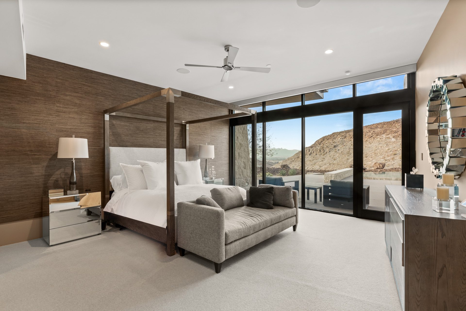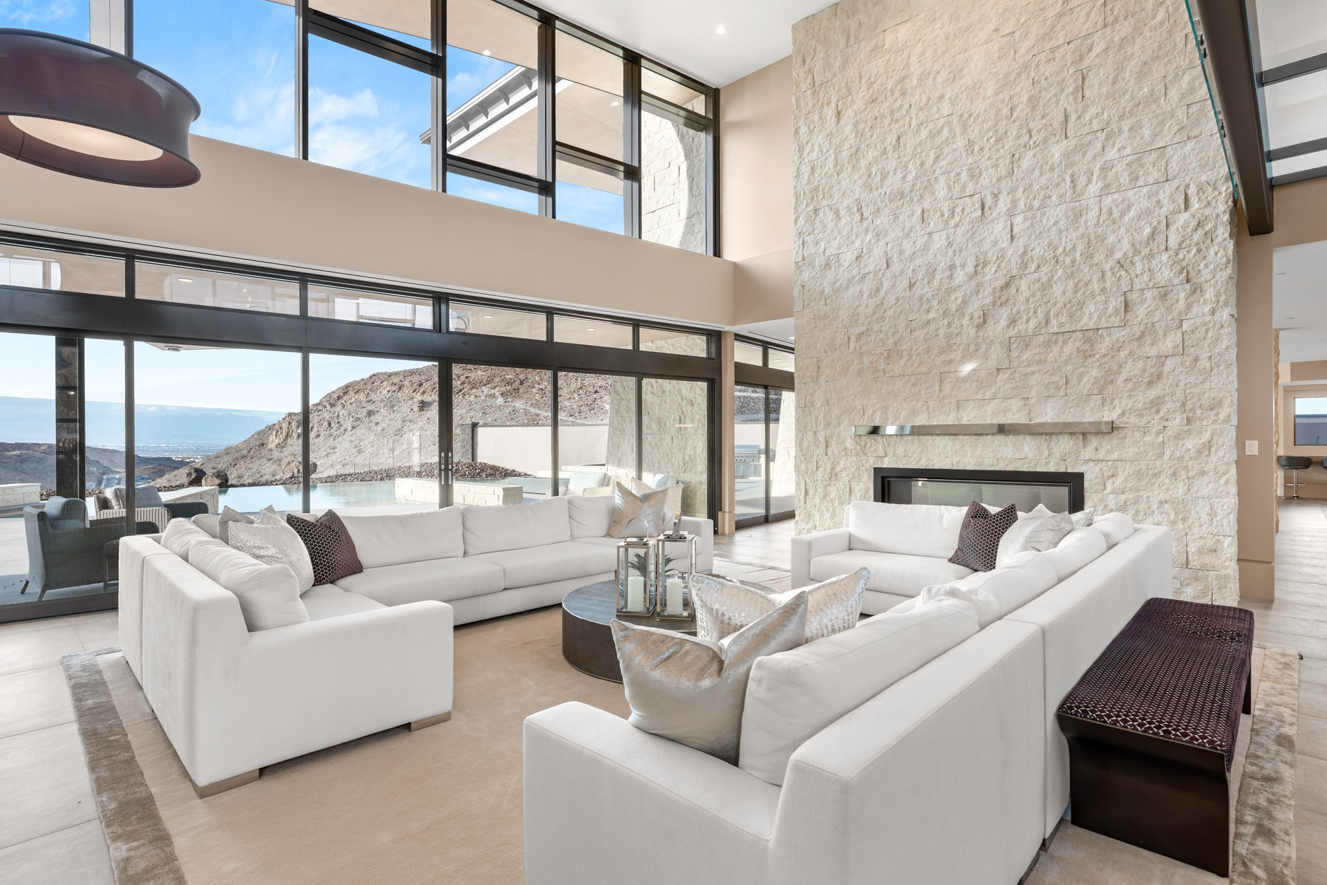 Walk through the large pivot door into this gorgeous estate and be instantly transported into a space adorned with natural stone and organic elements. The neutral tones permeating the home, and the floor to ceiling windows, provide a spacious, open feeling of illumination. No detail in quality or design was overlooked, from the elegant light features, sophisticated double-sided fireplace, multiple upstairs balconies, to the built-in wine room and inviting indoor and outdoor living spaces. Even the staircase and upstairs catwalk showcase the theme of light, transparency, and illusion, as they are framed in glass and give the appearance of floating.
