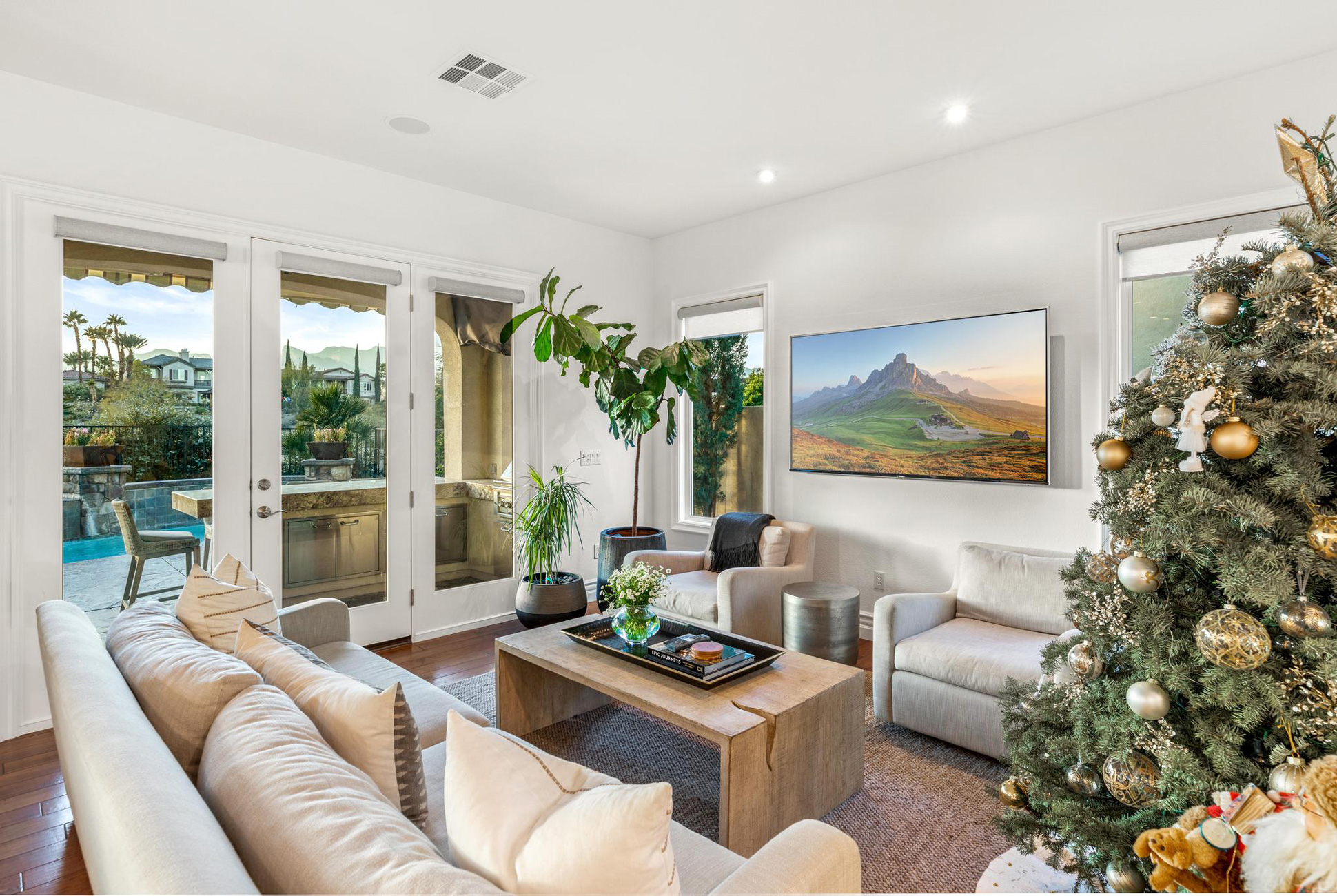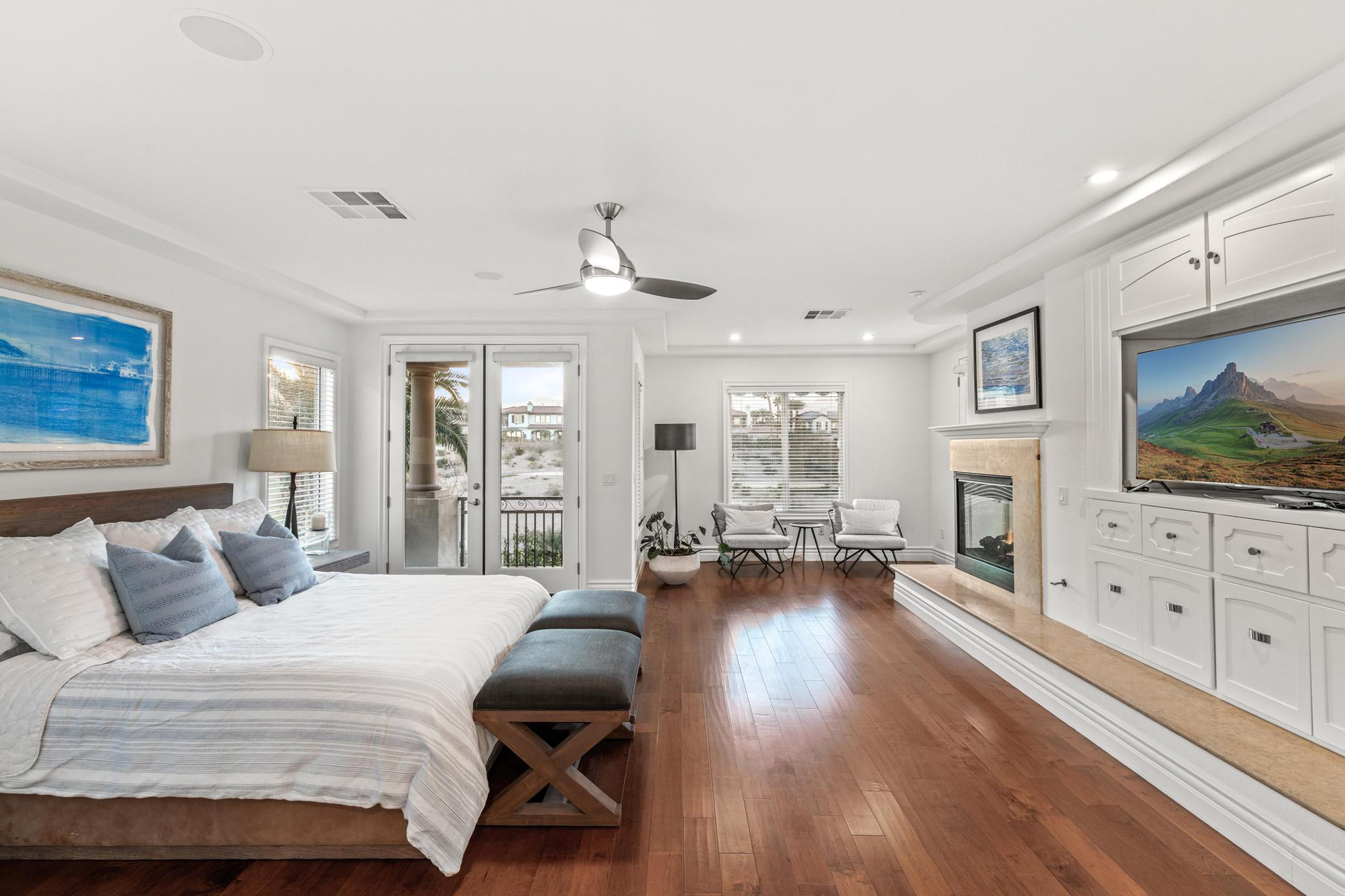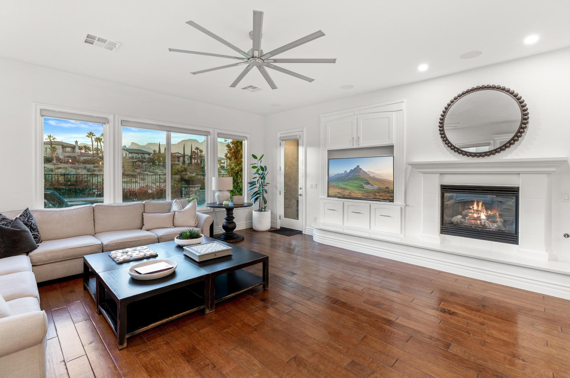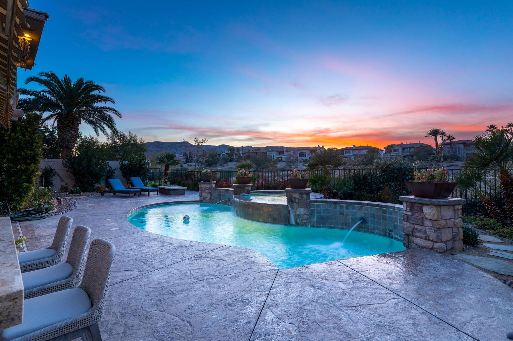 Upstairs, the possibilities are endless with an oversized loft, bar, and a balcony overlooking the backyard. The expansive primary suite features a fireplace and spa-like bath complete with separate his and her vanities, closets, and a central jetted tub. Out back, the beauty continues with unobstructed views of the stunning golf course and red rock mountains, a built-in outdoor kitchen, fire pit, pool & spa - the perfect place to entertain, play and relax.