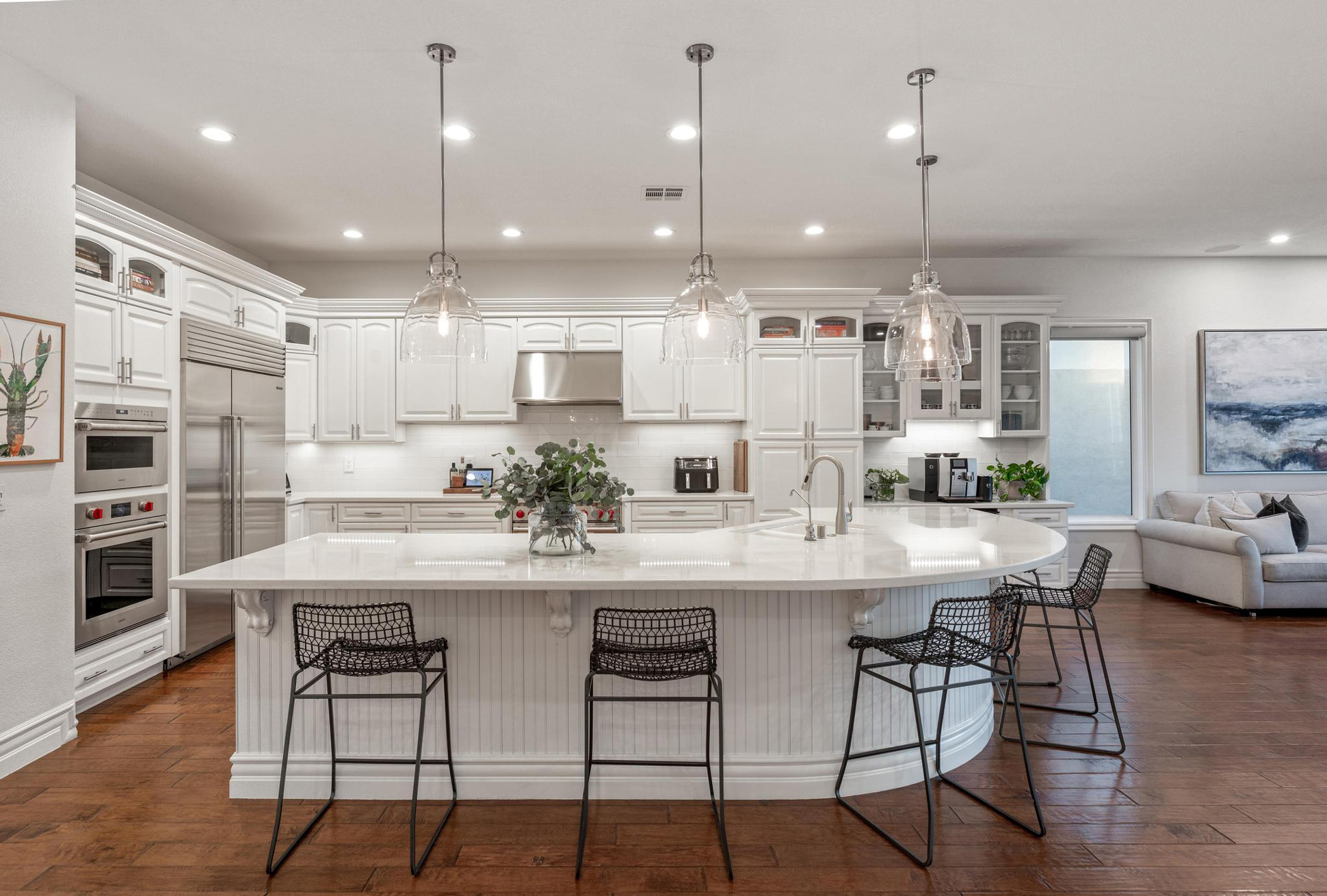 The perfect place to relax or entertain, the property exudes a timeless and classic aesthetic with its hard wood flooring, upgraded white cabinetry, and designer light fixtures throughout. The heart of the home, the gorgeous kitchen, features brand new top of the line appliances and an oversized island perfect for cooking and gathering with friends and family.