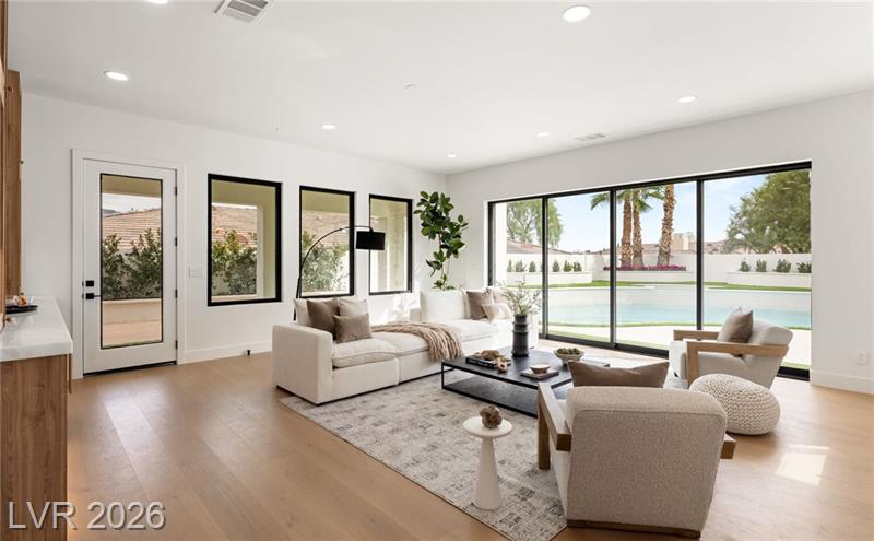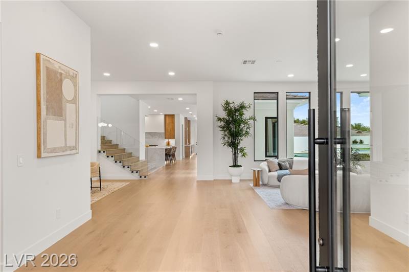 A truly reimagined luxury masterpiece in the Palisades, one of Summerlin’s most coveted guard-gated communities known for its tree-lined streets, sidewalks, and unbeatable proximity to top-rated schools, premier dining, and world-class shopping. Tucked in an intimate seven-home cul-de-sac, this custom estate has been transformed with the finest materials: Level-5 smooth interiors, European cabinetry, hand-selected White Rhino marble, leathered Taj Mahal quartzite, engineered hardwood flooring, custom glasswork, and Miele appliances.