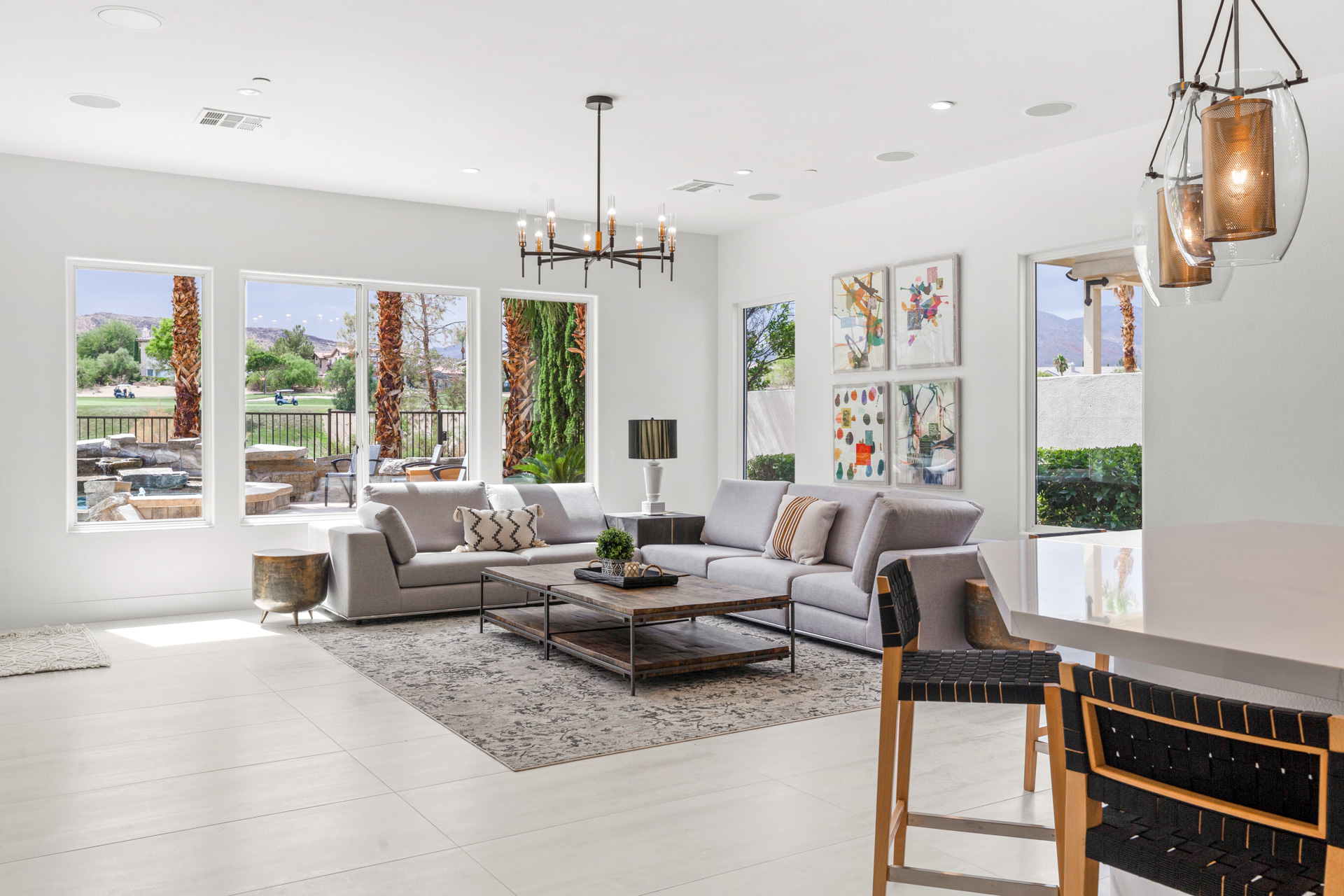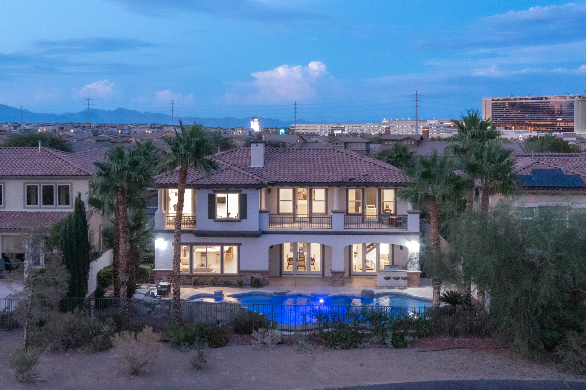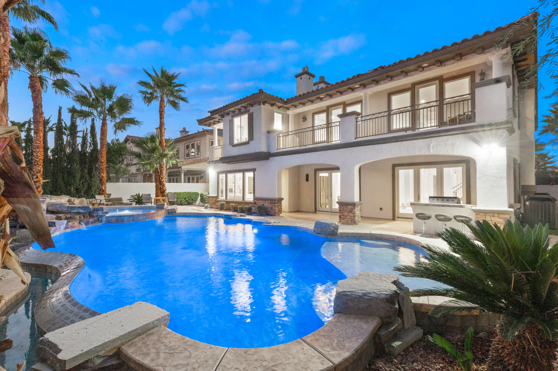 Another great room space includes a chefās style commercial-grade kitchen complete with a six-burner cooktop with grill, farmhouse sink, sub-zero refrigerator/freezer units and large, wrap-around island with bar seating, and a family room with a wall of windows with the golf course and mesa ridge views that exits to the covered patio. A bedroom with a private bath and a three-car garage with resin flooring complete the first floor. The upstairs houses a recreation room with wet bar and island that exits to a second-floor balcony overlooking the pool, golf course, and mountains beyond. The master suite includes a sitting area, fireplace, private, covered balcony, boasting course and mesa views, and bath with soaking tub, walk-in shower, and walk-in custom closet. Two additional bedrooms on the second floor include private baths. The casita includes a guest room, complete with bath and closet, that opens to the interior courtyard. Outside, enjoy resort-style living with a multi-level pool complete with hot tub and fountain, as well as multi-level seating areas. An outdoor kitchen with bar seating is tucked under the covered patio completing the year-round desert living experience. This neighborhood in the Red Rock Country Club is a 24-hour guard gated dual golf course community on the western border of Summerlin. Nestled against the breathtaking Red Rock Canyon National Conservation Area, this community is one of the most notable retail and residential communities in the Las Vegas area.