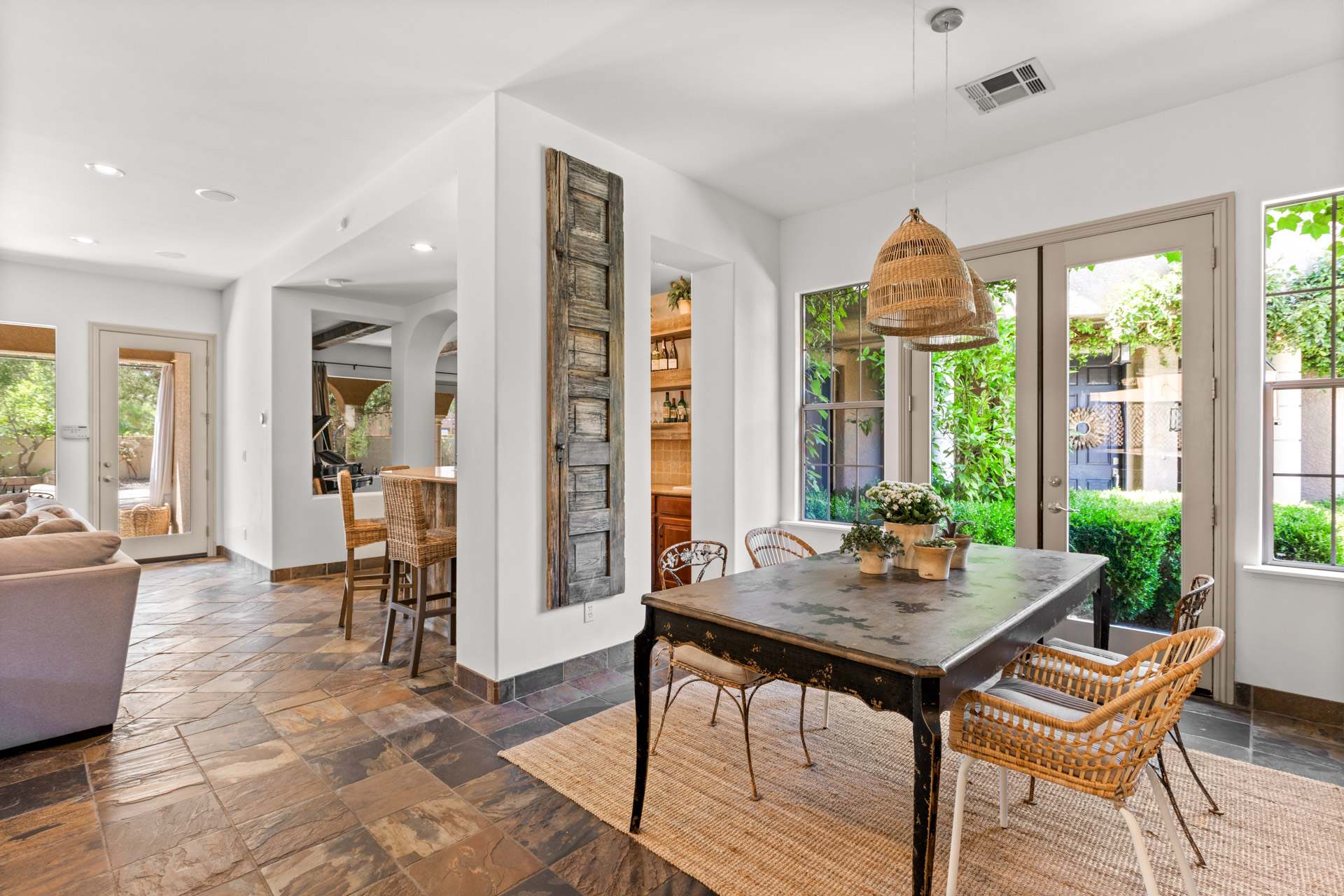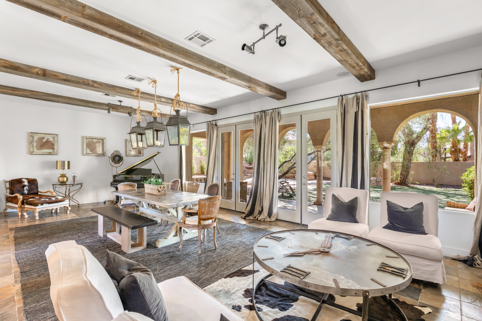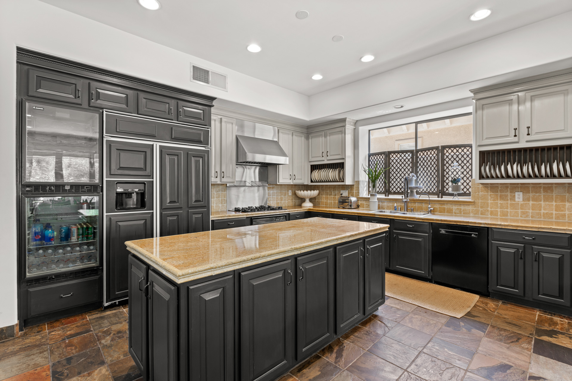 The open floor plan of the home's main level includes a colonnaded great room with rugged ceiling beams, a massive stone fireplace, and three sets of French doors leading to an arched colonnaded patio. A spacious family den adjoining the kitchen has built-in bookcases and another impressive fireplace and features a wall of glass that overlooks a charming lagoon pool. The kitchen's blend of golden-tone tile and solid surface counters with charcoal-painted cabinetry is uniquely appealing and designed for entertaining as well as informal dining. Nearby is a spacious wet bar.