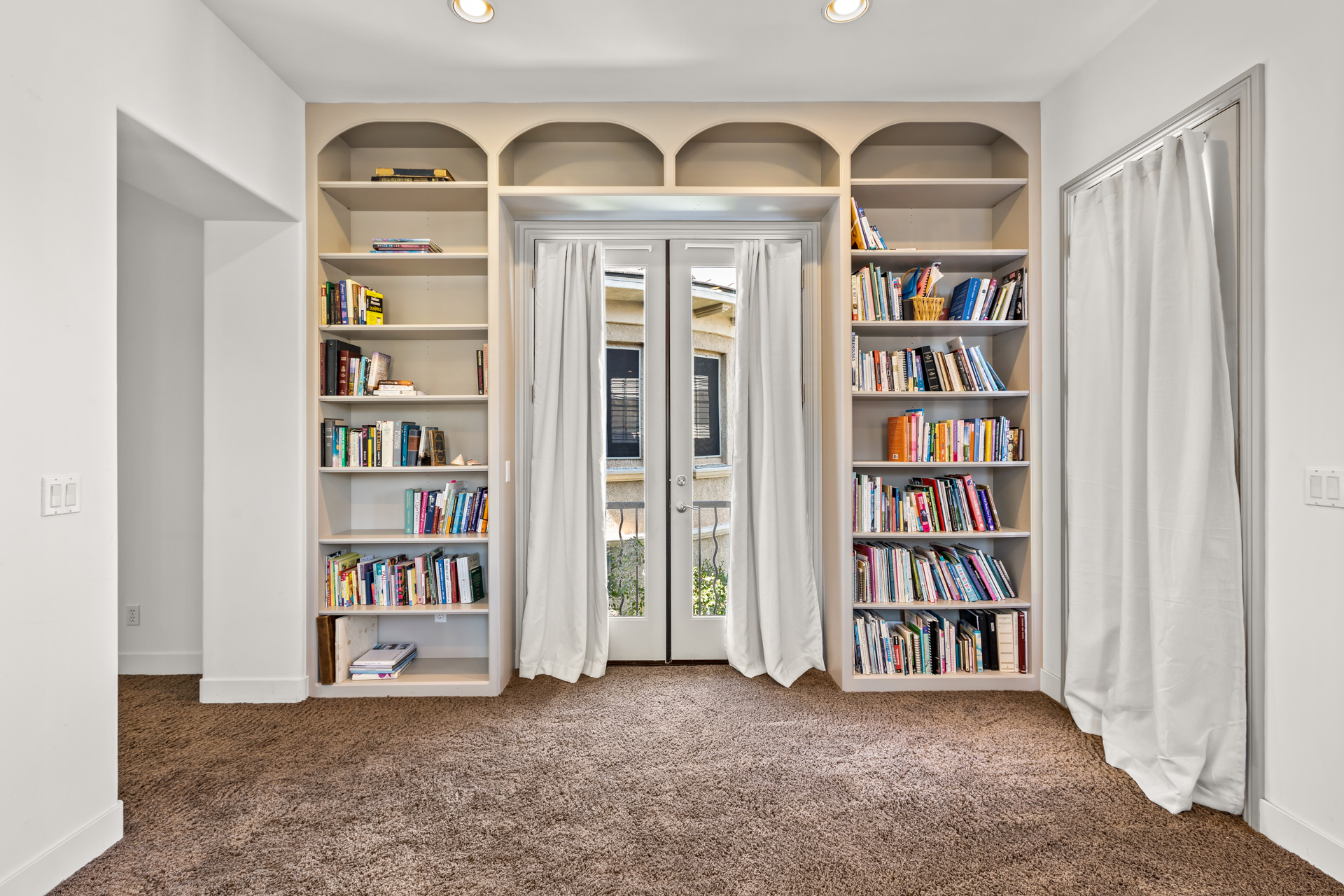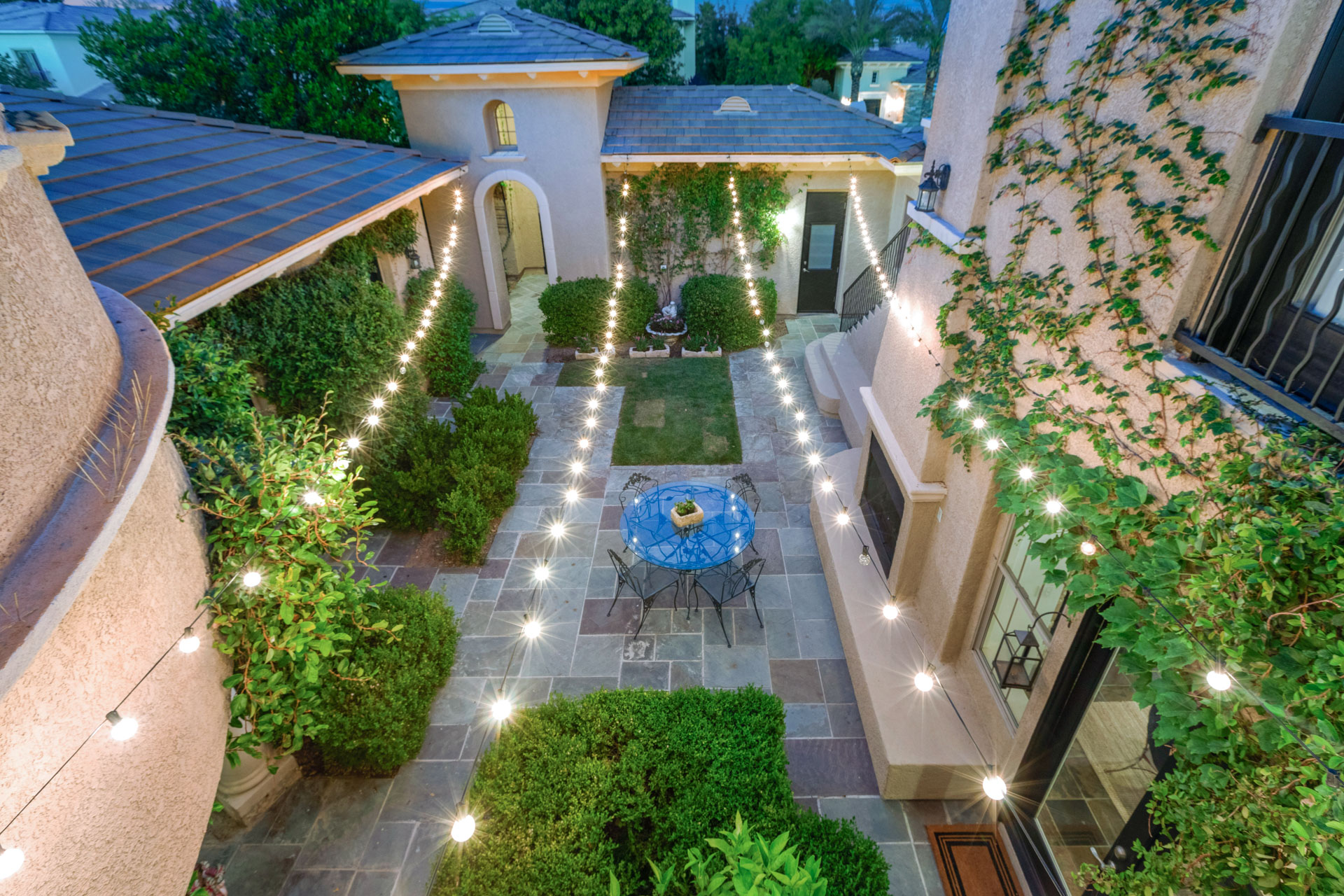 A bedroom with an ensuite bath is located off the entry, while a half bath and comfortable den/office space are situated half a level up. Continue on up the elegant circular staircase to reach the owners' immense two-level bedroom with its own gas fireplace. It boasts a separate sitting area with a small balcony overlooking the entry courtyard. The master bath is a dream space, with dual vanities plus a make-up counter, a huge walk-in closet/dressing room, an oval soaking tub, and a separate shower. The suite also features a covered balcony that overlooks the rear yard. Another half-level up is another bedroom suite, also with an ensuite bath, a small sitting area, and two closets. A private guest bedroom with an ensuite bath is reached via an outside staircase from the private entry courtyard. This well-planned home has four bedrooms, five baths, and garage parking for three vehicles.