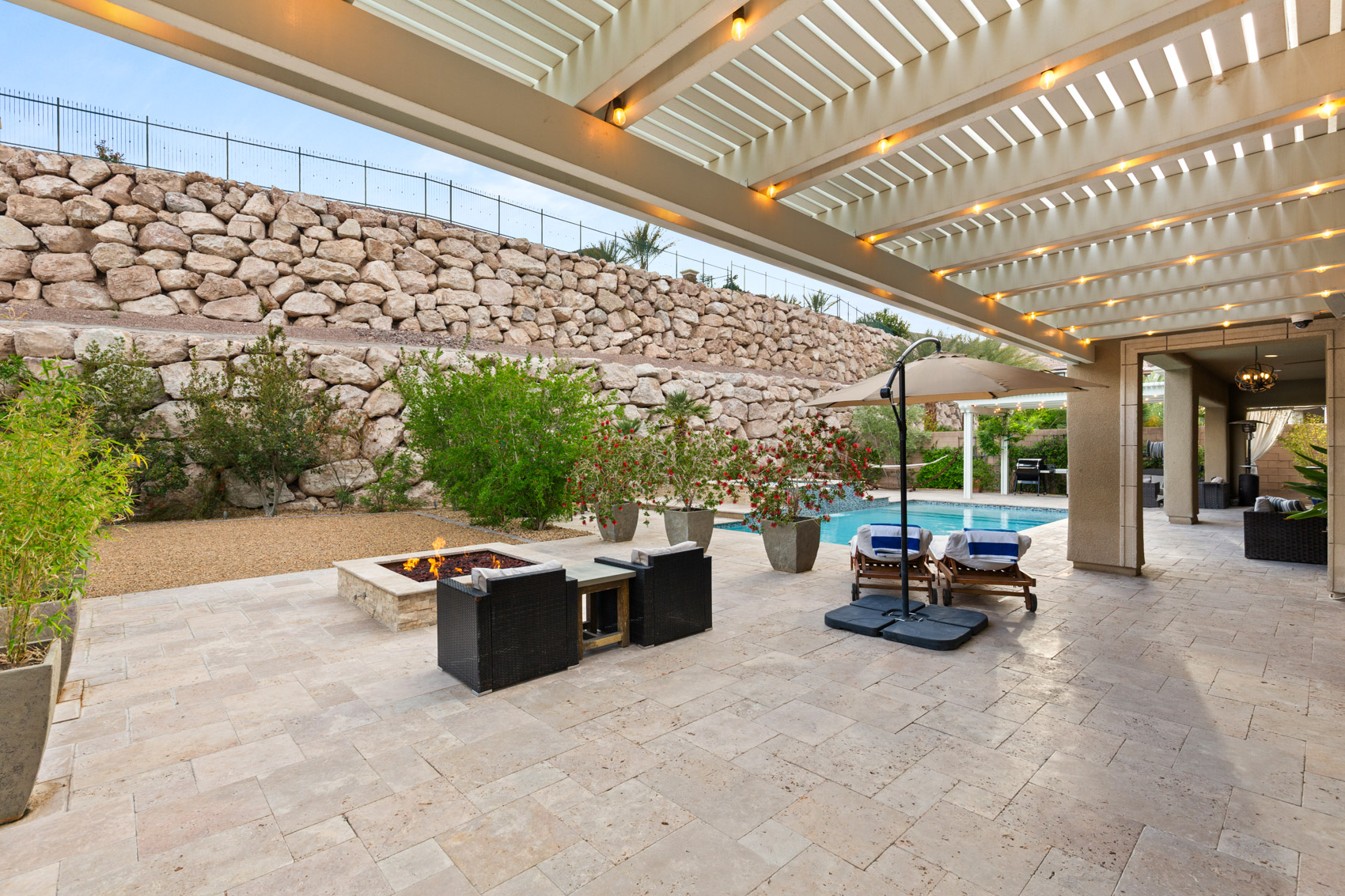 Welcome to your stunning sanctuary in double-gated Southern Highlands Golf Club. This warm contemporary single-story home offers the perfect blend of modern luxury and serene privacy. The oversized outdoor area features a sparkling pool and spa, covered patio adjacent to great room, dual pergola areas, a firepit, raised garden beds, and lush trees.