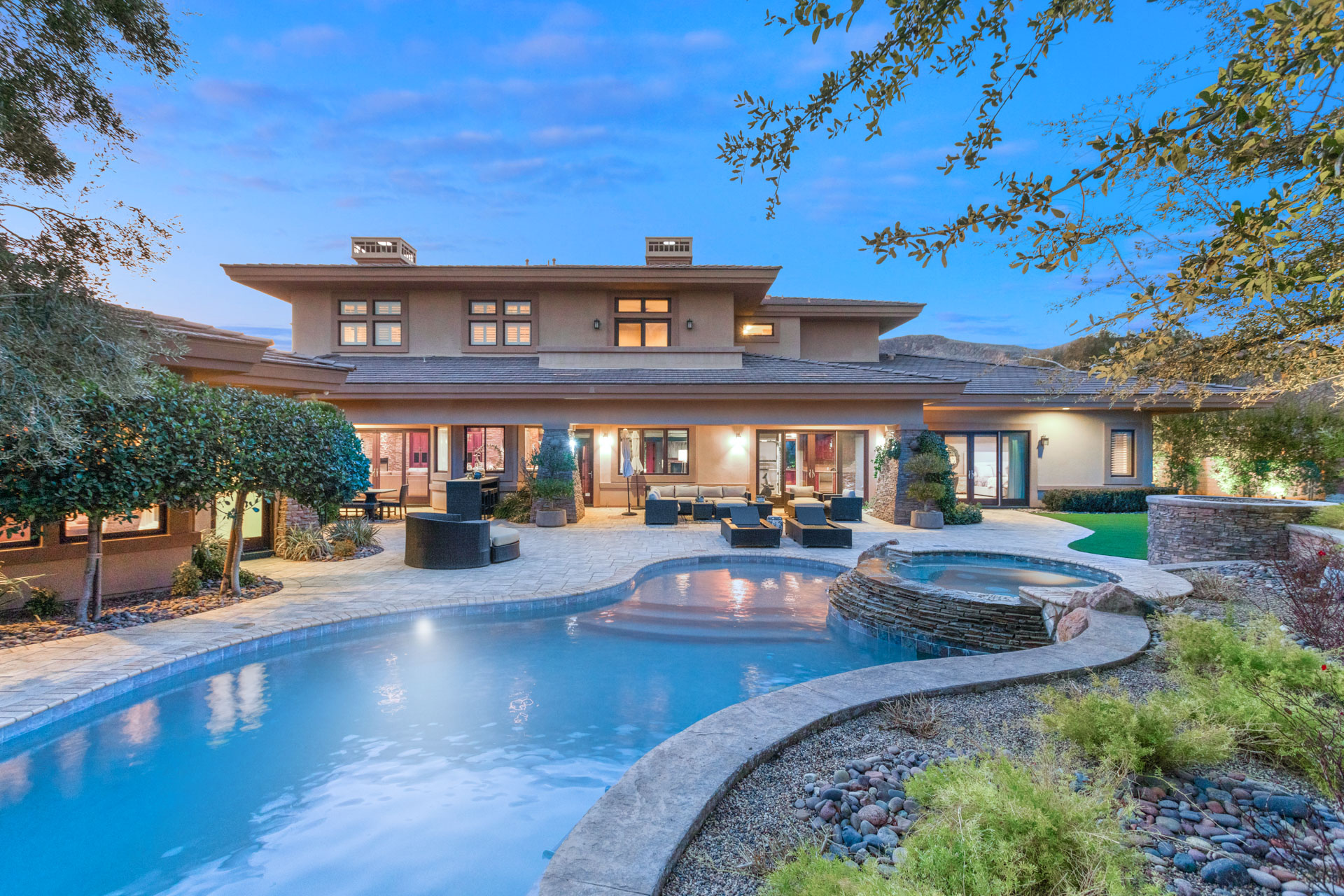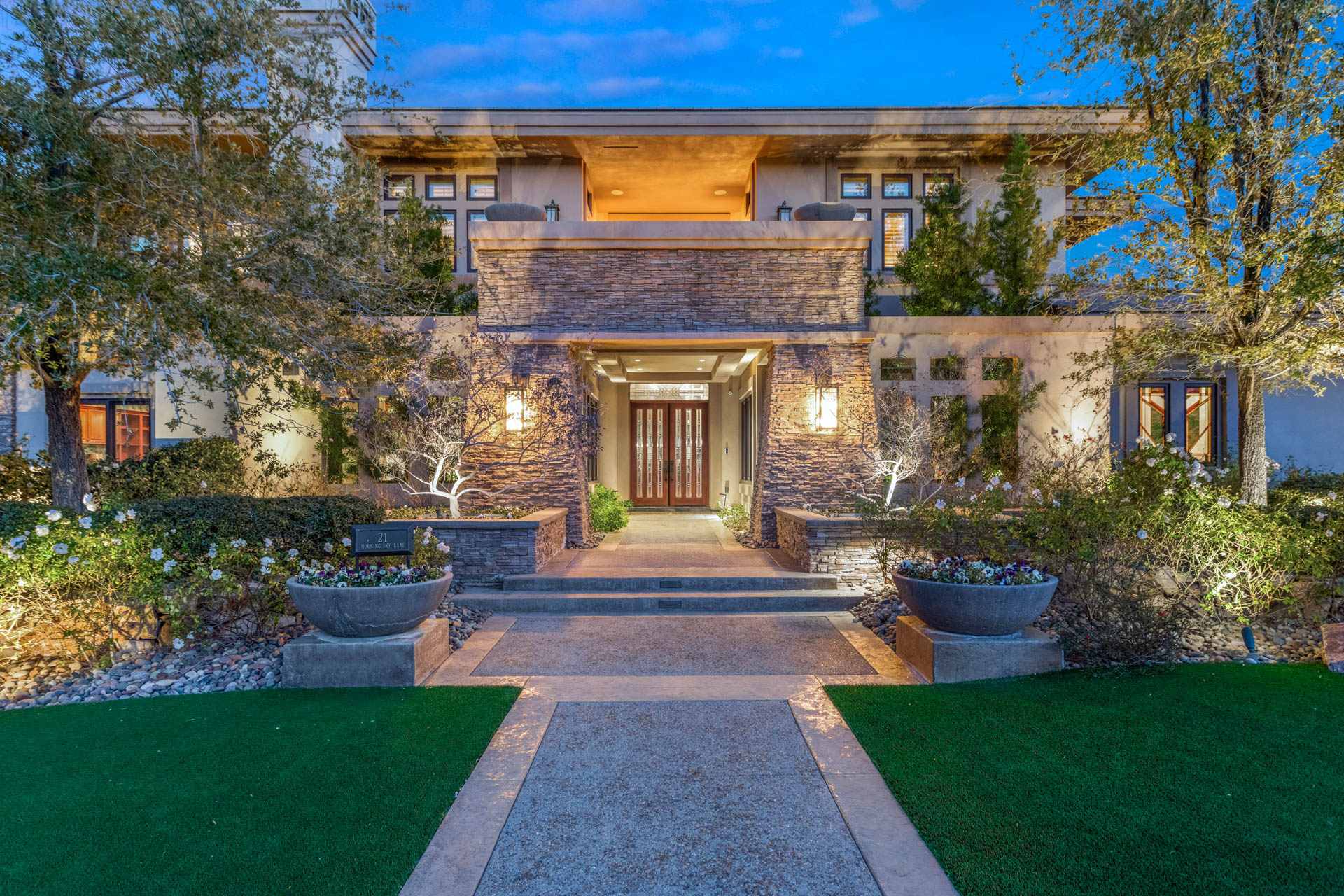 Welcome to your mountain modern masterpiece in The Ridges of Summerlin! This stunning Frank Llyod Wright-inspired custom home within Promontory offers 7,675 square feet of functional and luxurious living space on a lushly landscaped lot.