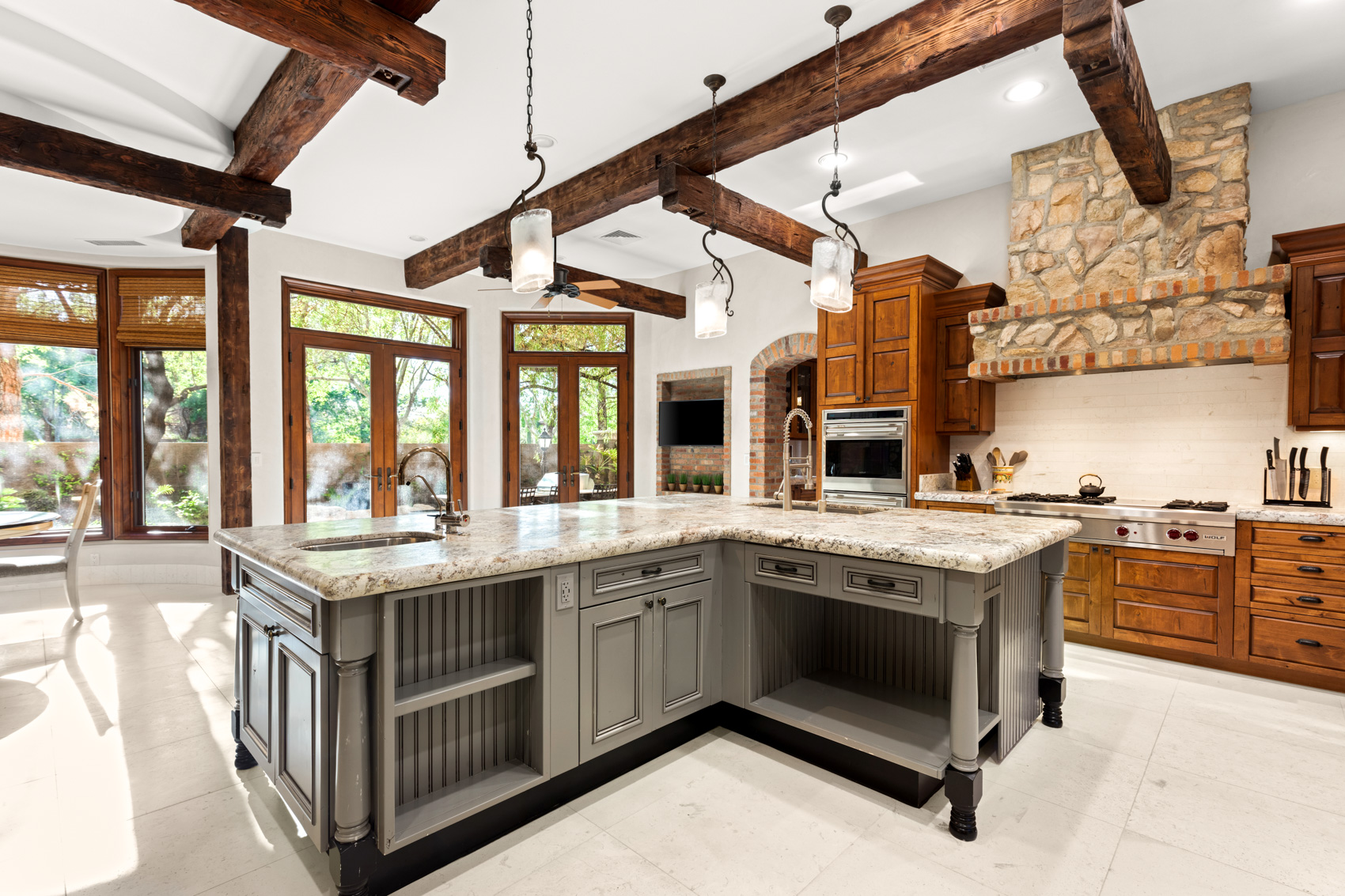 Upstairs offers 3 bedrooms and an executive office. The perfect home for large events or intimate gatherings. Unique and custom details include extensive millwork, hand carved beams, limestone flooring, exceptional fixtures and textures throughout. Ideally positioned on a private corner homesite with a generous driveway leading to an oversized 5 car garage, this home is just steps away from the golf clubhouse.