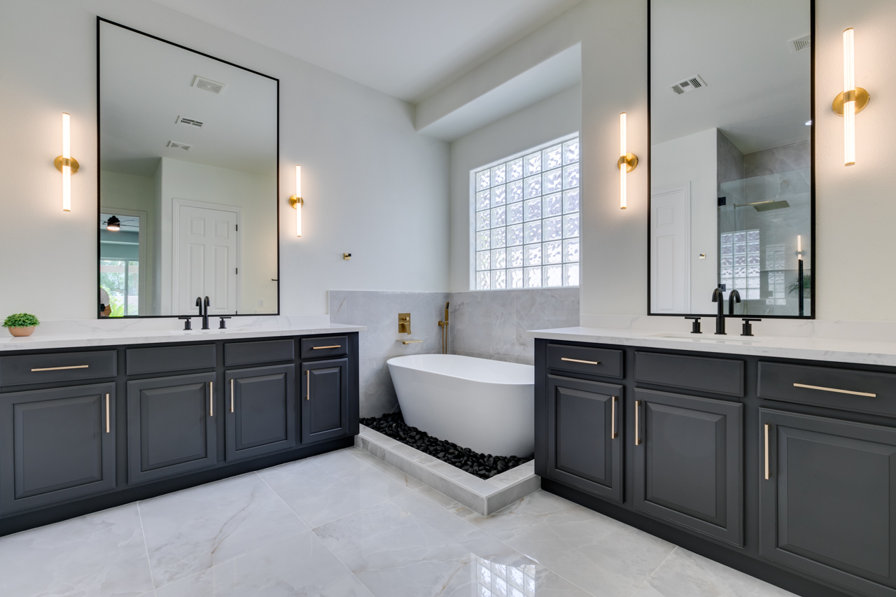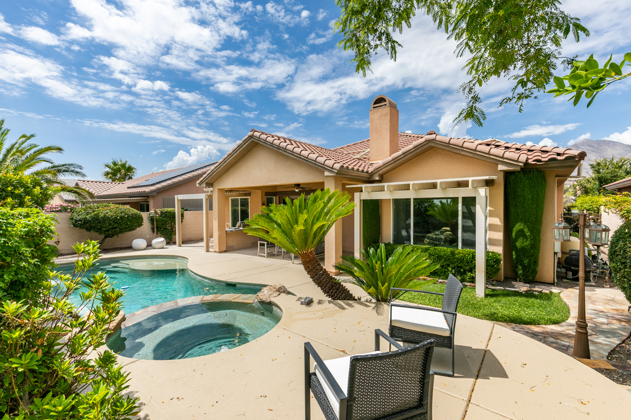 The spacious en-suite master bath offers dual vanities, a deep freestanding oval tub, and a beautiful glass spa-style shower. The chef-style kitchen with custom cabinets and an oversized island with bar seating is perfect for entertaining. You will love the resort-style outdoor oasis that is the private backyard with a large covered patio for plenty of shade. Youāll find a built-in BBQ and outdoor fridge along with the pebble tech pool/spa nestled on an elevated lot with partial strip views, all surrounded by mature trees and landscaping ā absolutely perfect for outdoor meals with family and friends. As an added convenience, the two-car attached garage also offers cabinetry and storage plus a workshop area.