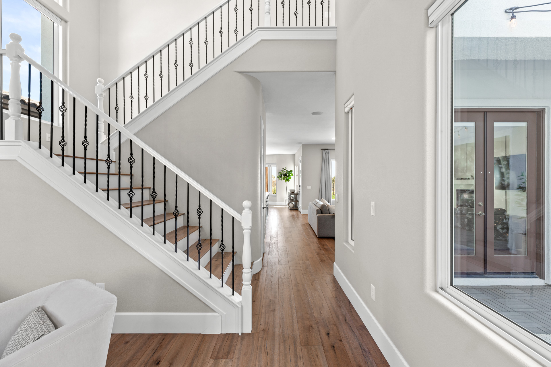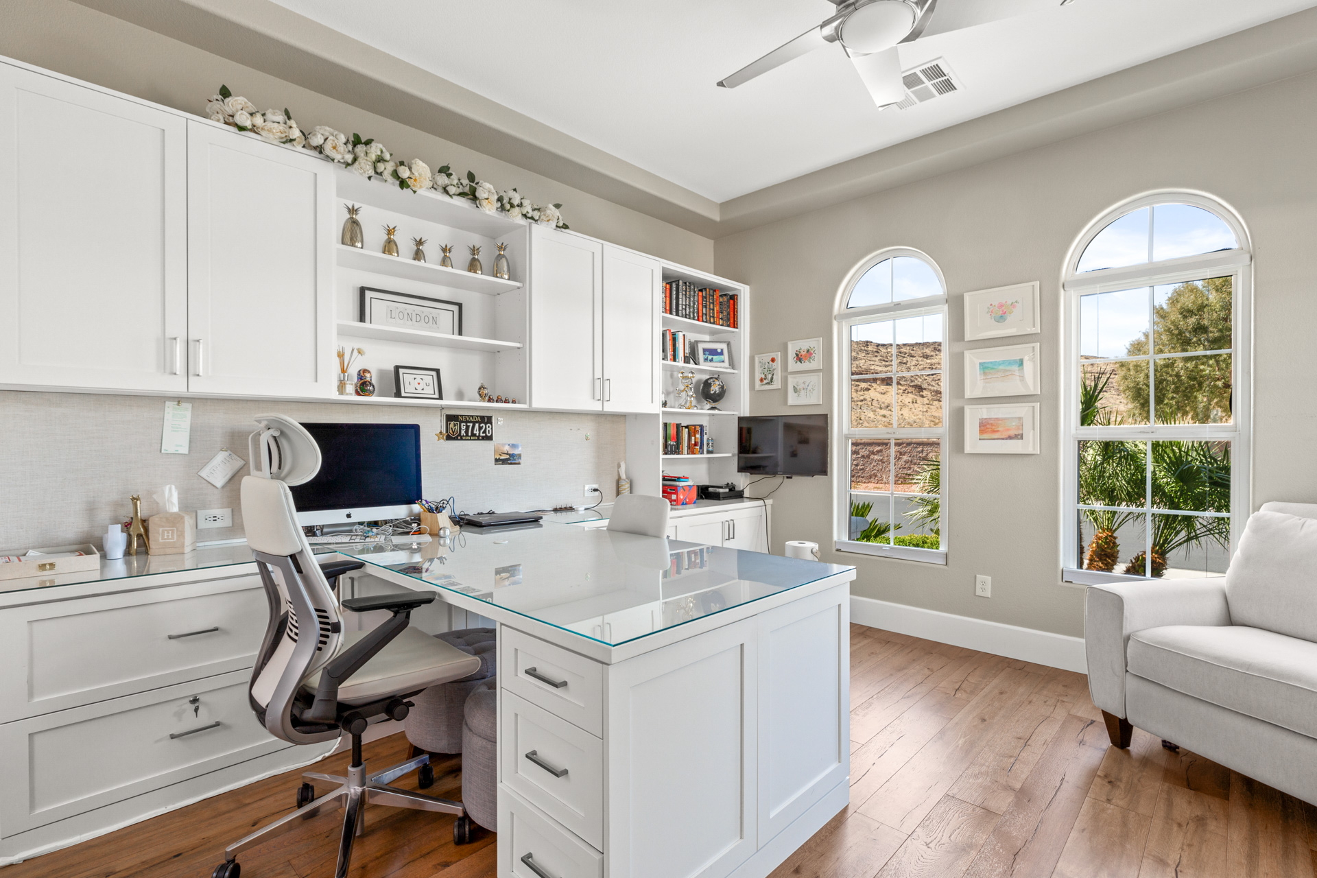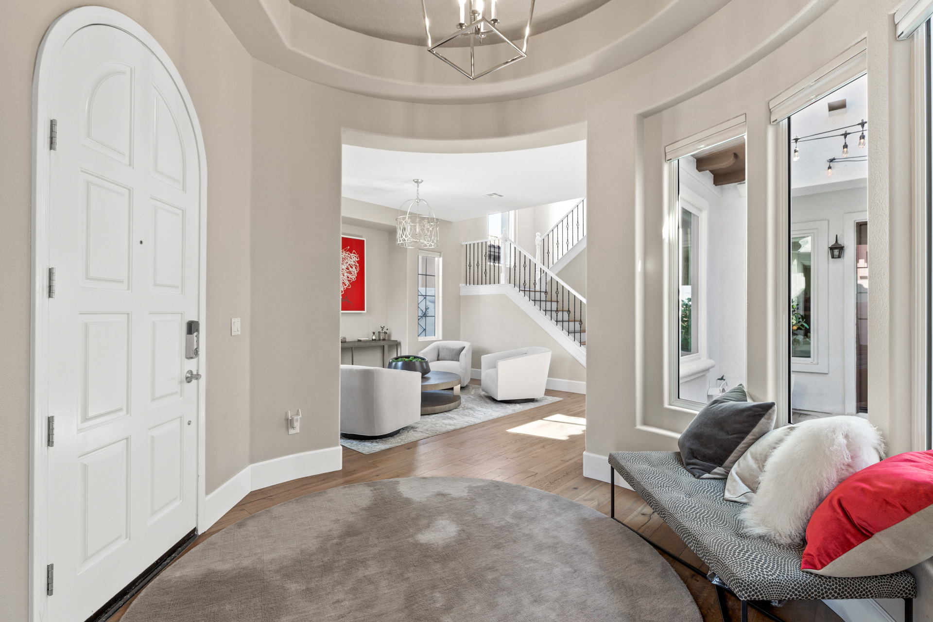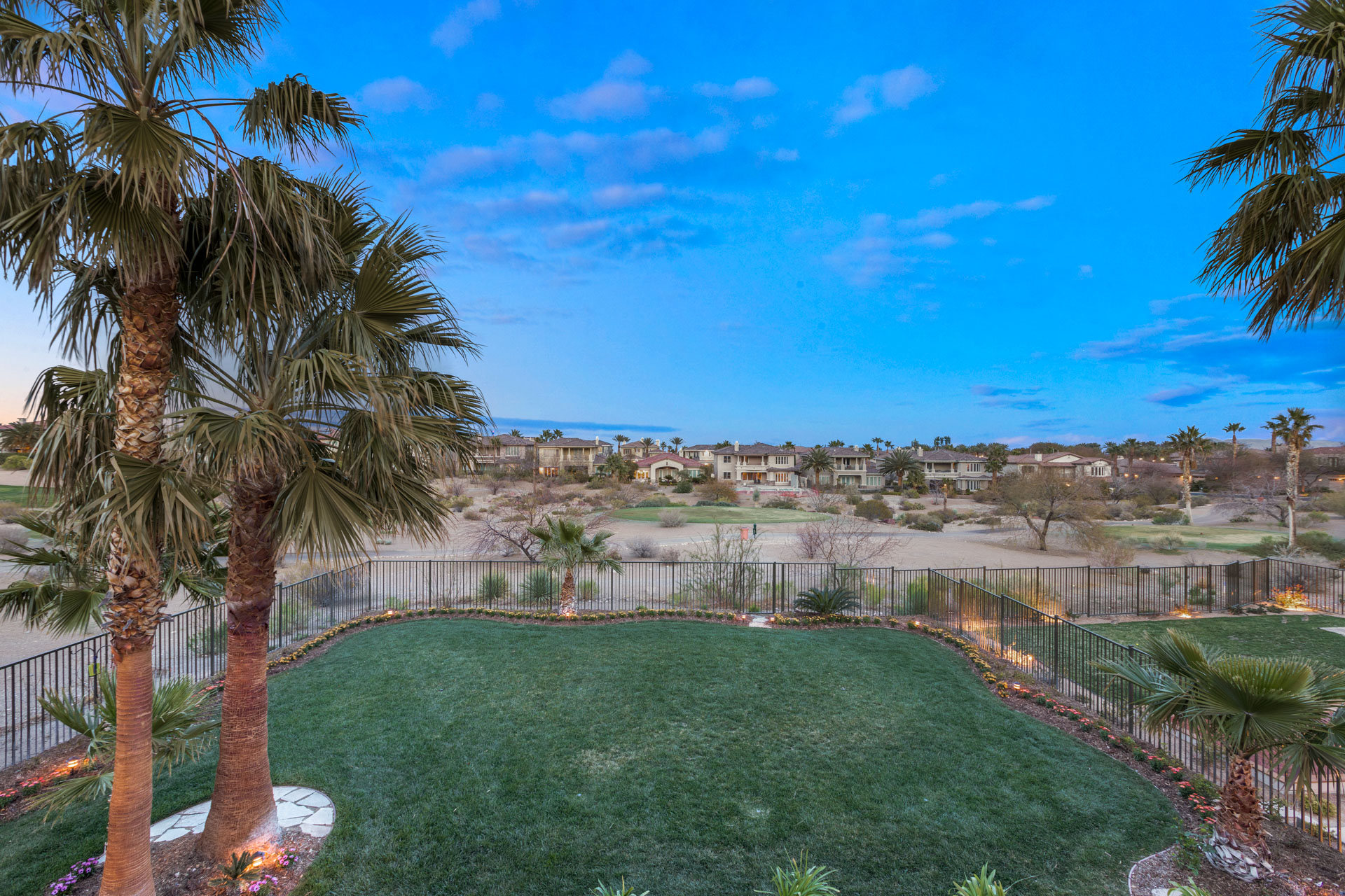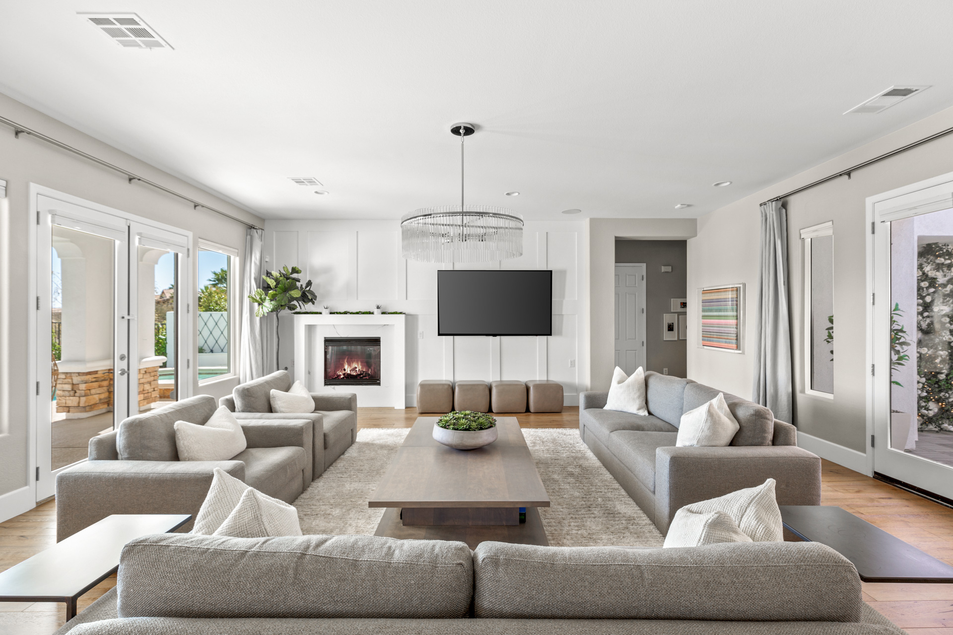 The main level includes a new bedroom with an ensuite bath, a private office, and a comfortable conversation area nestled near the entry. Downstairs rooms have courtyard views or overlook the backyard oasis with towering palm trees, a pool, waterfall and spa, and an expanse of green lawn. Beyond the fence are long views of the golf course and distant mountains. Recently remodeled with contemporary flair, this five-bedroom, five-bath residence is designed for comfort and easy upkeep. Finished in soothing tones of white and gray, the home features natural wood flooring throughout. The upstairs master suite has a large sitting area and private outdoor balcony, and its bathroom is breathtaking, with separate vanities, a unique tub set in front of a large window, and a bench shower. Three additional bedrooms occupy the second level, along with an expansive balcony. This exceptional home has just over 4,200 square feet of living space and a three-car garage.