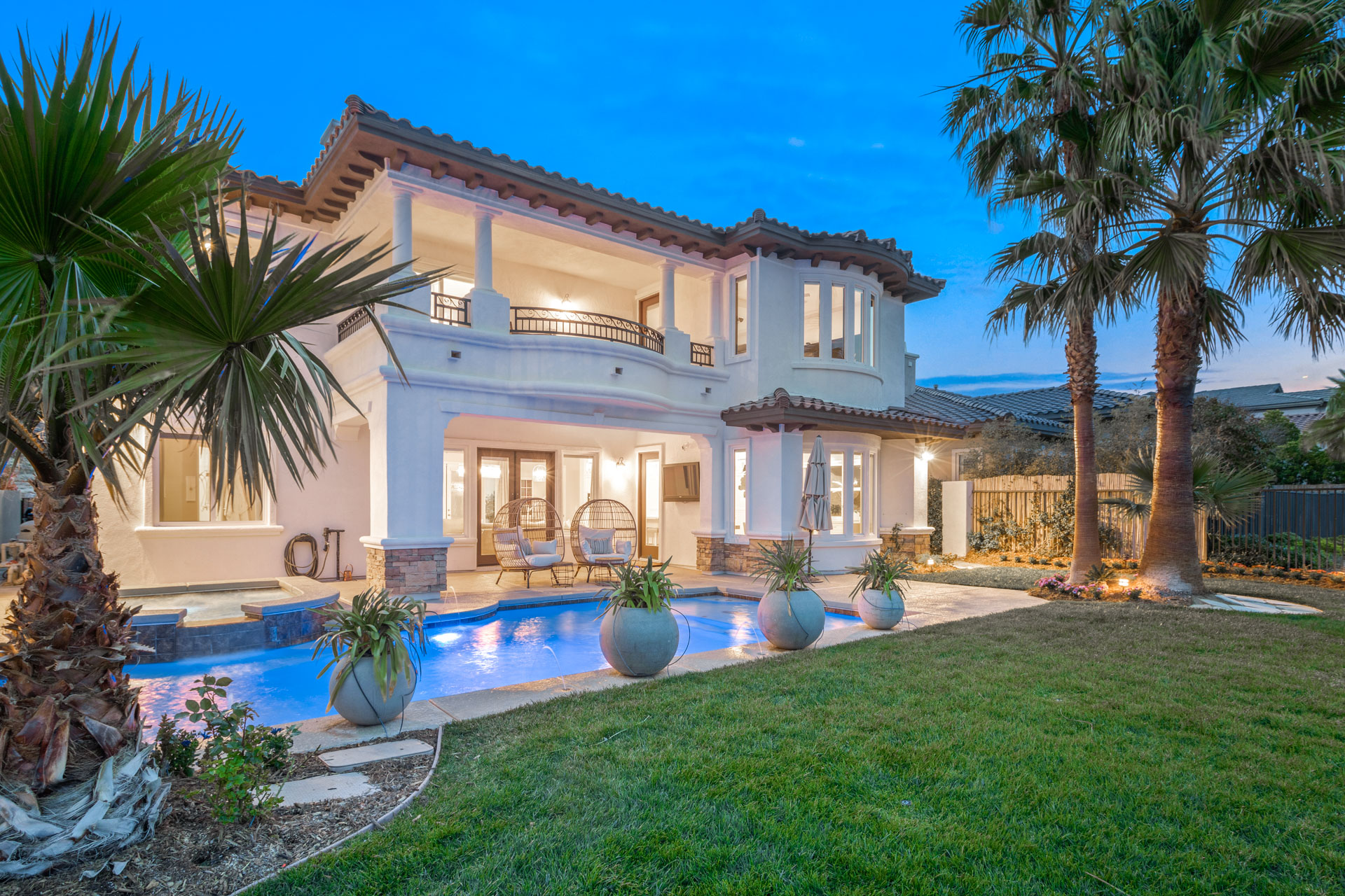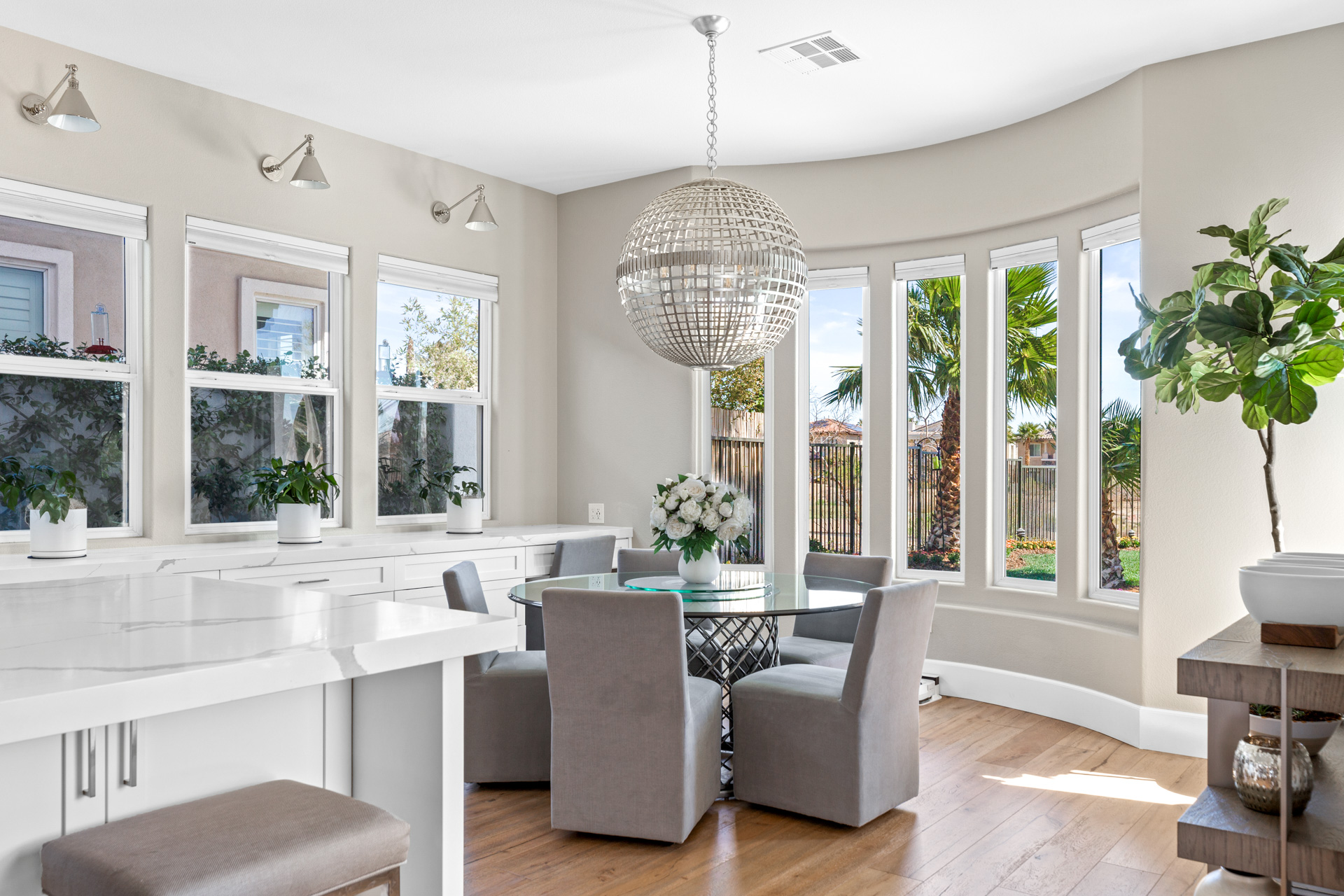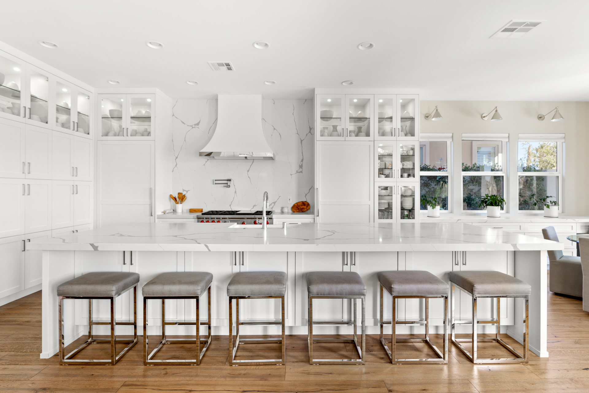 In addition to a lovely windowed dining area with an impressive chandelier, the kitchen features an immense island with stool seating for six, glass display space above white-painted cabinets, and solid-surface gray-veined counters. The home's great room is graced by a fireplace and French doors that lead to both an enclosed courtyard and the backyard pool.