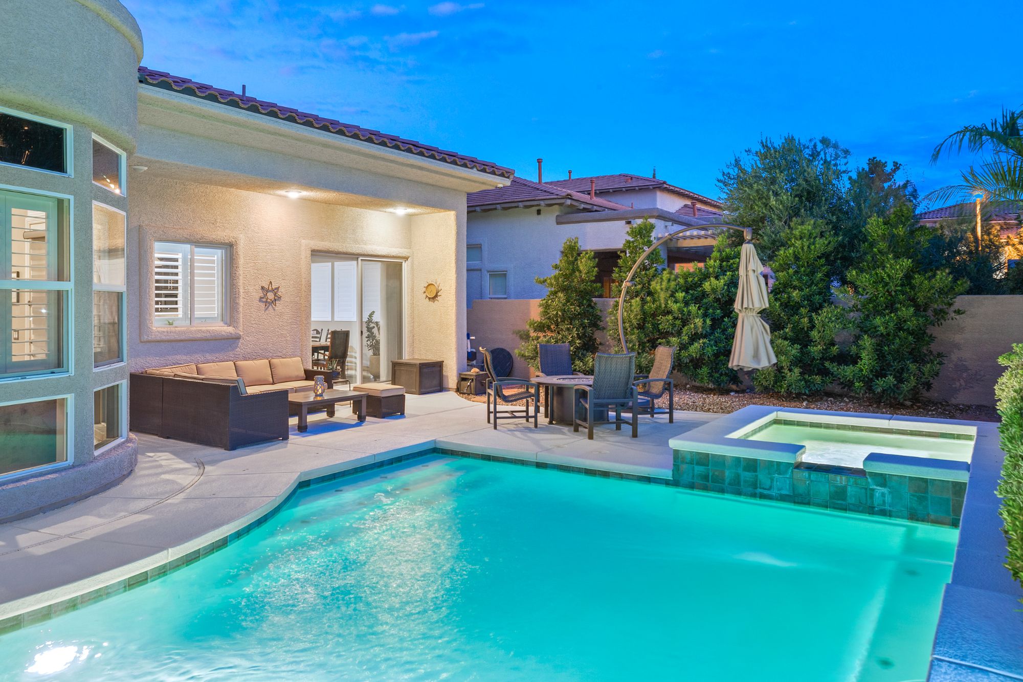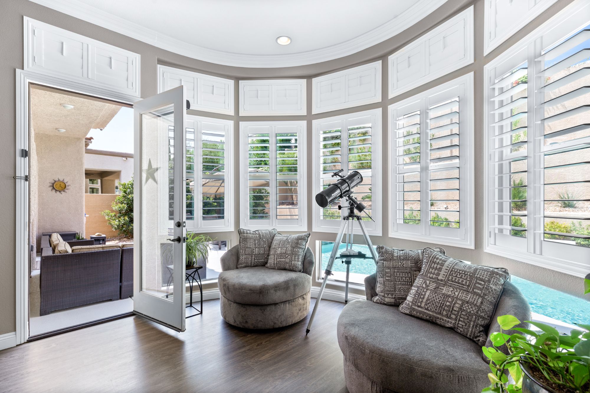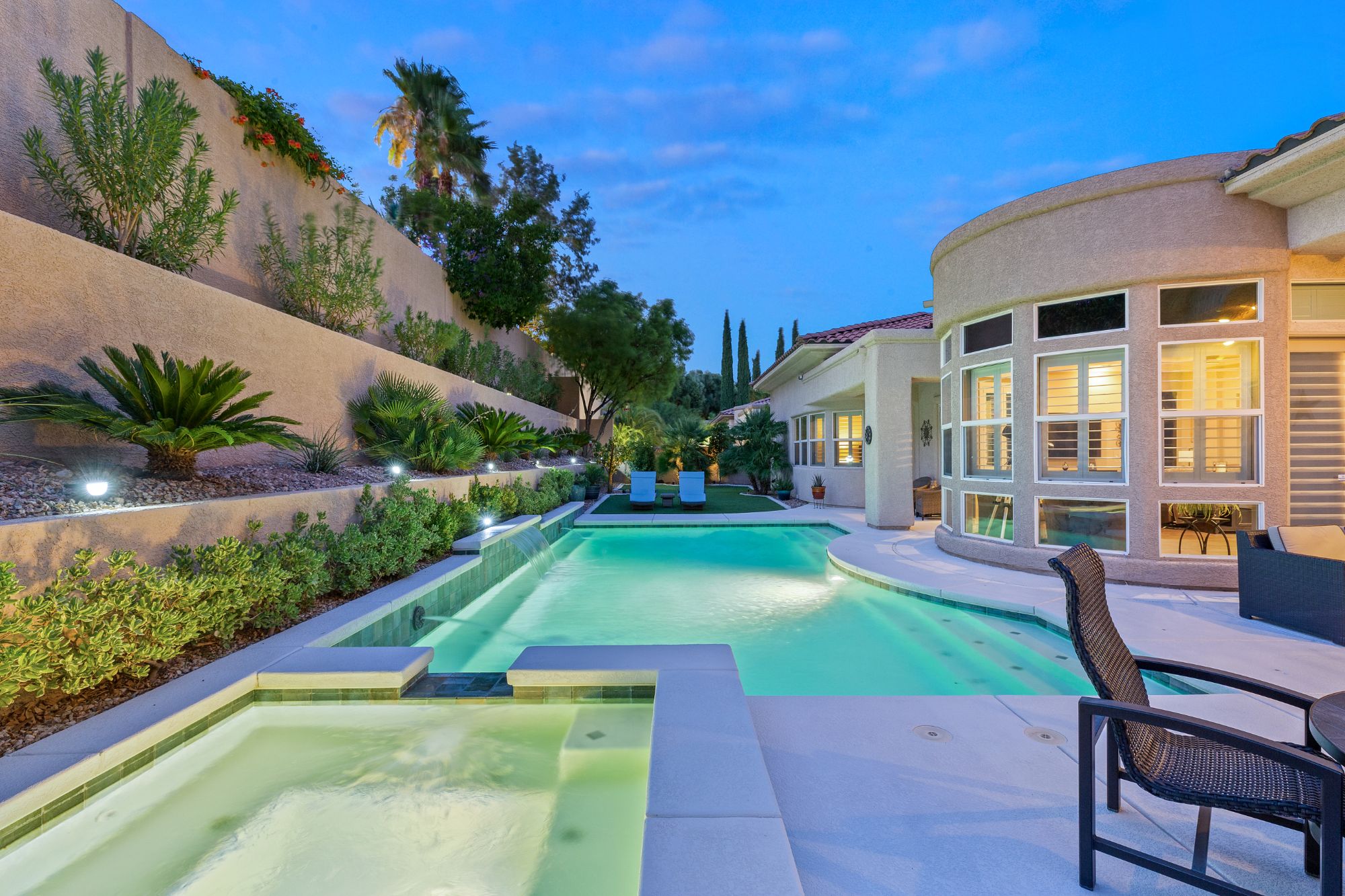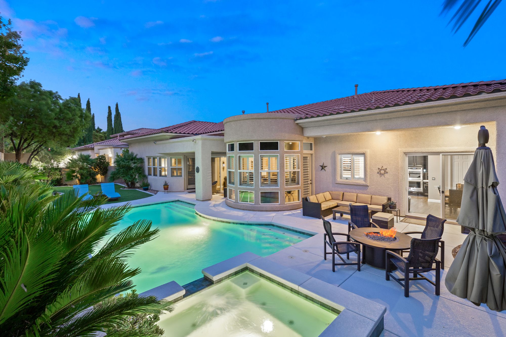 Numerous creative and stylish extras add appeal to this single-story three-bedroom charmer in Summerlin's gated Barrington community, including a stunning sitting area with a semi-circular wall of windows overlooking the sparkling backyard pool.