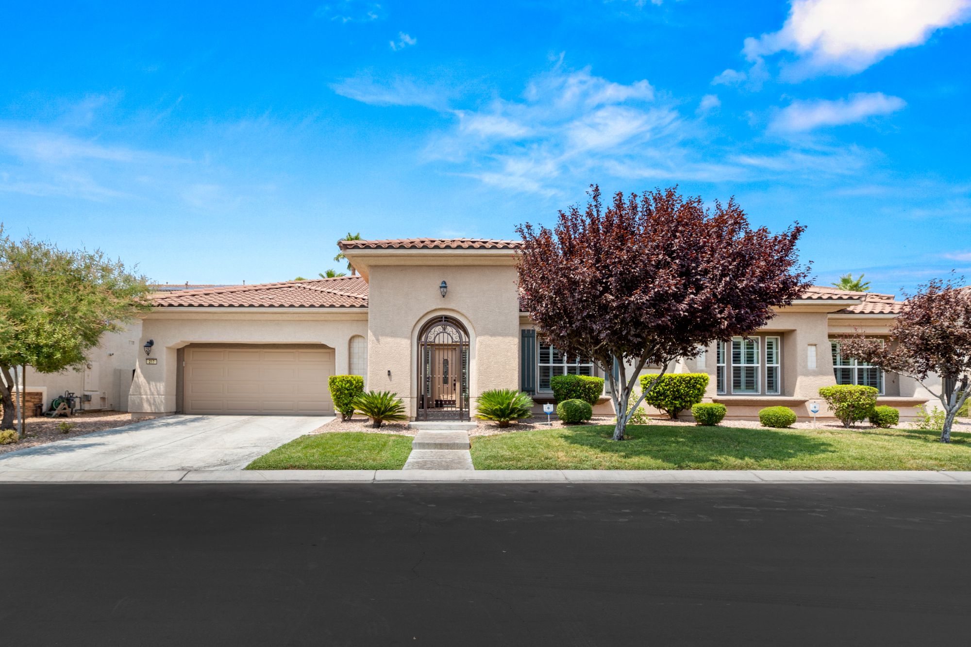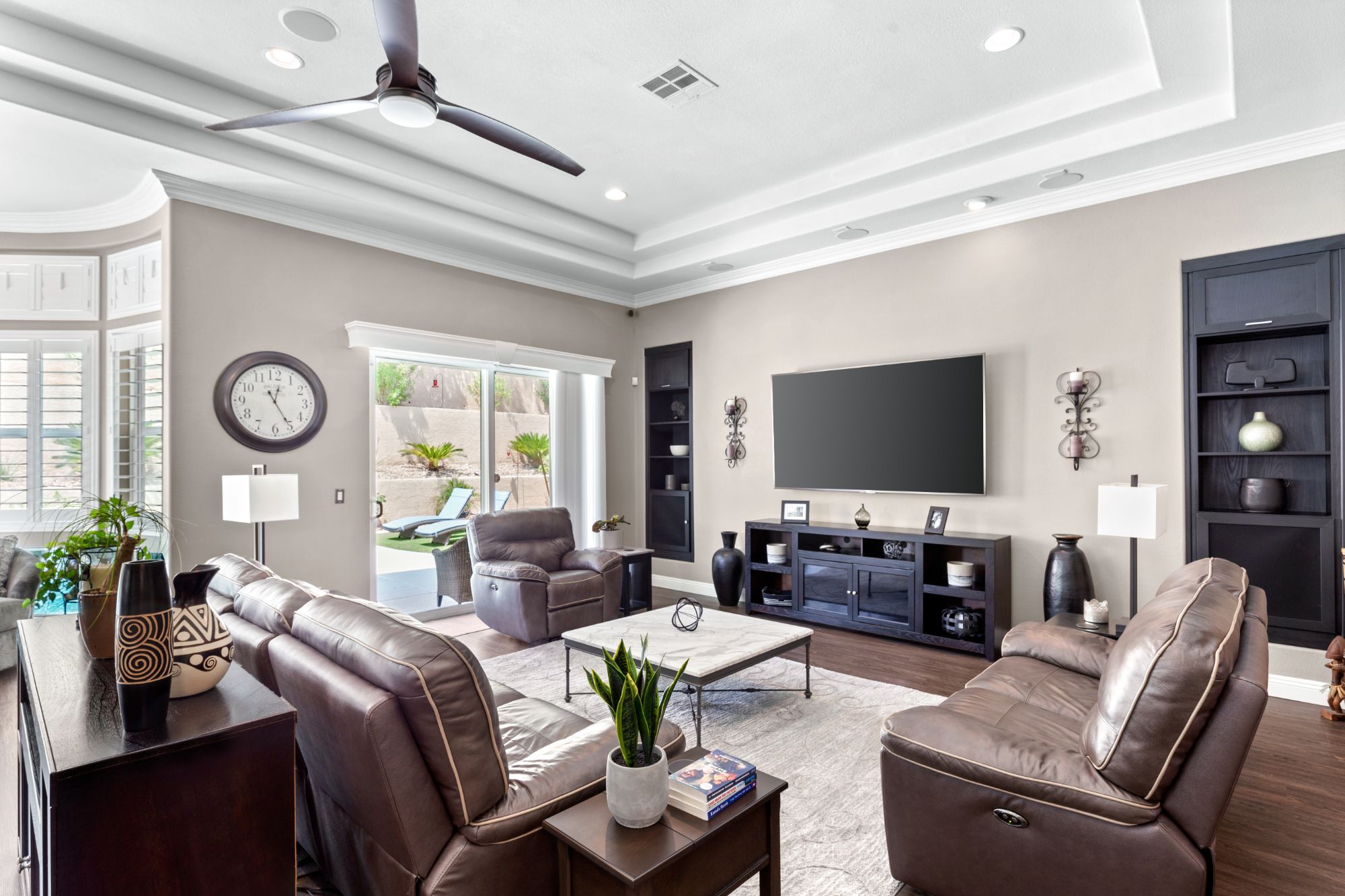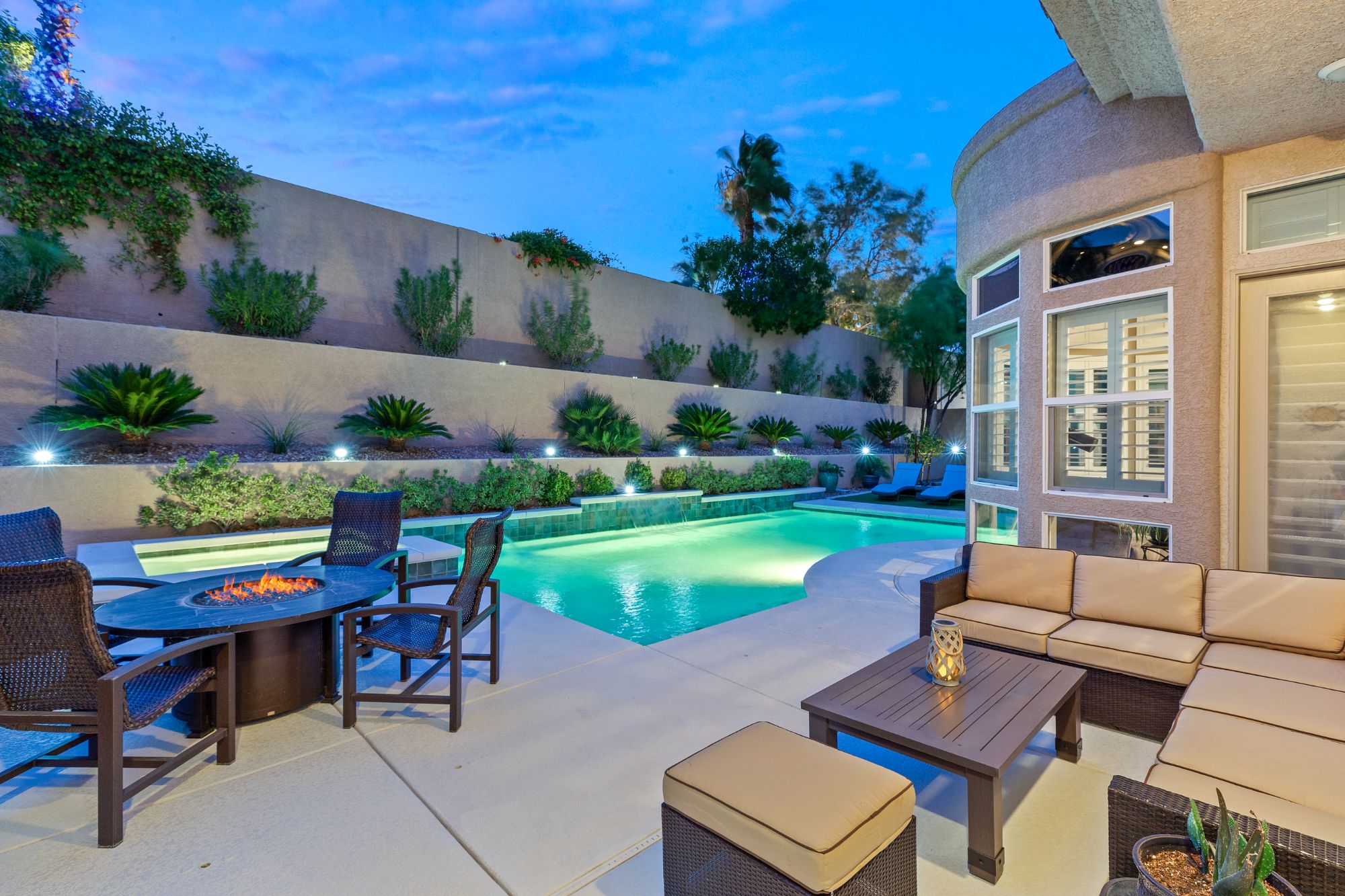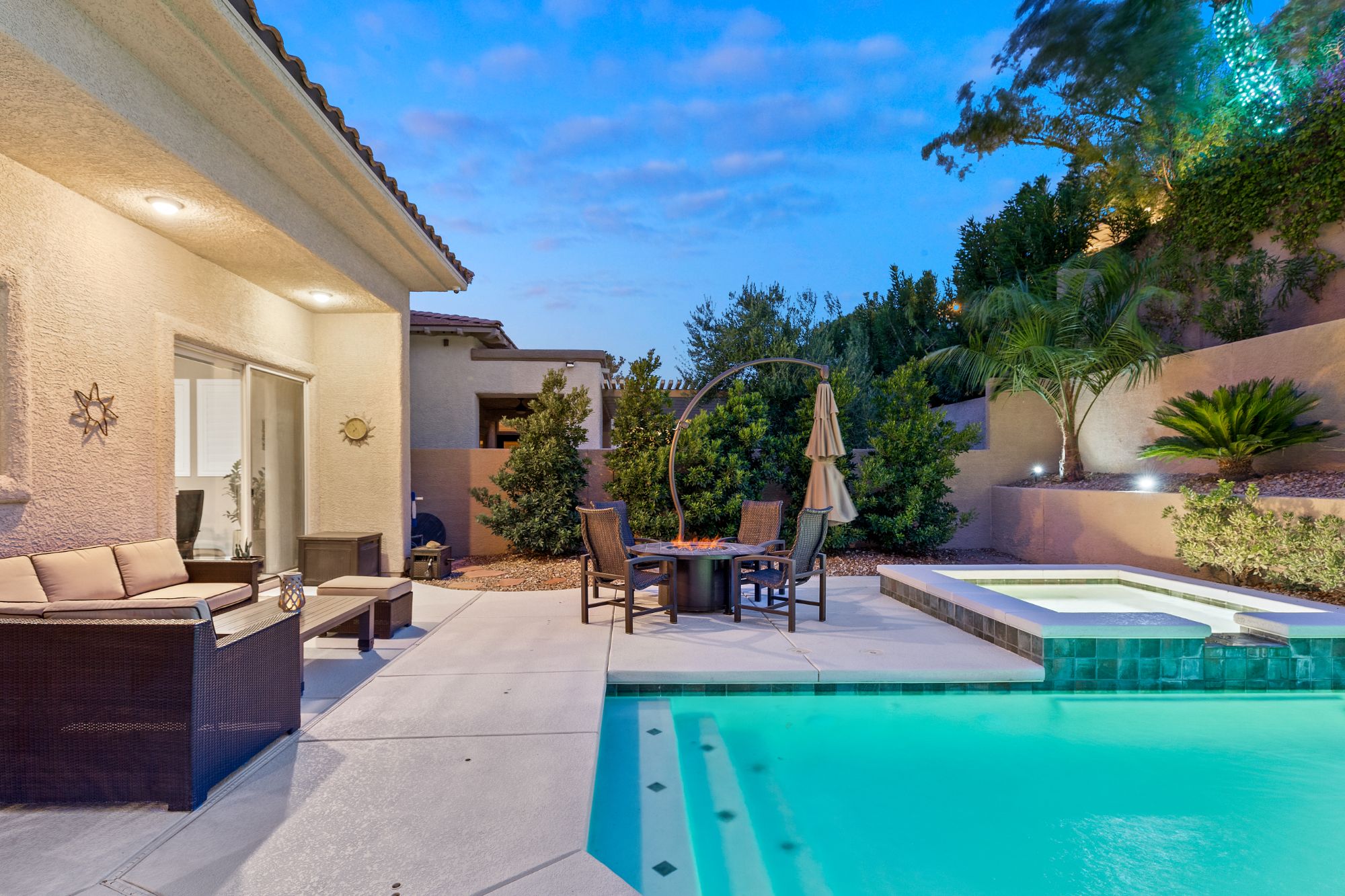 Numerous creative and stylish extras add appeal to this single-story three-bedroom charmer in Summerlin's gated Barrington community, including a stunning sitting area with a semi-circular wall of windows overlooking the sparkling backyard pool.