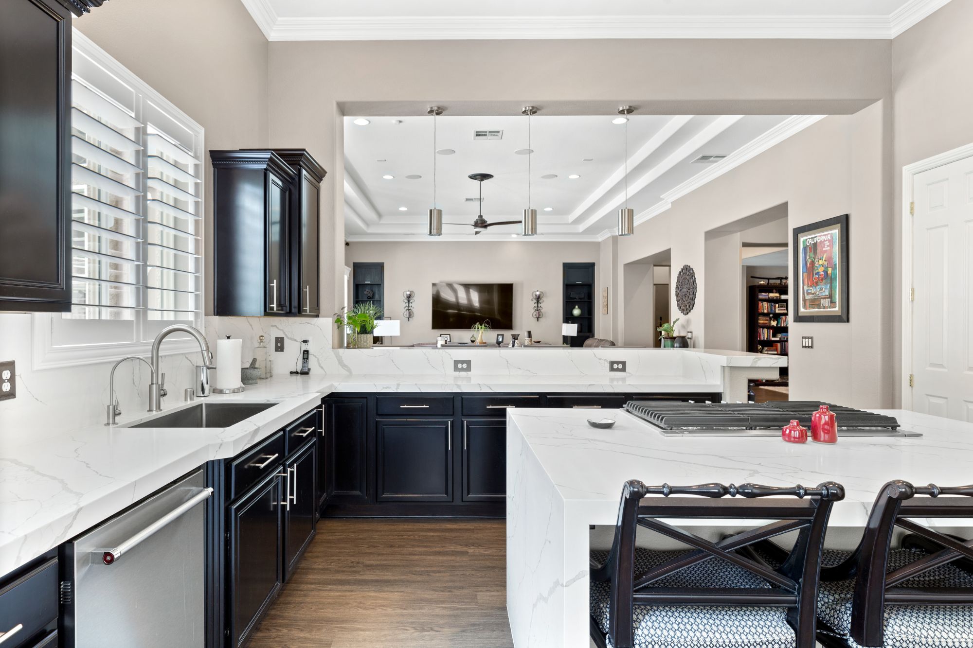 The kitchen, baths, and laundry room all have distinctive black painted cabinets with contrasting solid-surface countertops that look like gray-veined white marble. The kitchen boasts stainless steel appliances including a double door refrigerator-freezer and island gas cooktop, a dining nook with doors that open to an outdoor patio, and a bar-height dining/serving counter. Nearby, a comfortable den serves as a convenient office and planning center, and could easily be used for additional entertainment space. The home's master suite also has a curved window wall and private outdoor access, as well as a bath with double vanities and a separate tub and shower. Two additional bedrooms and two full baths plus a powder room complete the plan. This exceptional home also has a backyard gas fire pit, lawn sprinklers and a bubbledrip system for the extensive shrubbery and planting areas.