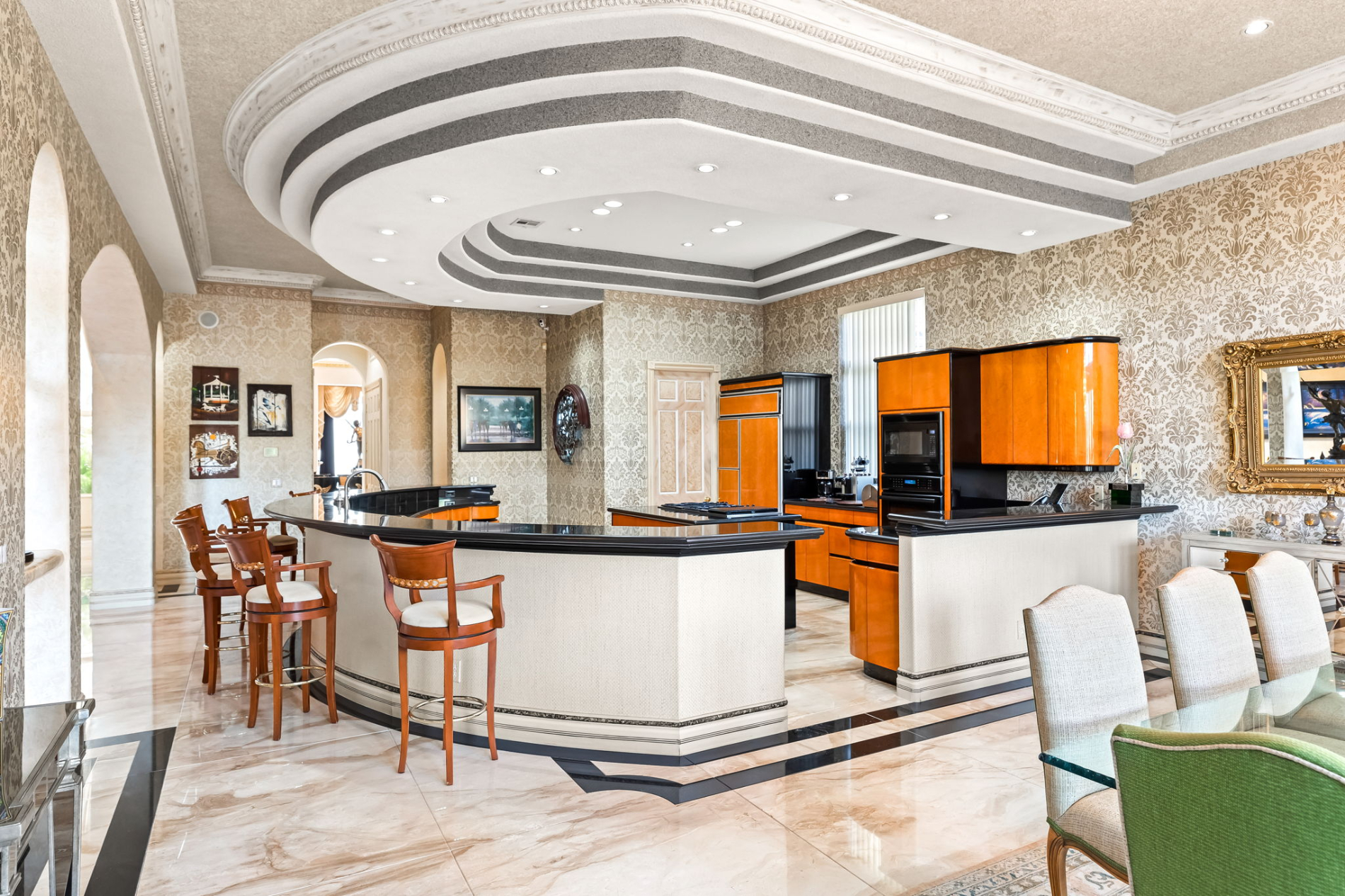 The main flooring features seamlessly matched Italian marble slabs adorned with contrasting black edging. This refined aesthetic is further elevated by inlaid custom carpeting for added comfort. Ceilings and walls sparkle with gold flakes, while crystal chandeliers in various spaces cast a dazzling glow, enhancing the upscale ambiance throughout the home.