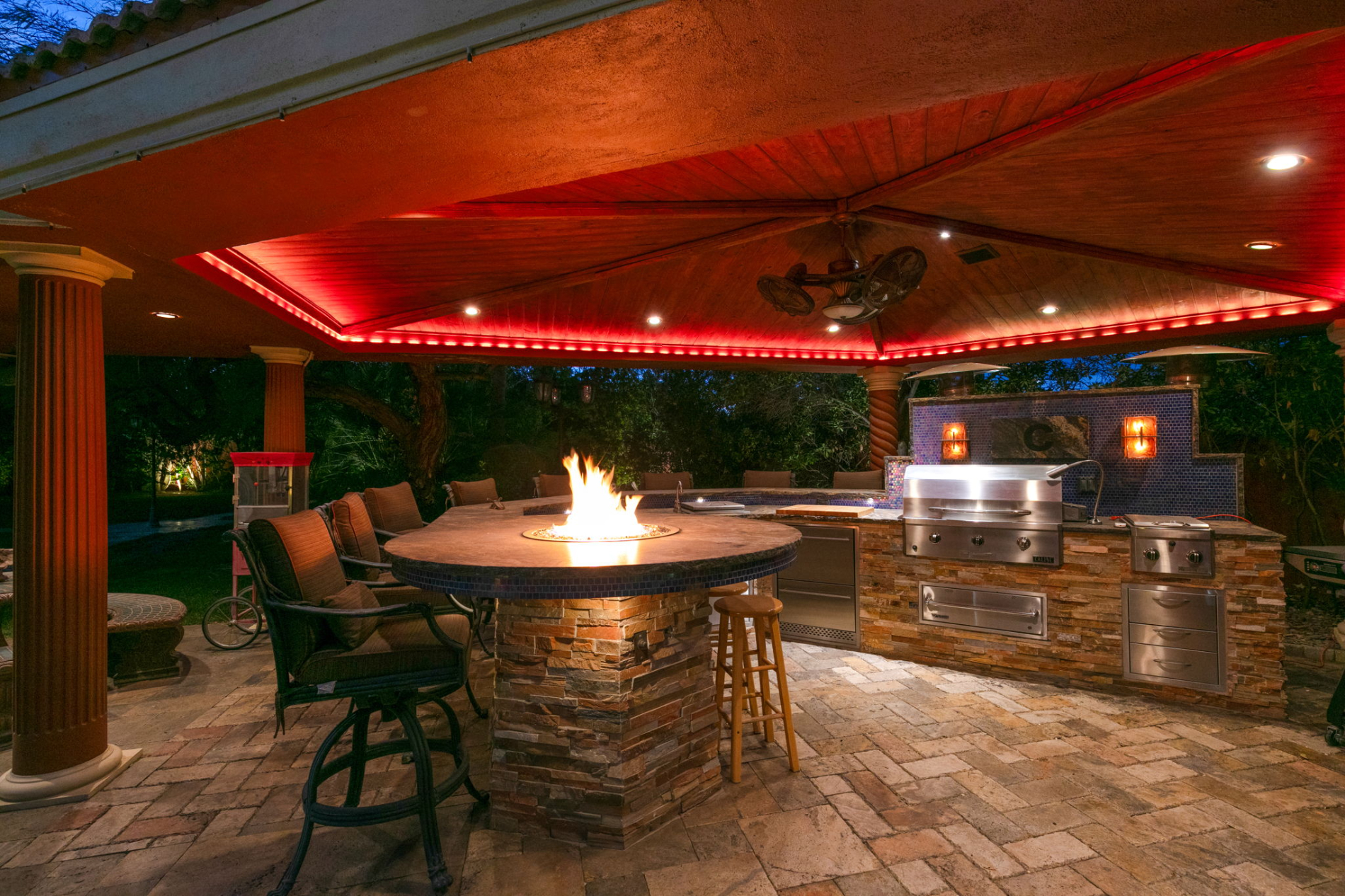 The kitchen is a chef's dream, featuring solid custom burl-wood cabinetry for a timeless and durable aesthetic. The countertops in black granite, can comfortably seat 10 people, creating a perfect space for entertaining. Additionally a family sized breakfast-nook with gorgeous french-doors leading to the outdoor areas. The family room centers around a full cocktail-wine bar featuring a sleek, modern one-piece black granite countertop. Craft unforgettable dinner memories in the opulent formal dining room, harmoniously linked to a classically styled conversational living room. The main bedroom, located downstairs, features silk soundproofed walls and an all marble spa-like bathroom. The luxurious amenities include a spacious shower enclosed with curved tempered glass, 18-carat gold faucets, a double Jacuzzi tub, and his and her closets. Access the expansive loft on the upper floor via elevator or stairs. The interconnected rooms feature French doors opening to balconies and full bathrooms with jacuzzi tubs for a spa-like ambiance. One of the rooms includes a professional gym for fitness enthusiasts. Immerse yourself in elevated, outdoor living in our lush tropical backyard. Enjoy a fully equipped BBQ kitchen with gemstone-adorned granite countertops and modern appliances, all under a stylish tile roof. Next to the extra large swimming pool with water features, there's ample grassy space inviting both kids and pets to play. Move into charm and enduring style within this thoughtfully designed residence, showcasing custom copper gates and garage doors. Seamlessly blending luxury, functionality, and meticulous attention to detail, providing a comfortable living environment in a small gated neighborhood near the strip.
