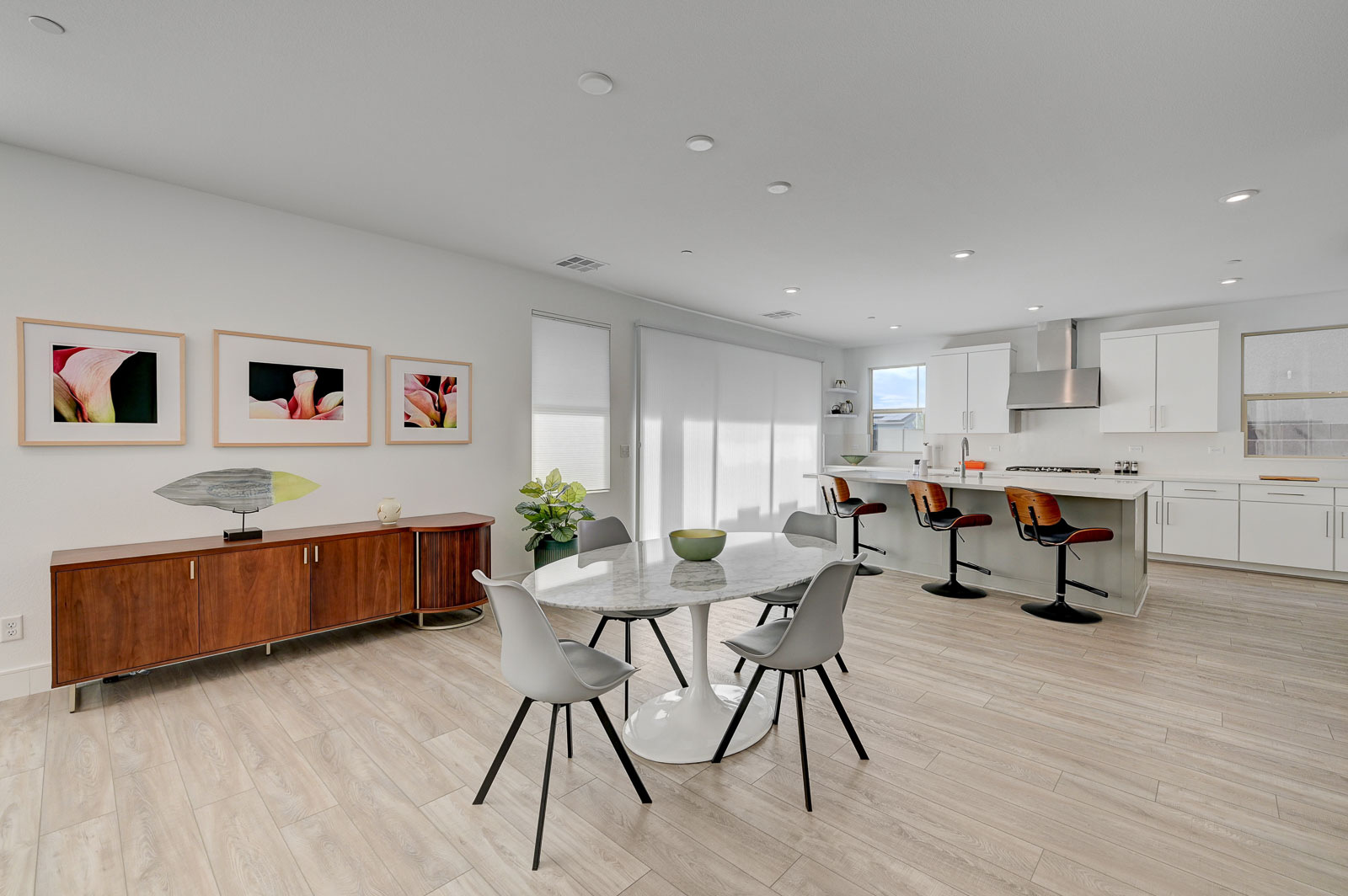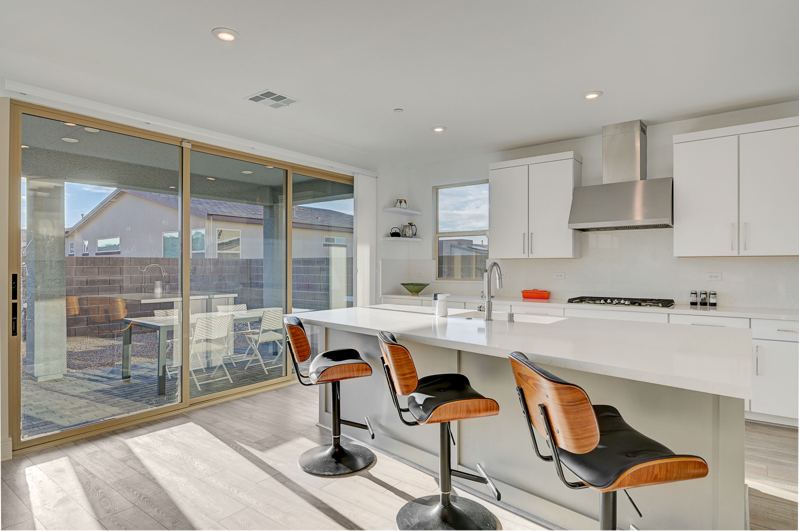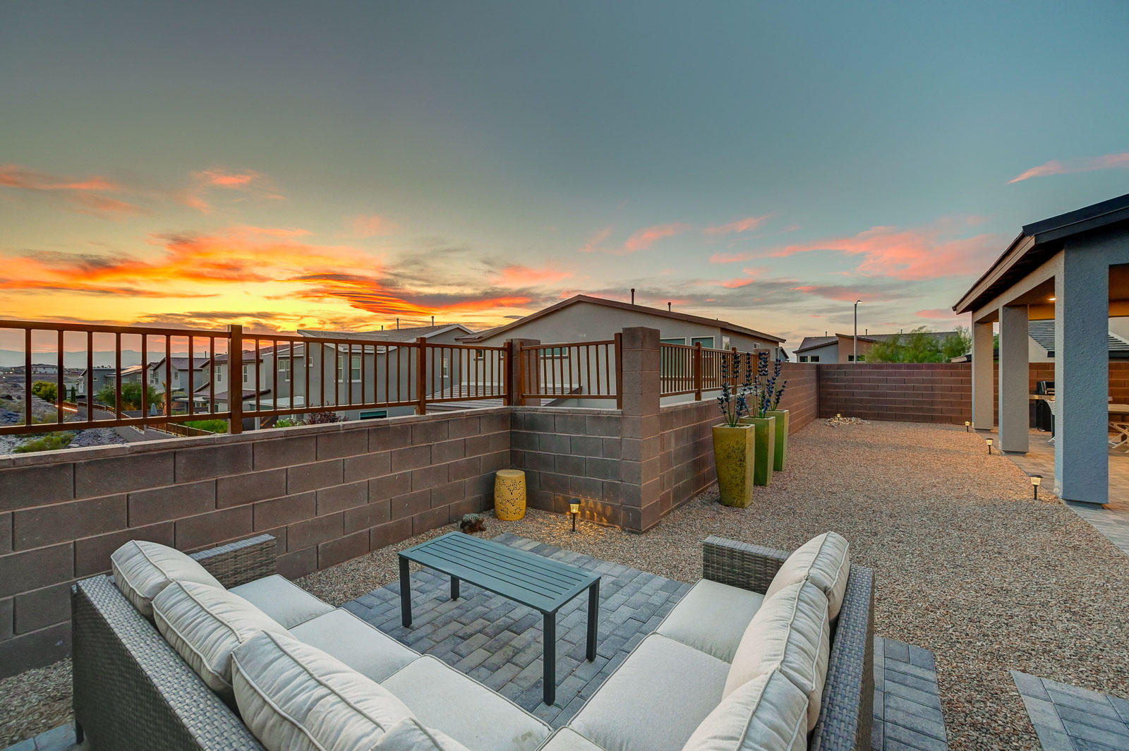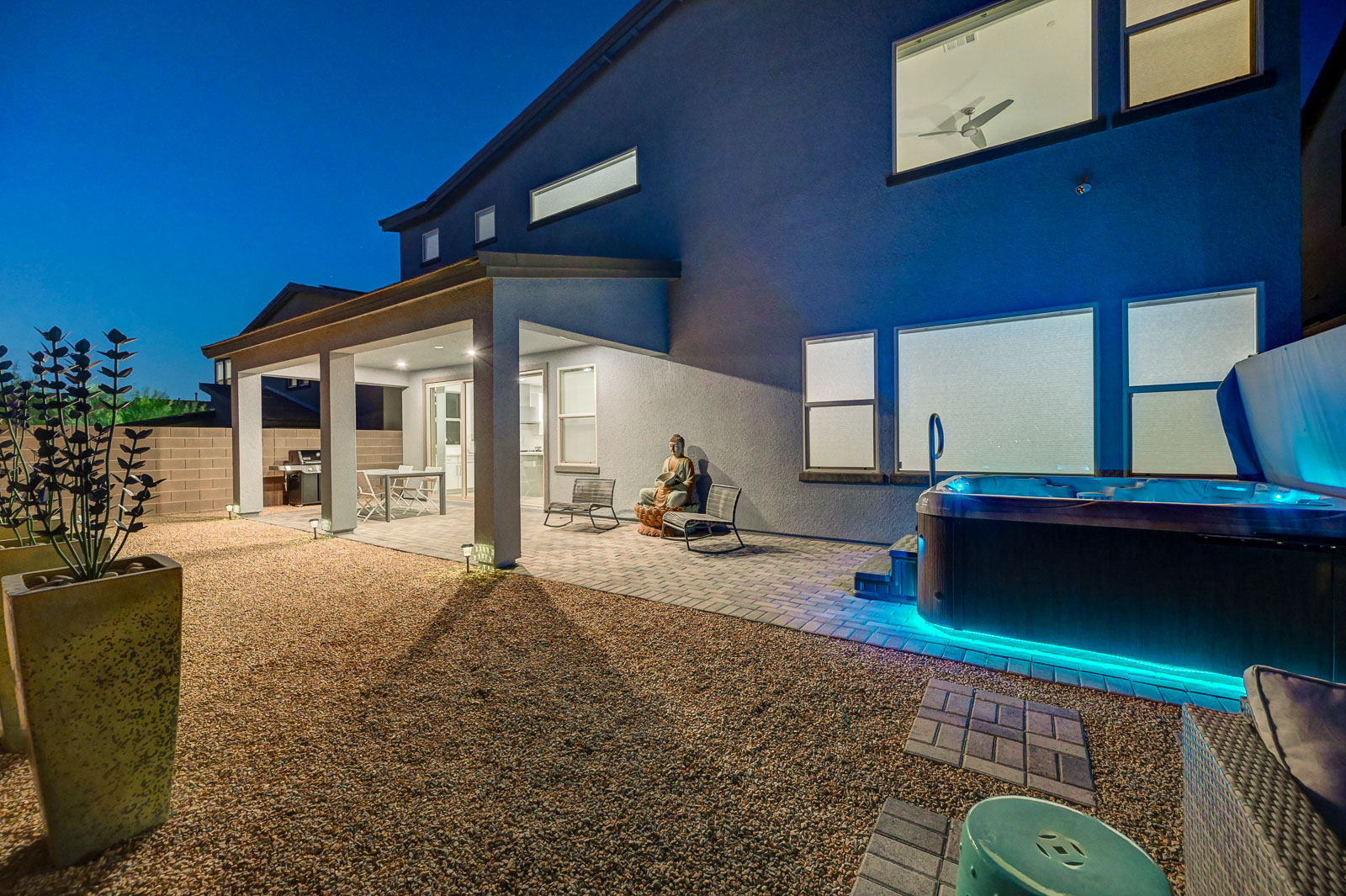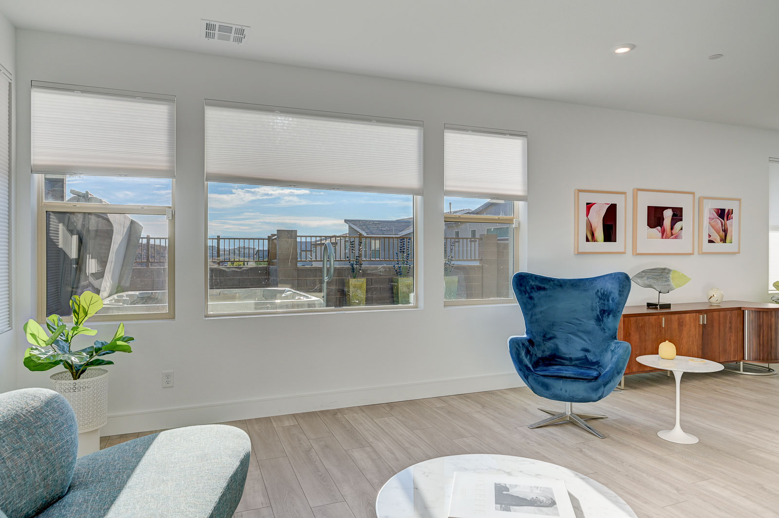 The great room flows seamlessly into a gourmet kitchen with upgraded cabinetry, large quartz island, stainless steel appliances and walk in pantry. Ground-level bedroom with bath offer convenience, while upstairs the primary, two additional bedrooms and a versatile loft provide additional space for at home office, play area or more. The primary suite captures stunning Strip views, spa-inspired bath and generous walk-in closet. Outdoor enjoy a covered patio, heated spa and unobstructed views with no rear neighbors. All just minutes from scenic trails, parks, shopping, dining, and 215 freeway.