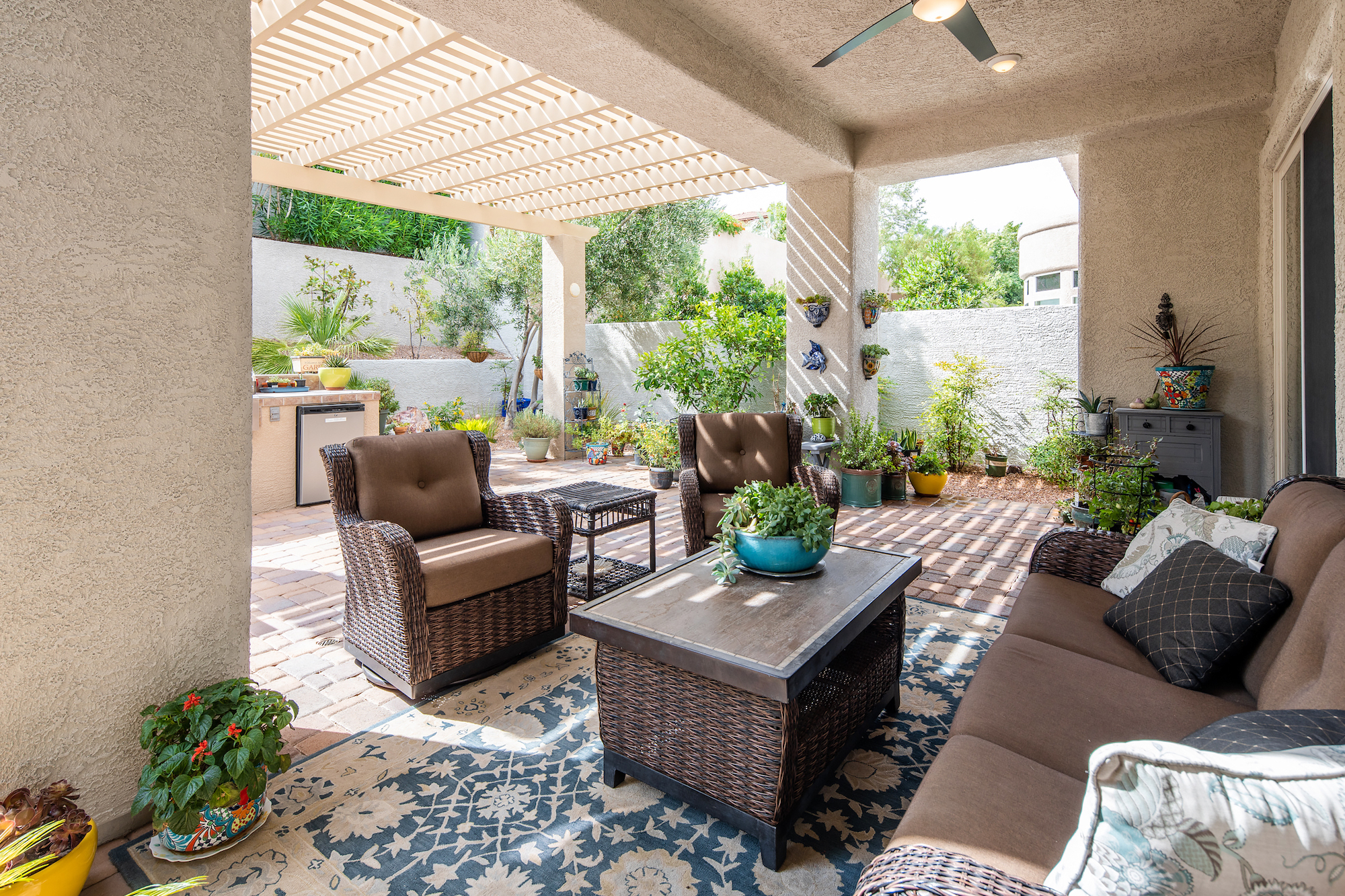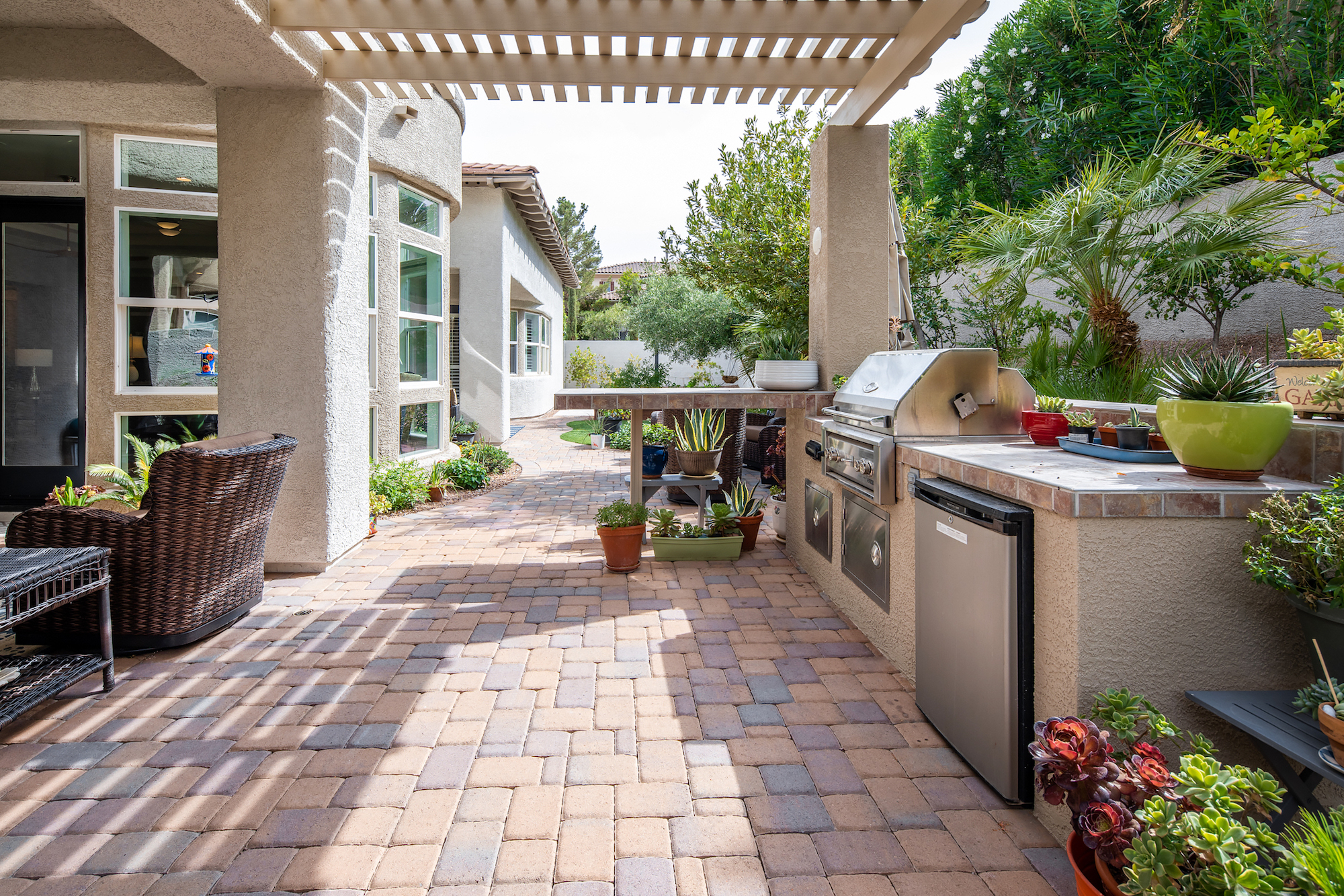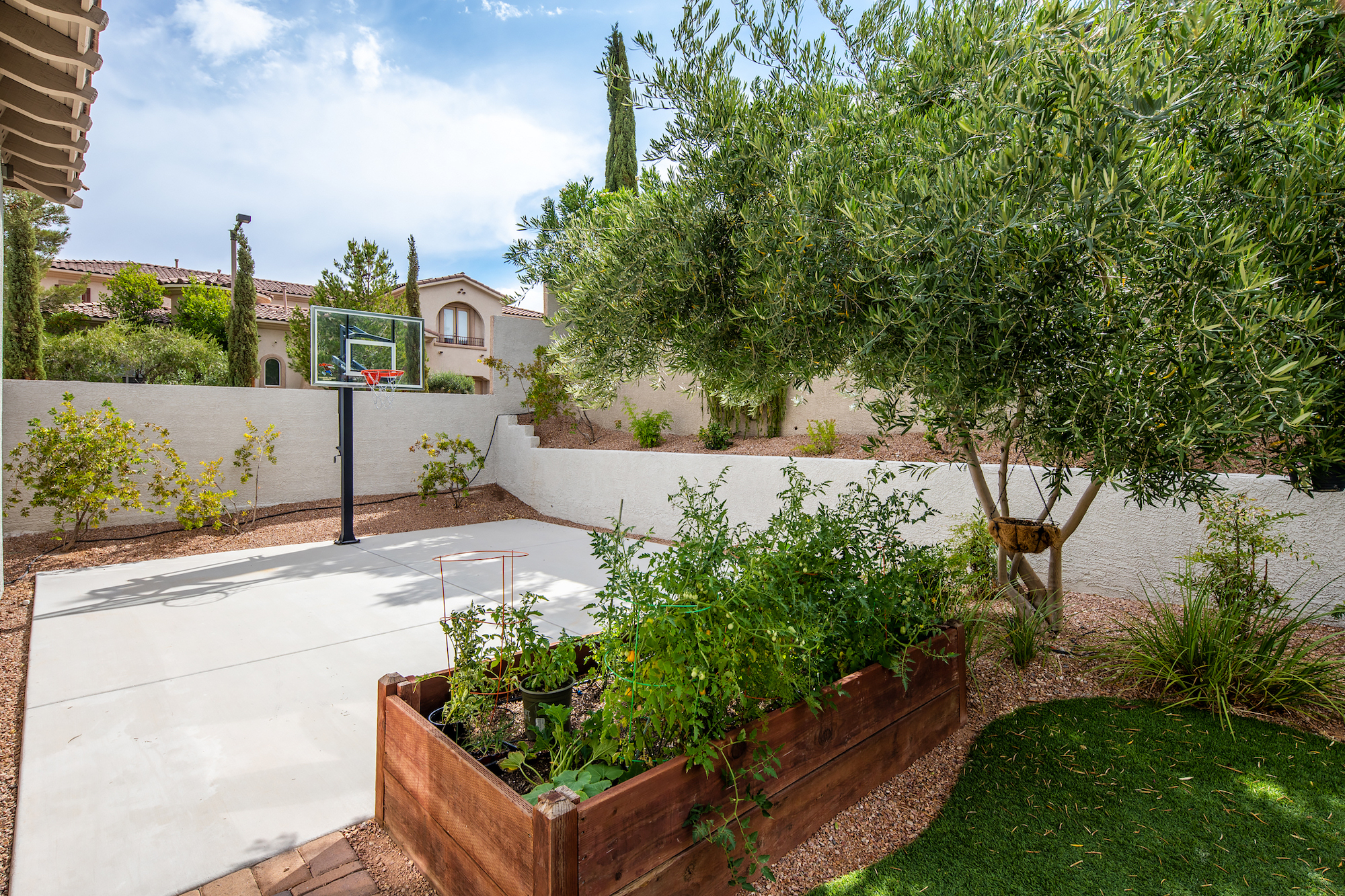 Not only does it feature an expansive covered patio, but also a stylish ramada that doubles the shaded outdoor space. A well-equipped all-weather kitchen includes a stainless steel grill and undercounter fridge along with plenty of counter space. There is an inviting firepit in addition to a basketball court, mature trees, lush shrubbery and manicured lawn.