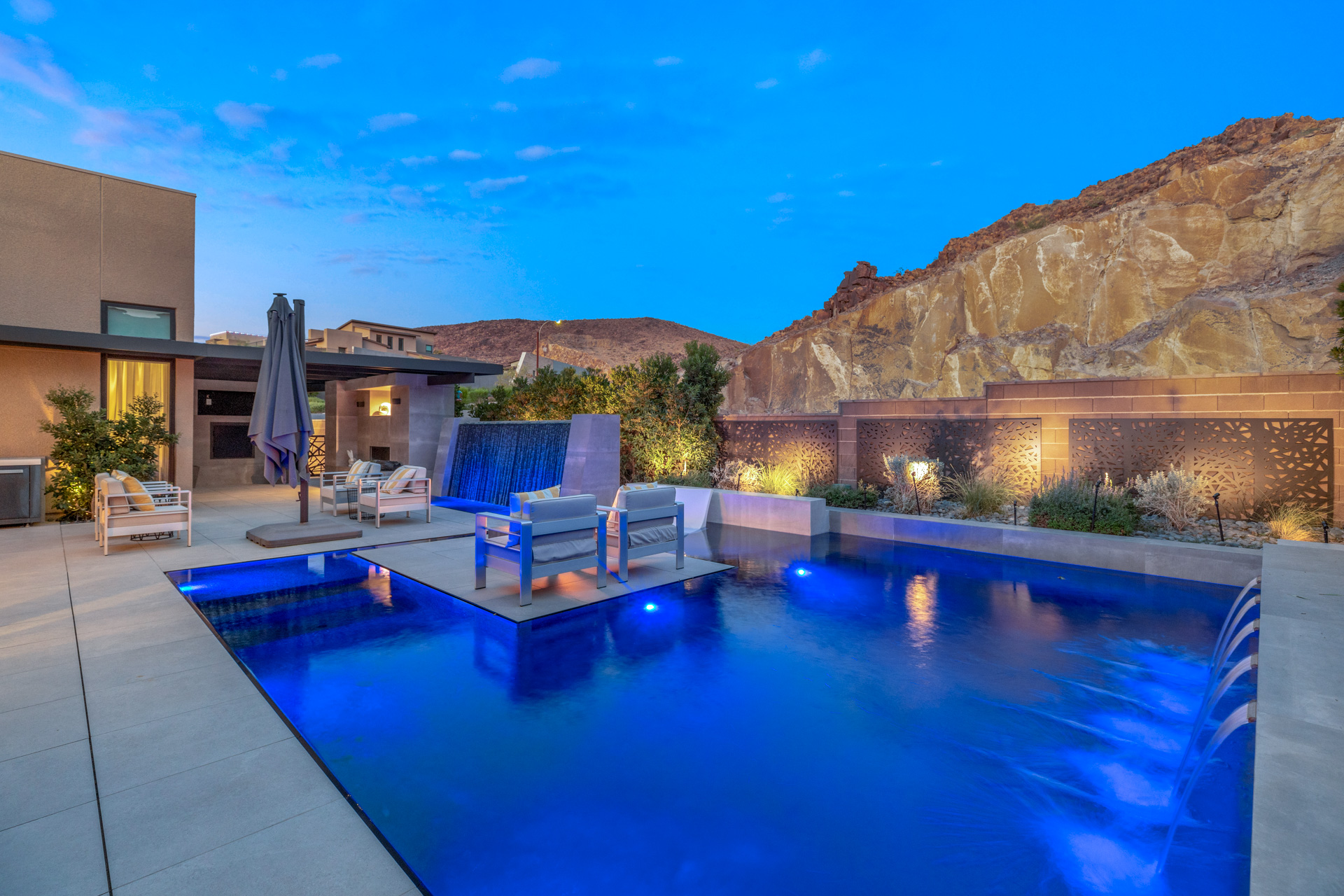 The downstairs primary suite is stunning with built-in shelving, spa like bath and custom closet with washer and dryer. Downstairs offers a guest suite and two other generously sized bedrooms are upstairs. All bedrooms are en suite with walk in closets. Outside is a true oasis in the desert. Every inch has been maximized for outdoor enjoyment. Disappearing infinity edge pool with waterfalls, firepit, and a feature stone waterwall highlight the space. Plus a covered patio for TV and a fireplace. Outdoor perfection!