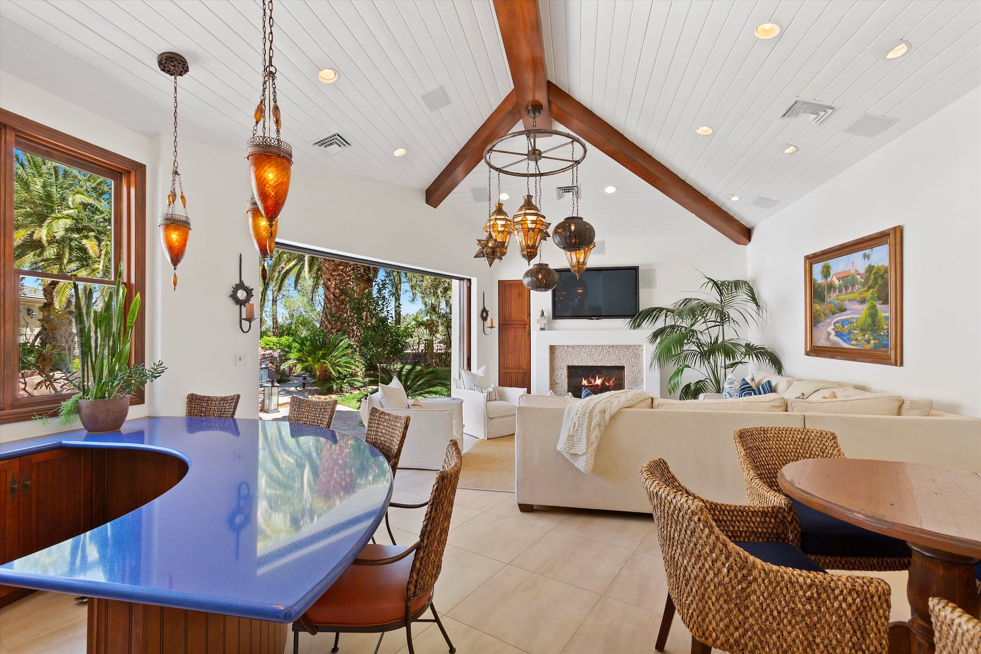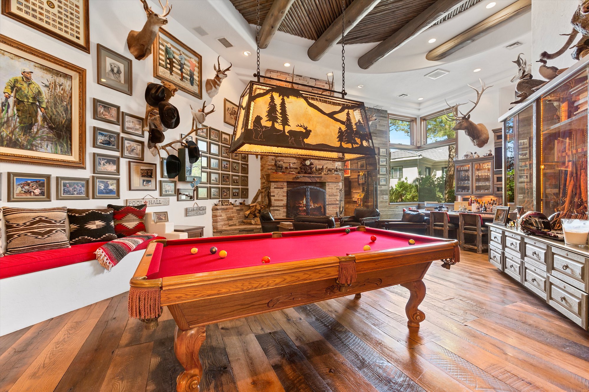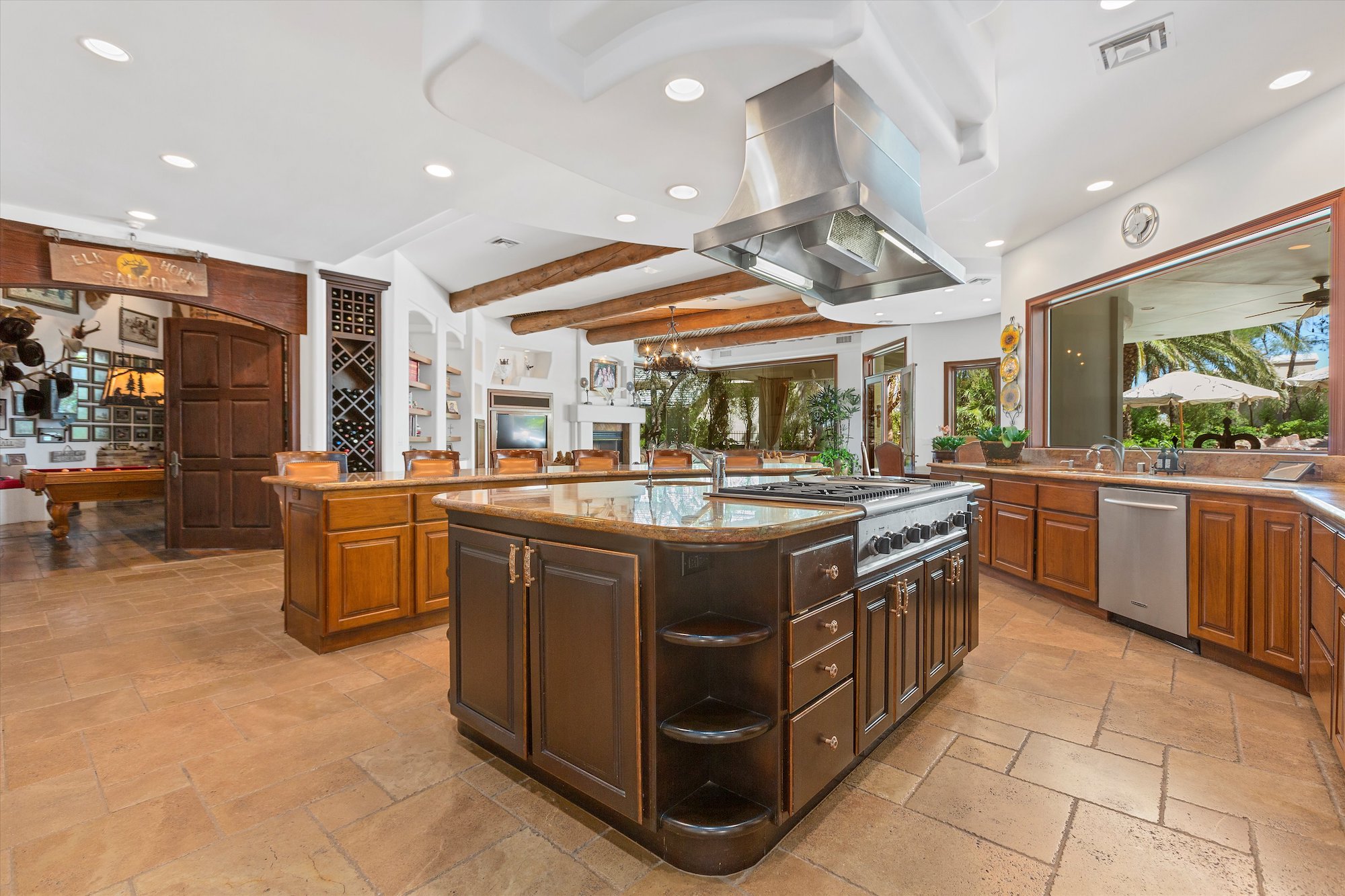 The spectacular residence and grounds have the flavor of an island retreat located in a tropical paradise. The home's interiors are serene and dramatic at the same time. There are walls of glass that frame exterior vistas, a grand sweeping staircase and soaring ceilings in public spaces, a sunken formal living room, a baronial dining room, and a great room with wet bar. A comfortable den adjoins a superbly outfitted kitchen, and a rustic great room, large enough for a pool table, has its sit-down bar counter and a private card room behind a glass door. It features a distinctive wall for wine storage. Distinctive lighting is featured throughout the home.