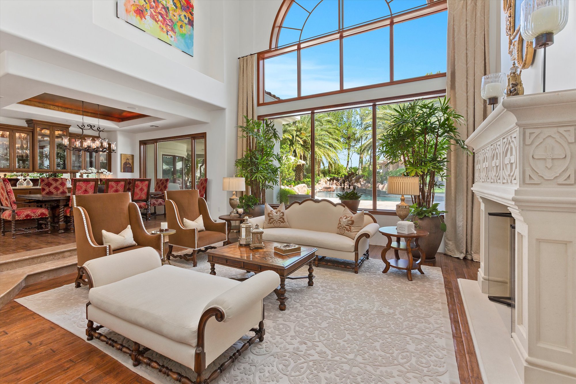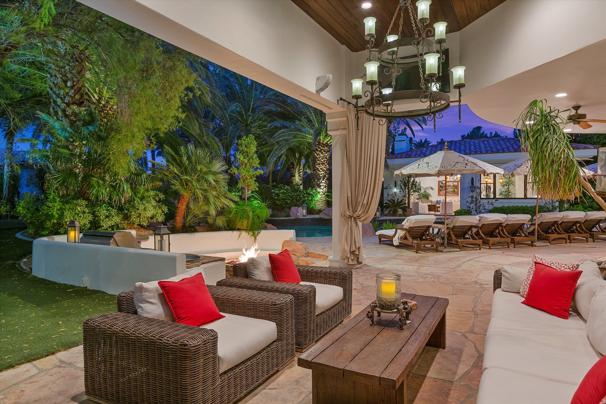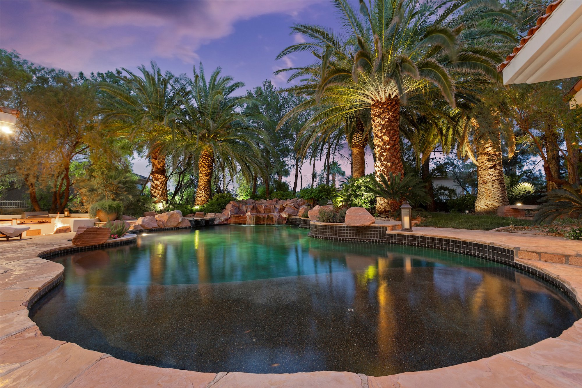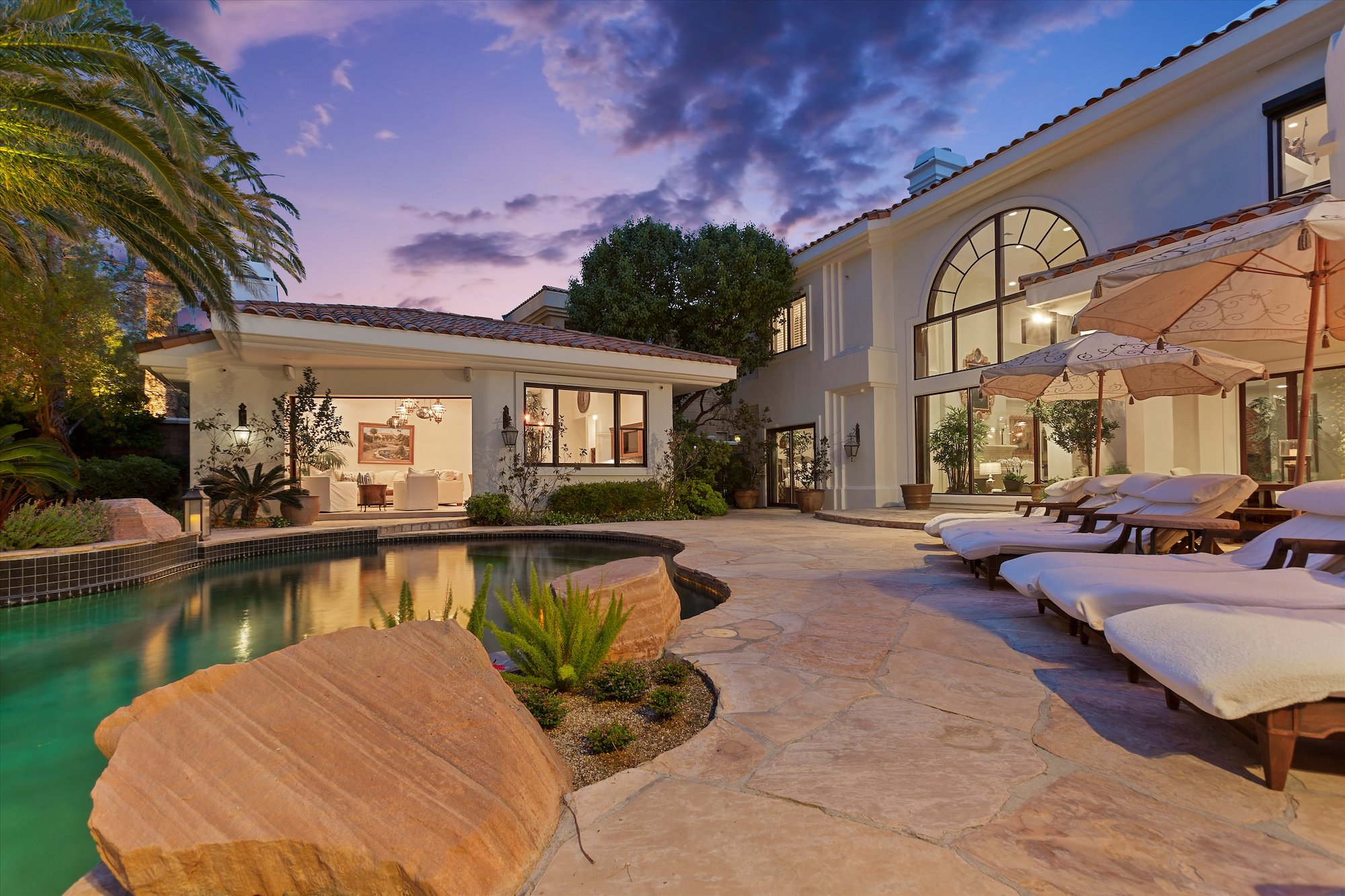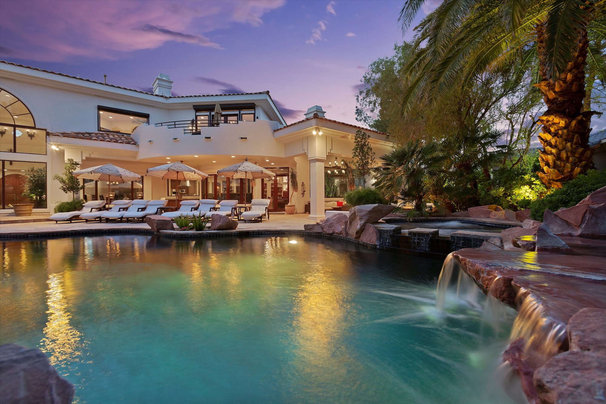 This is a property unlike any other in the Las Vegas area. With more than 7,000 square feet of exquisite interior space, including a charming casita, this home surprises, and delights at every turn. The main residence has five bedrooms, six baths, and four fireplaces. It will exceed all your expectations for tranquility, comfort and style, and space. Quality interior finishes compound the distinctive beauty of natural materials. Drama extends outdoors to a lagoon pool with a backdrop of water cascading over natural boulders, encircled by towering palms, and well-designed outdoor living areas.