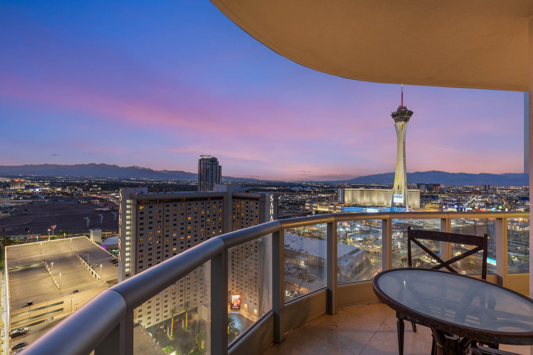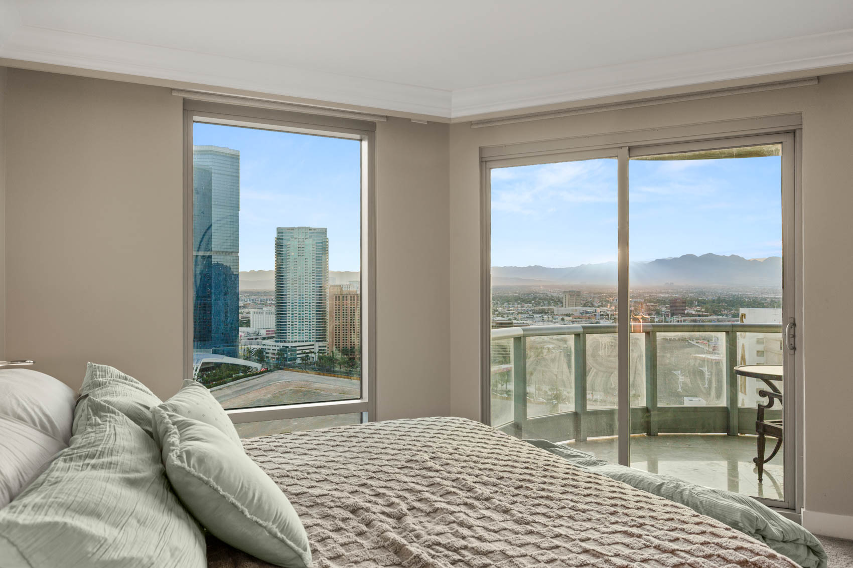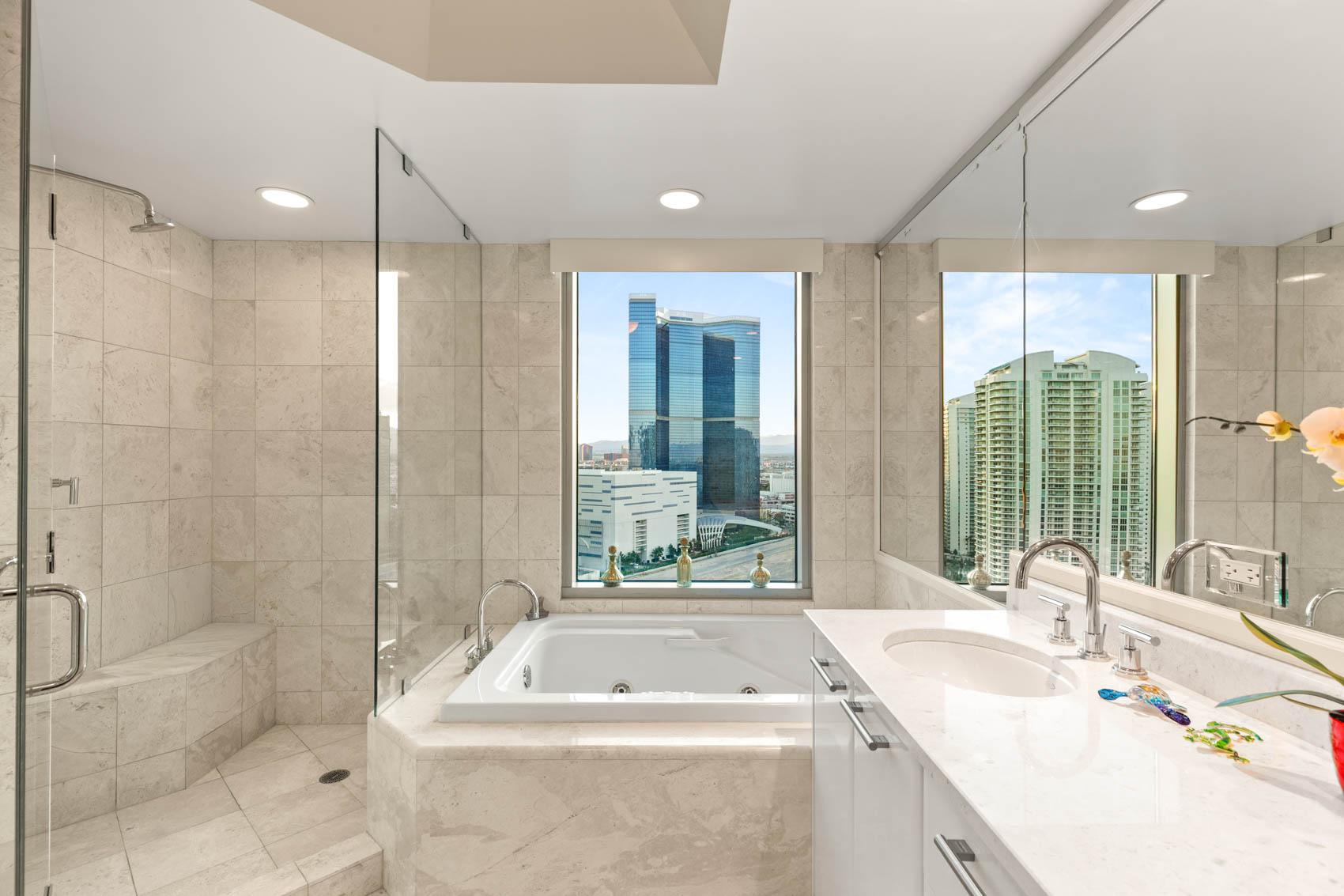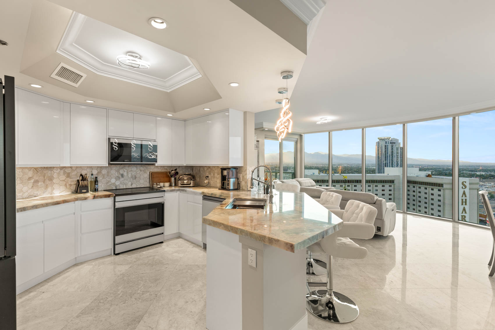 Perched on the 28th floor, this newly renovated 2-bed + den, 2-bath residence at Turnberry Towers offers sweeping Strip and mountain views through floor-to-ceiling wraparound windows. Spanning 1,657 sq ft, the open layout is filled with natural light, highlighted by marble floors, neutral tones, and custom crown moulding.