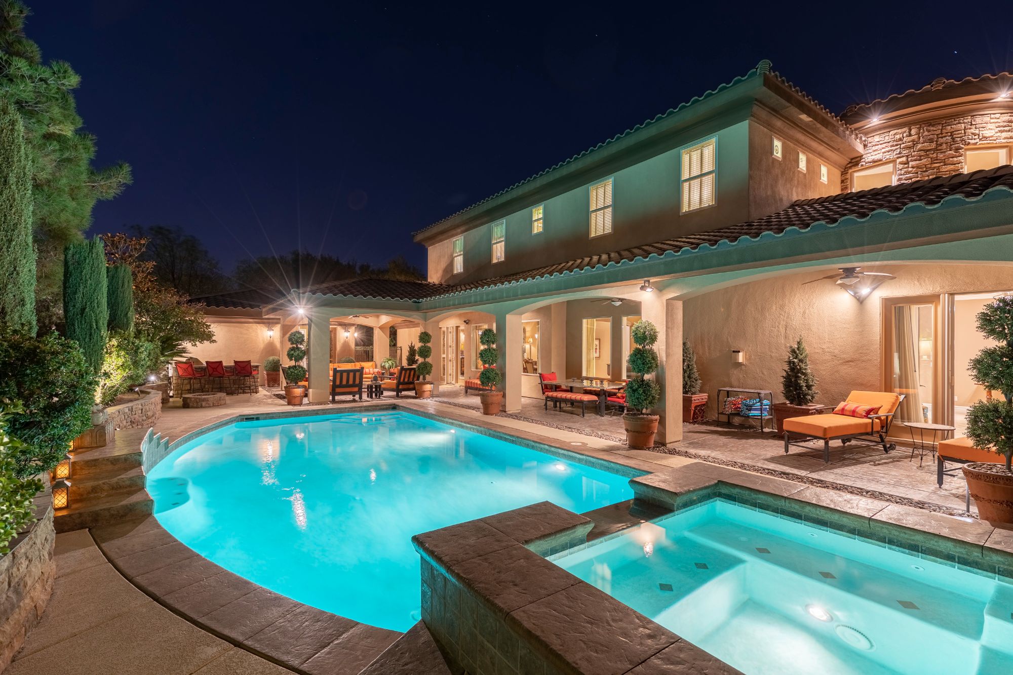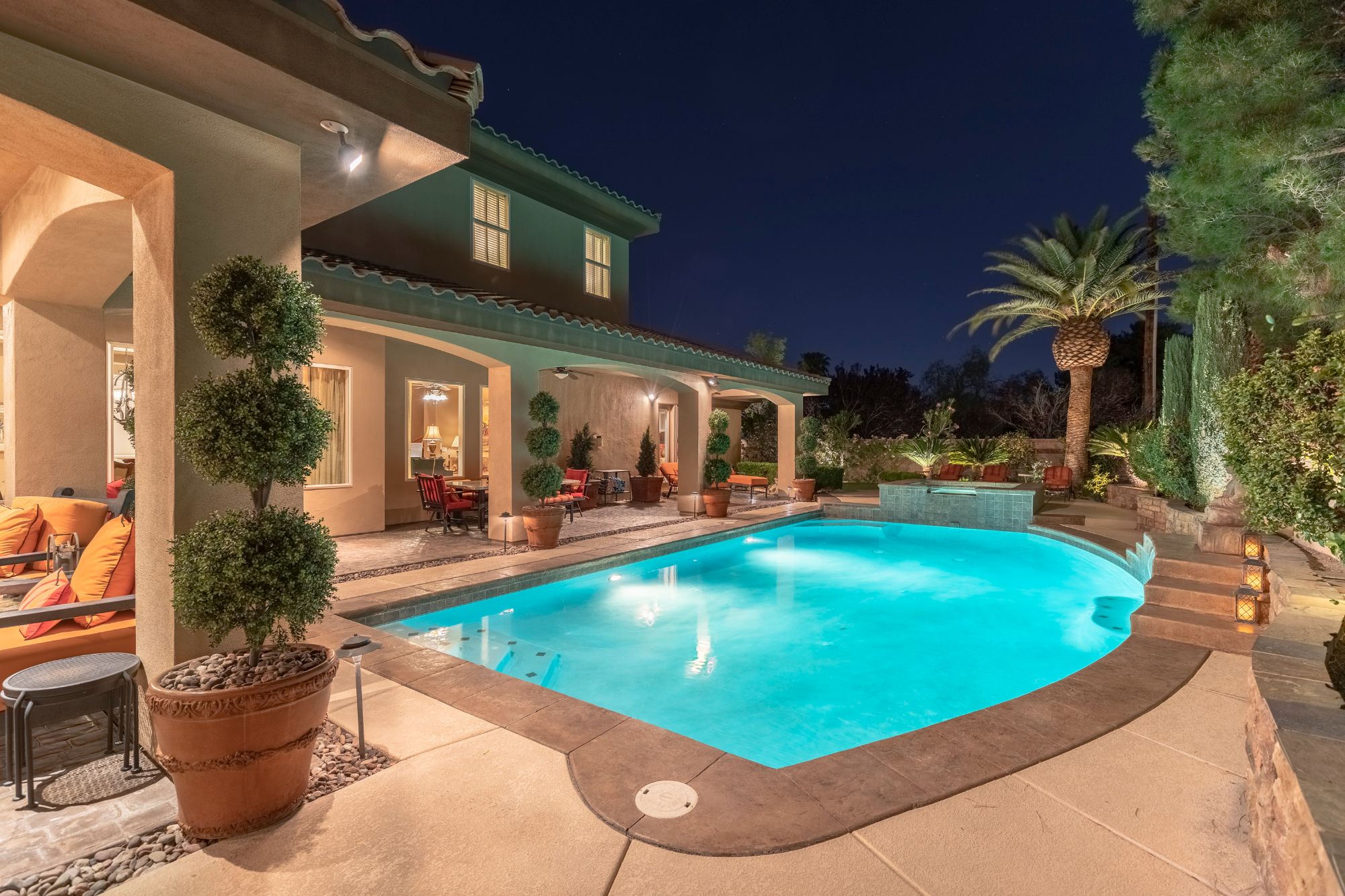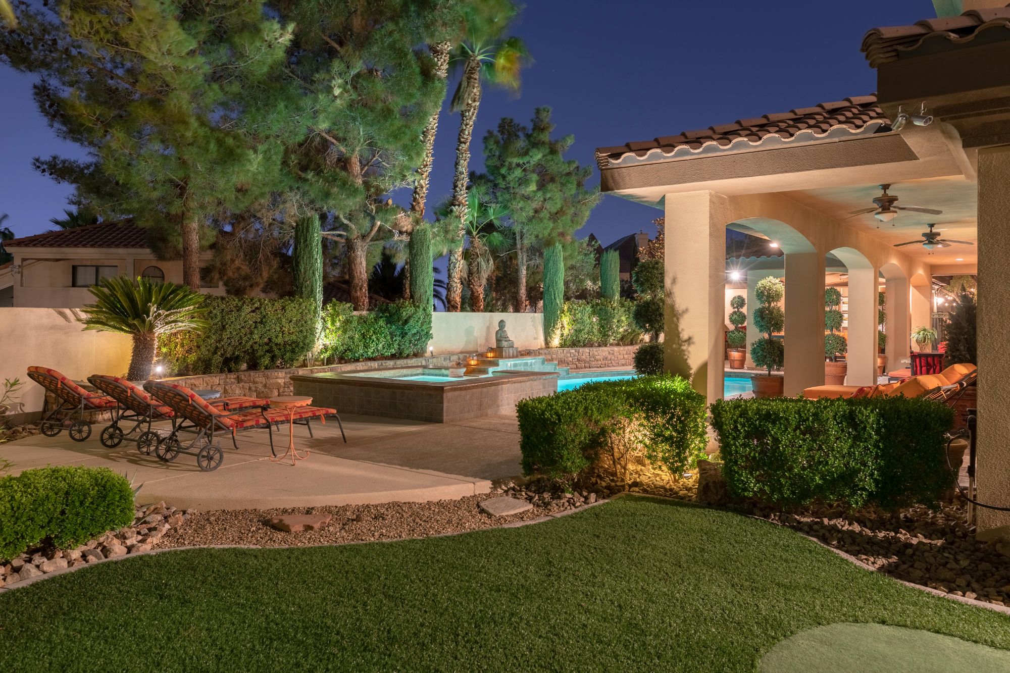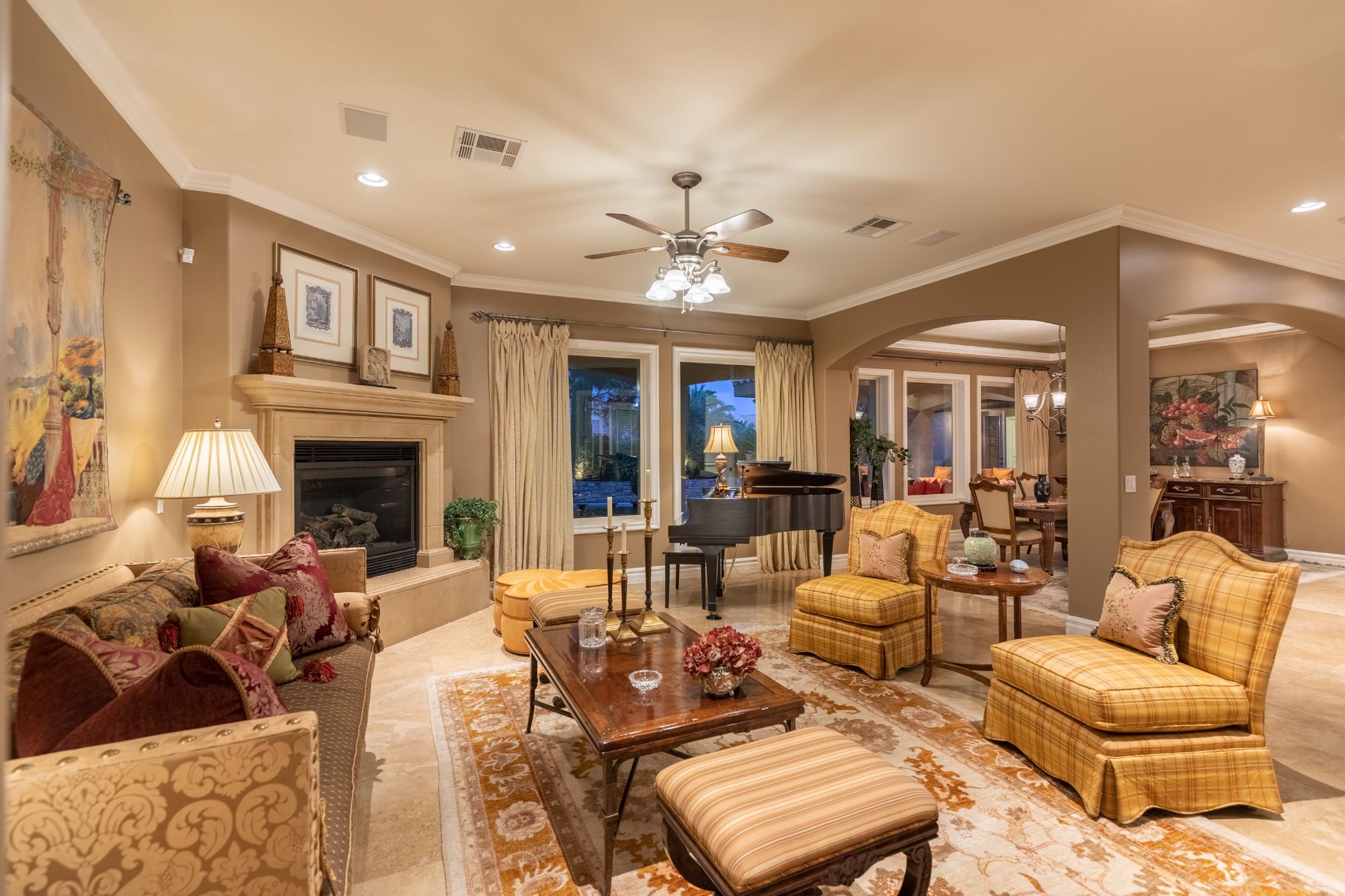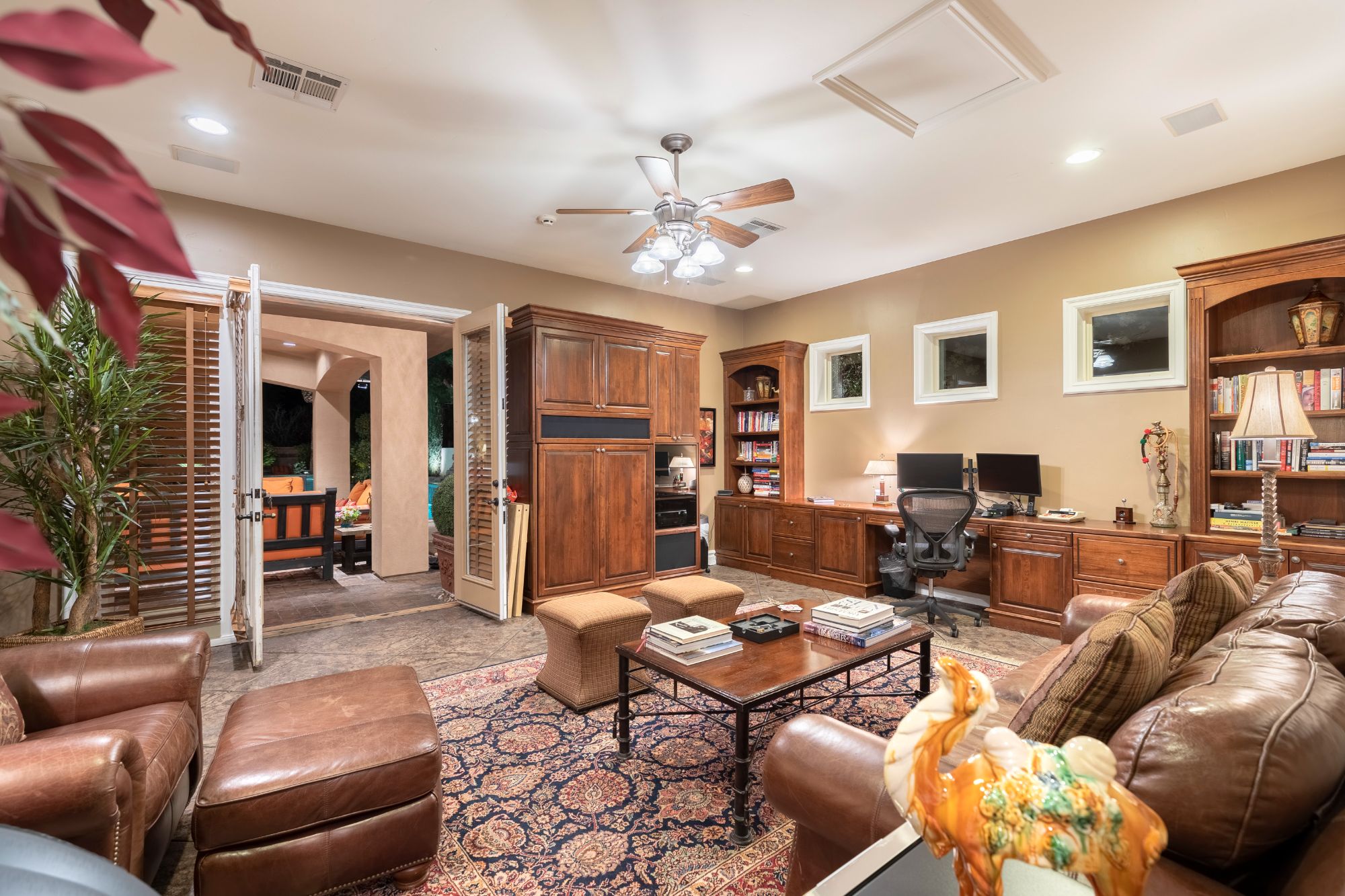 Fully landscaped grounds include mature trees and planting areas, a three-hole putting green and a delightful backyard pool and spa, in addition to an expansive covered lanai, several distinct gathering areas, and an outdoor kitchen with an inviting serving bar. The master suite is on the main level and features a stunning private bath with dual vanities, a soaking tub and a superb custom closet/dressing room. The suite allows direct access to private backyard space as well as an adjacent private study/office. Three additional bedrooms, each with a walk-in closet and private bath, are situated on the home's second floor, along with a comfortable loft/sitting room with access to an outdoor balcony. The home boasts a semi-detached casita/pool pavilion with a full bath, oversized garage parking space for three vehicles, and a gated RV parking area.