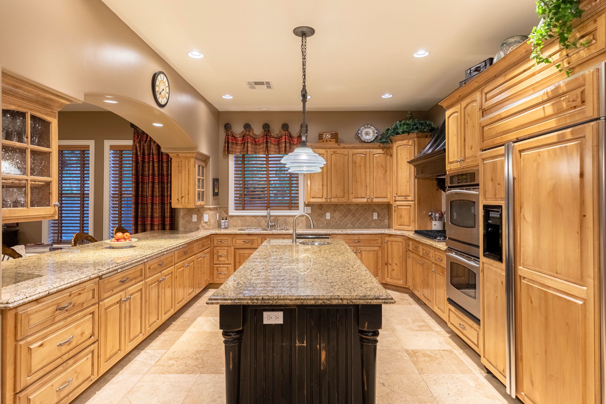 Highlighted by caramel-tone wood cabinets, top of the line built-in appliances, the kitchen features a large contrasting-finish central island and granite countertops. An informal dining nook is tucked into a corner with backyard access.