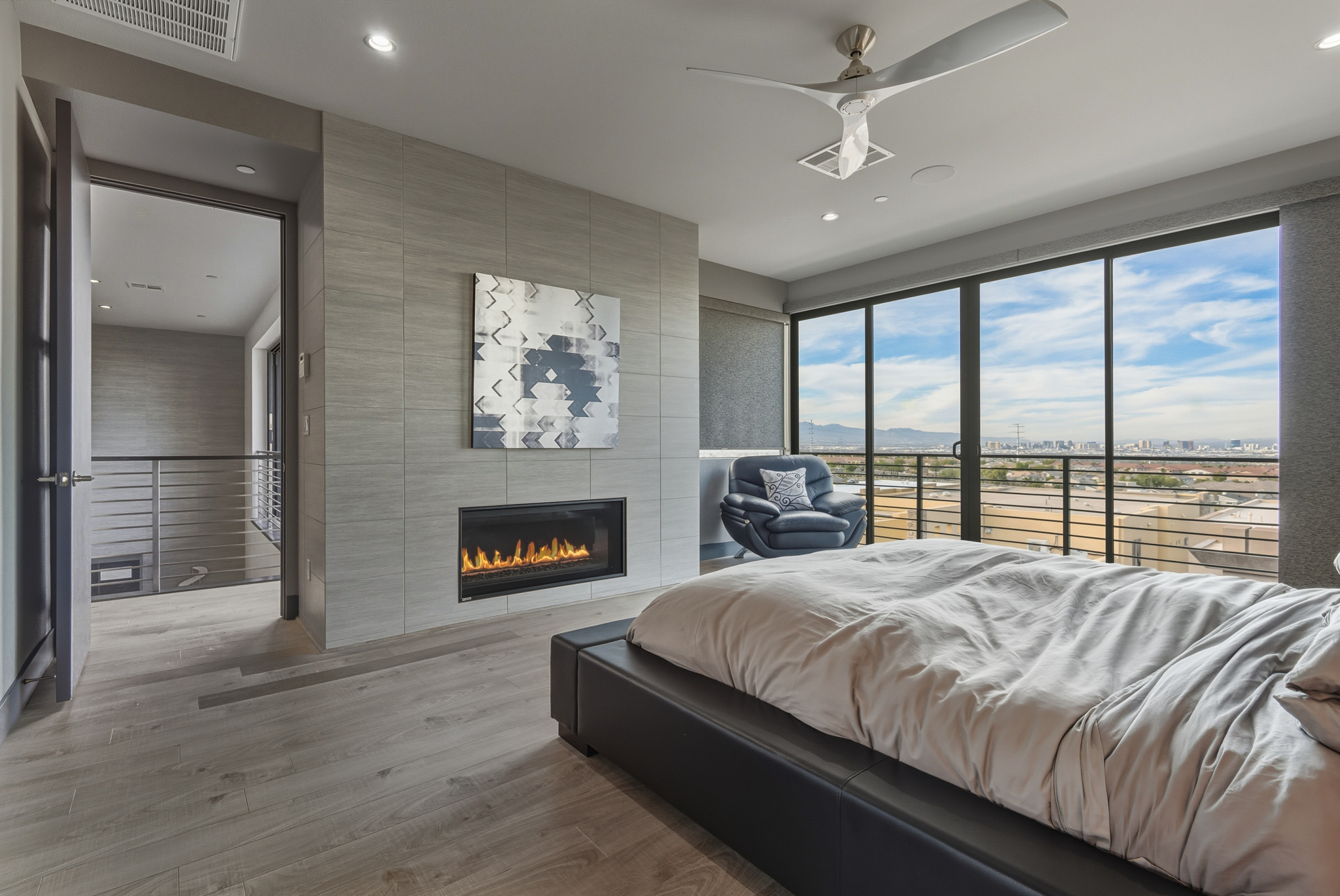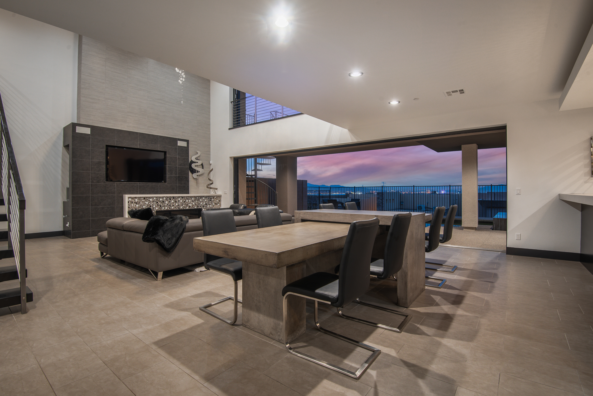 Inside, the great room and chef’s kitchen are framed by floor-to-ceiling views of the city, mountains, and Las Vegas Strip, with sleek pocket doors that open to create a true indoor-outdoor living experience. Multiple decks, patios, and lounging areas extend the living space, while the resort-style pool and knife-edge Jacuzzi provide a stunning centerpiece for relaxation and entertaining. Situated on a 7,840-sq-ft lot, the home balances grandeur with quiet privacy—an elevated sanctuary where modern design, luxury finishes, and breathtaking vistas converge.