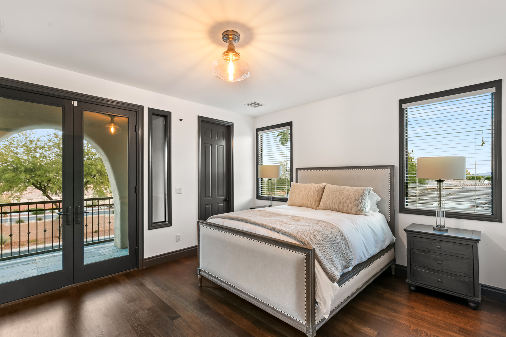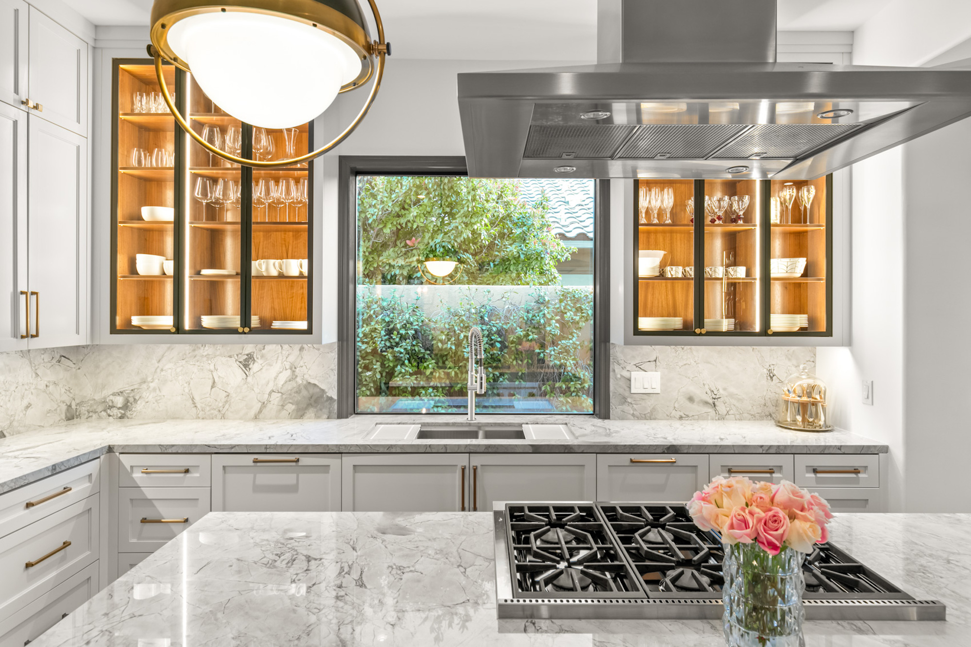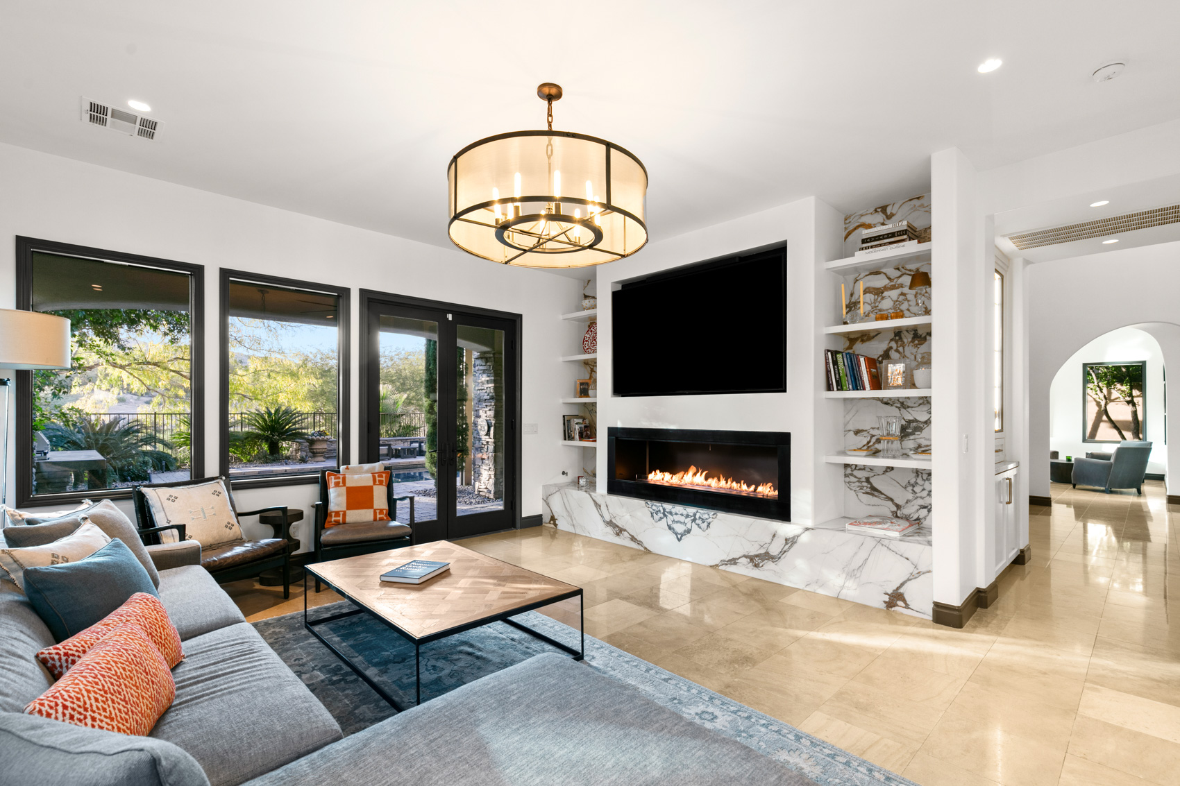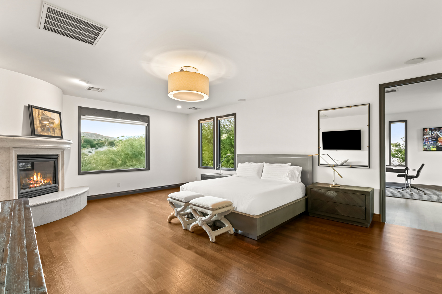 The kitchen includes Sub Zero appliances, Wolf range top and high function and form quartzite countertops. Real hardwood floors are found throughout, including the primary suite that serves as a place of reprieve with a covered outdoor patio and adjacent office.