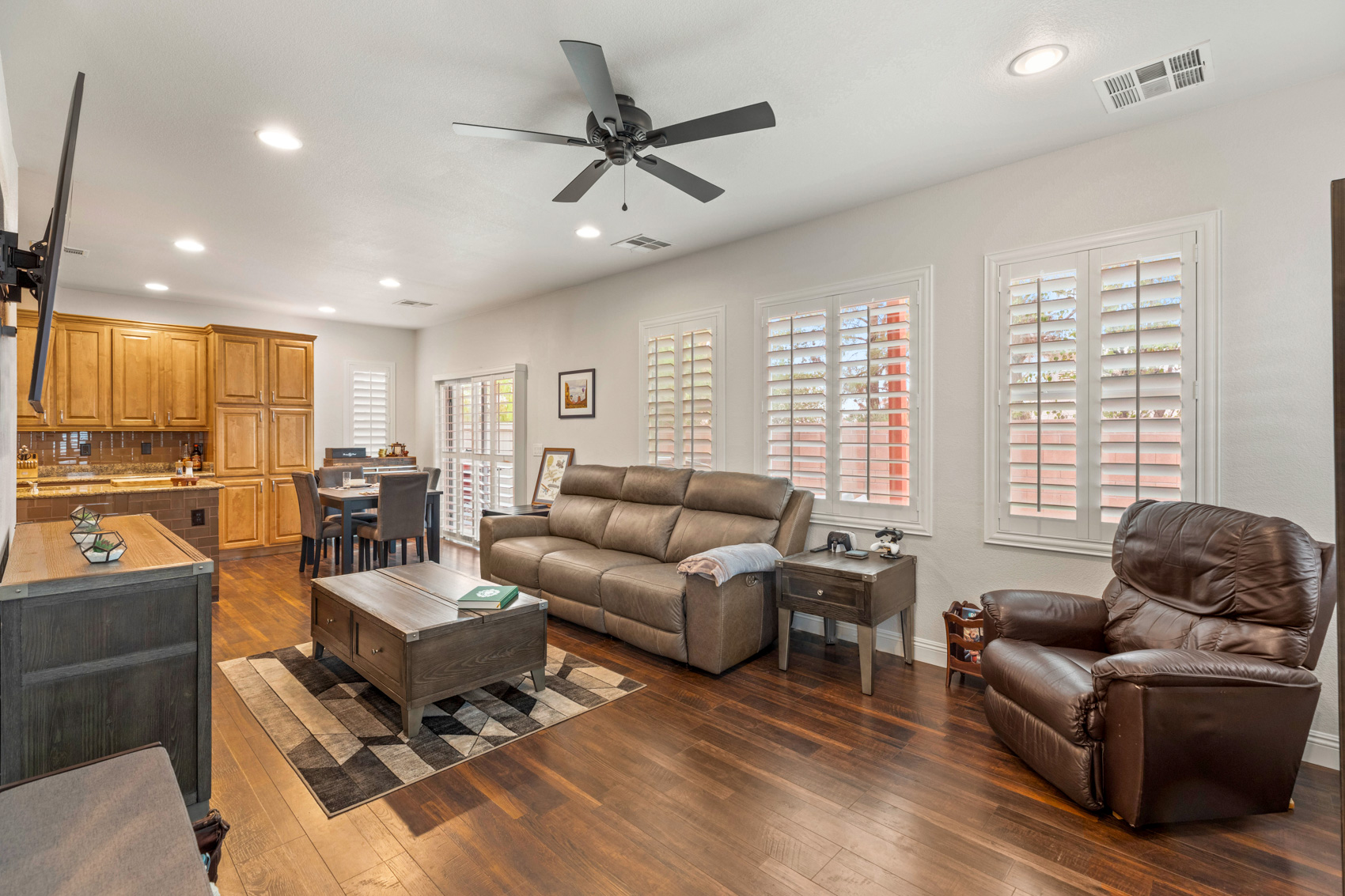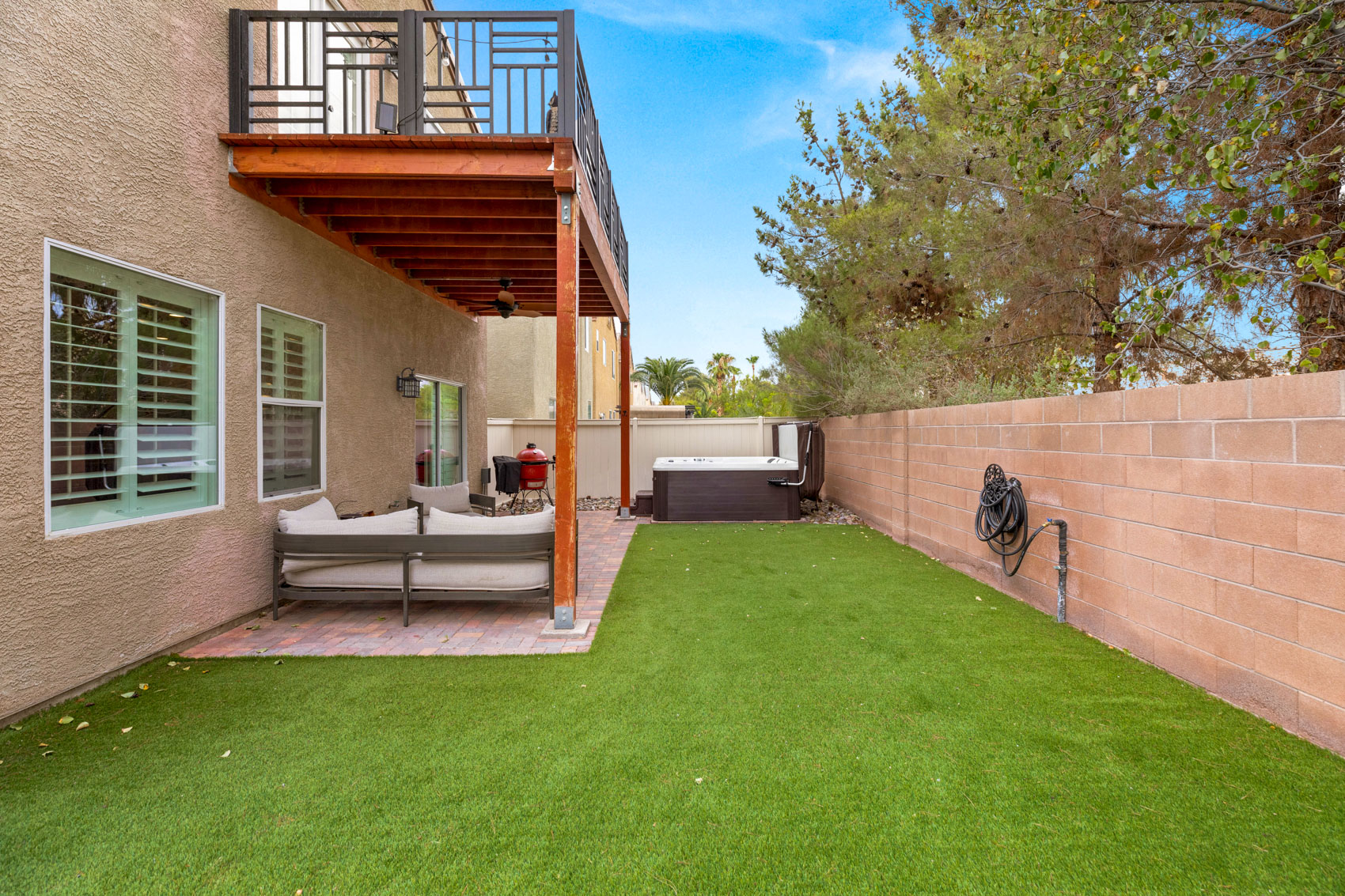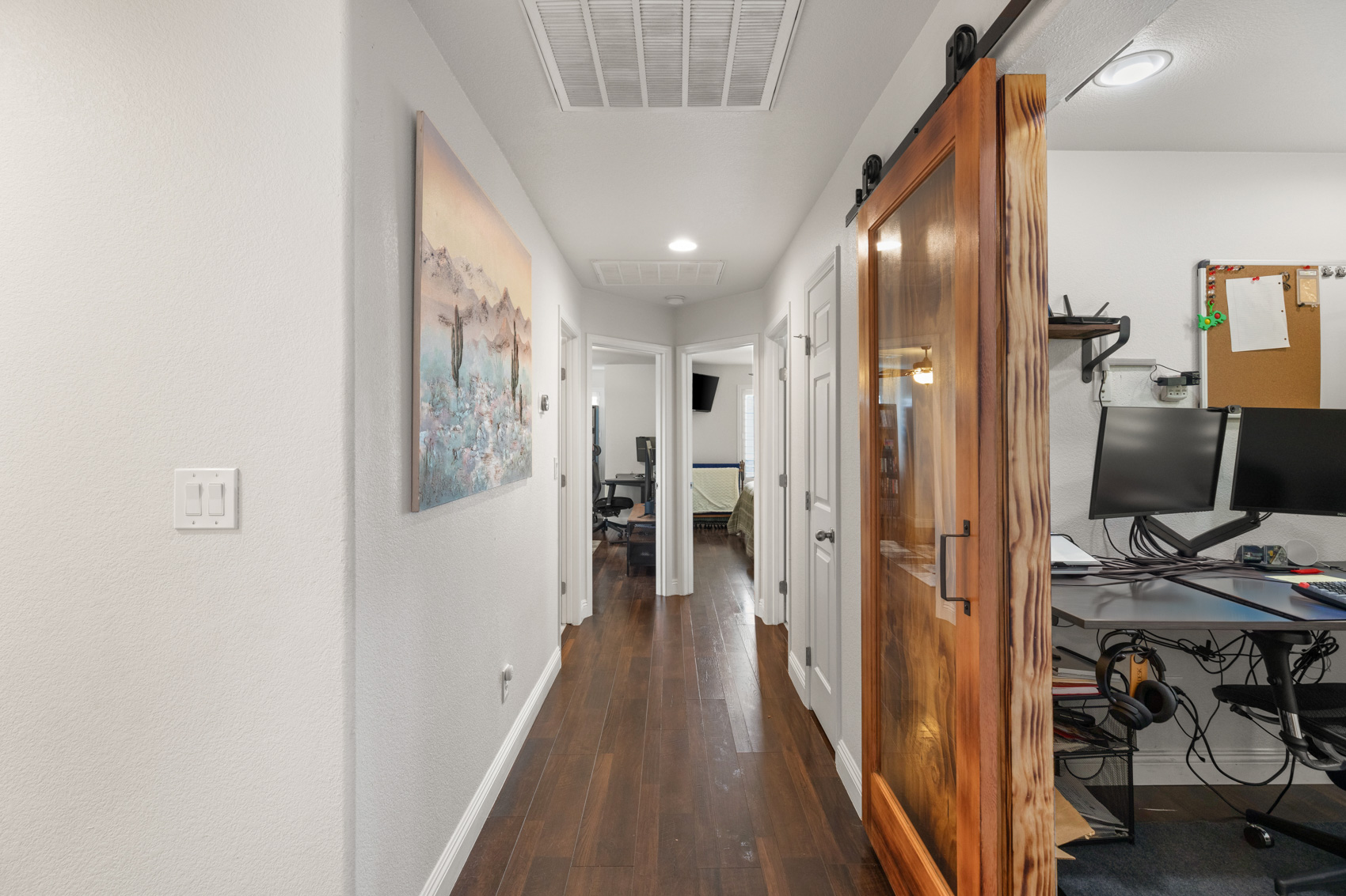 Plantation shutters are throughout with other upgrades including recessed lighting throughout, google nest thermostats, reverse osmosis, dimmer switches, paid off solar, ceiling fans, custom tile work, new AC unit and manufactured wood flooring. The primary bedroom is spacious with double doors leading to a large balcony and feat. A breakfast bar with fridge, custom closet, and custom spa like bath. With one bedroom down, two secondary rooms upstairs and an upstairs office with custom sliding barn door this home offers plenty of space and gives the feel of a much larger home. Outside buyers will find new turf a covered patio and above ground spa making this the perfect home to enjoy.