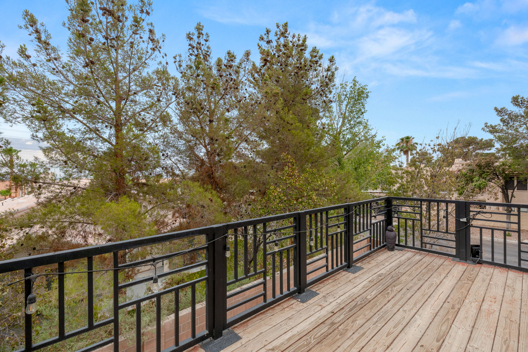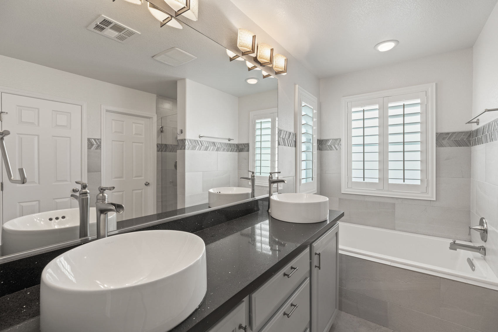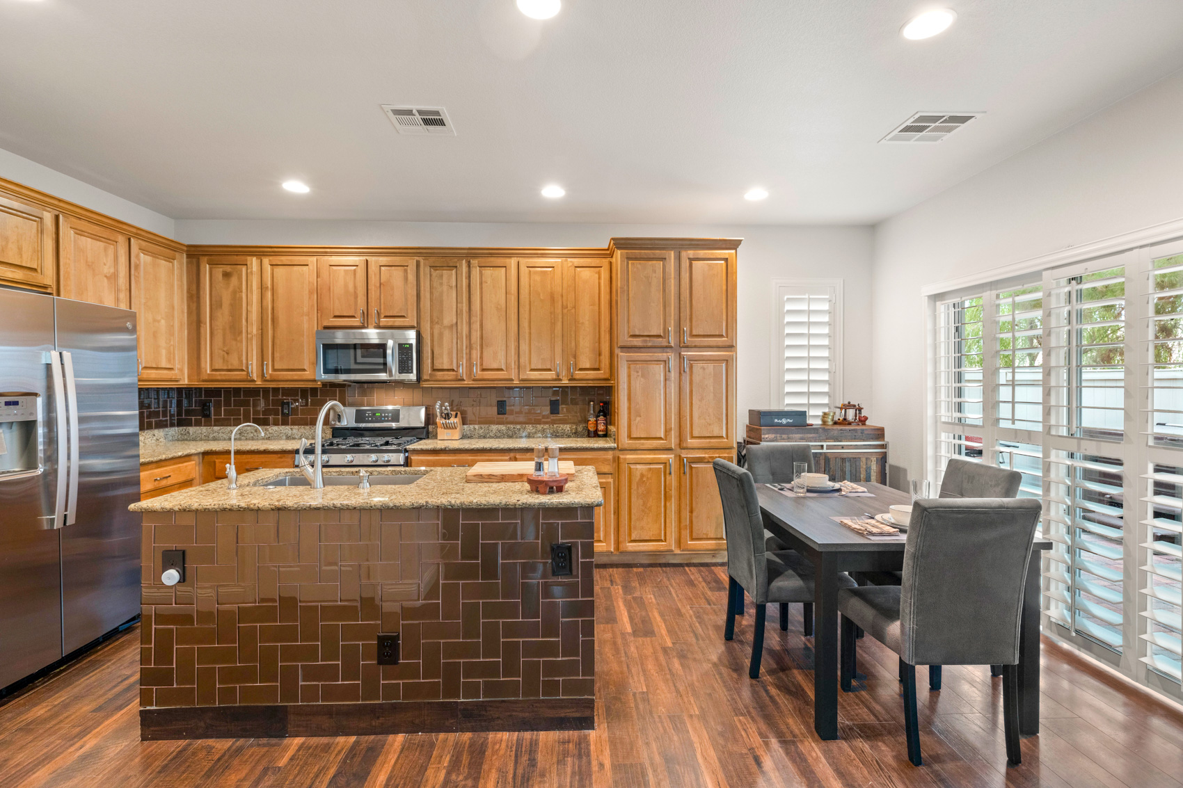 Plantation shutters are throughout with other upgrades including recessed lighting throughout, google nest thermostats, reverse osmosis, dimmer switches, paid off solar, ceiling fans, custom tile work, new AC unit and manufactured wood flooring. The primary bedroom is spacious with double doors leading to a large balcony and feat. A breakfast bar with fridge, custom closet, and custom spa like bath. With one bedroom down, two secondary rooms upstairs and an upstairs office with custom sliding barn door this home offers plenty of space and gives the feel of a much larger home. Outside buyers will find new turf a covered patio and above ground spa making this the perfect home to enjoy.