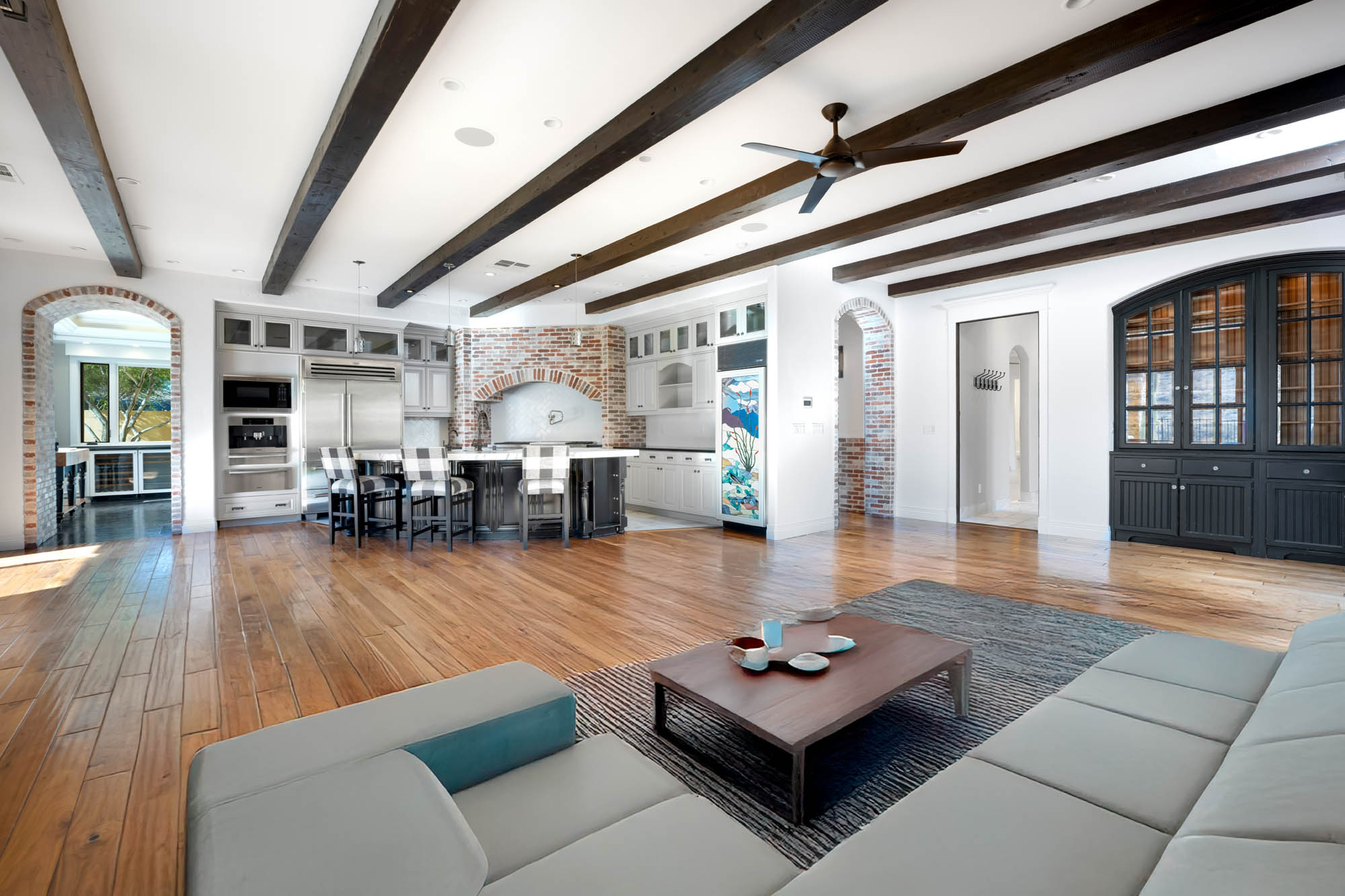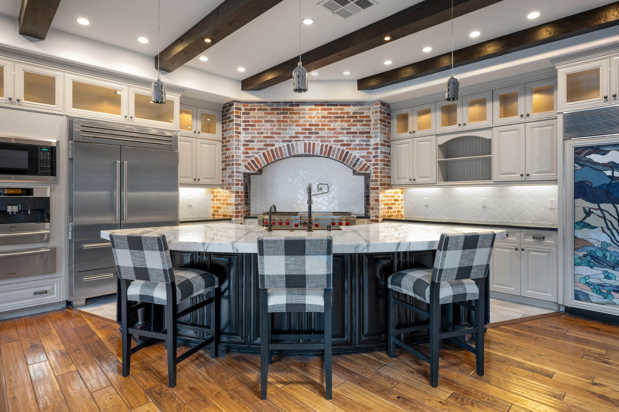 The heart of the home is a designer kitchen, a true culinary masterpiece where dramatic beamed ceilings, artisan brickwork, and rich two-tone cabinetry create an atmosphere of timeless elegance. A copper farmhouse sink, pot filler, and a full suite of professional-grade appliances make every meal preparation an experience. This space flows seamlessly into a sun-drenched great room, anchored by a stately gas fireplace, offering the perfect setting for gatherings both grand and intimate.