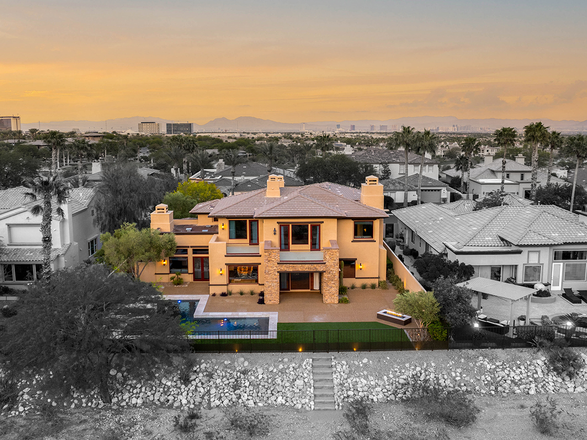 Two bedrooms are conveniently located on the main level, ideal for guests or multi-generational living. One boasts its own ensuite bath, offering comfort and privacy. Ascend the sweeping hardwood staircase to discover the grand primary suite, a true retreat featuring French doors that open to a tranquil seating area and a private balcony with breathtaking mountain views. The spa-inspired primary bathroom invites relaxation with a rainfall shower enhanced by body jets, a freestanding soaking tub, and elegant designer finishes. Two additional upstairs bedrooms each offer their own ensuite bathrooms and private balconies, one beautifully adorned with marble details, perfect for enjoying the serene desert evenings. Outdoor living is equally impressive, designed for year-round enjoyment. Gather in the intimate courtyard by the cozy outdoor fireplace, or retreat to the backyard oasis where a sparkling pool, elevated spa, firepit, and lush landscaping are all framed by spectacular views of Red Rockās iconic peaks. Whether hosting friends or savoring a quiet sunset, every moment here feels extraordinary. Located within the prestigious, guard-gated community of Red Rock Country Club, residents enjoy access to world-class golf courses, exquisite dining, a full fitness center, tennis courts, and an unparalleled sense of security and privacy. At 2369 Green Mountain Court, luxury, nature, and elegance come together to create a lifestyle unlike any other.