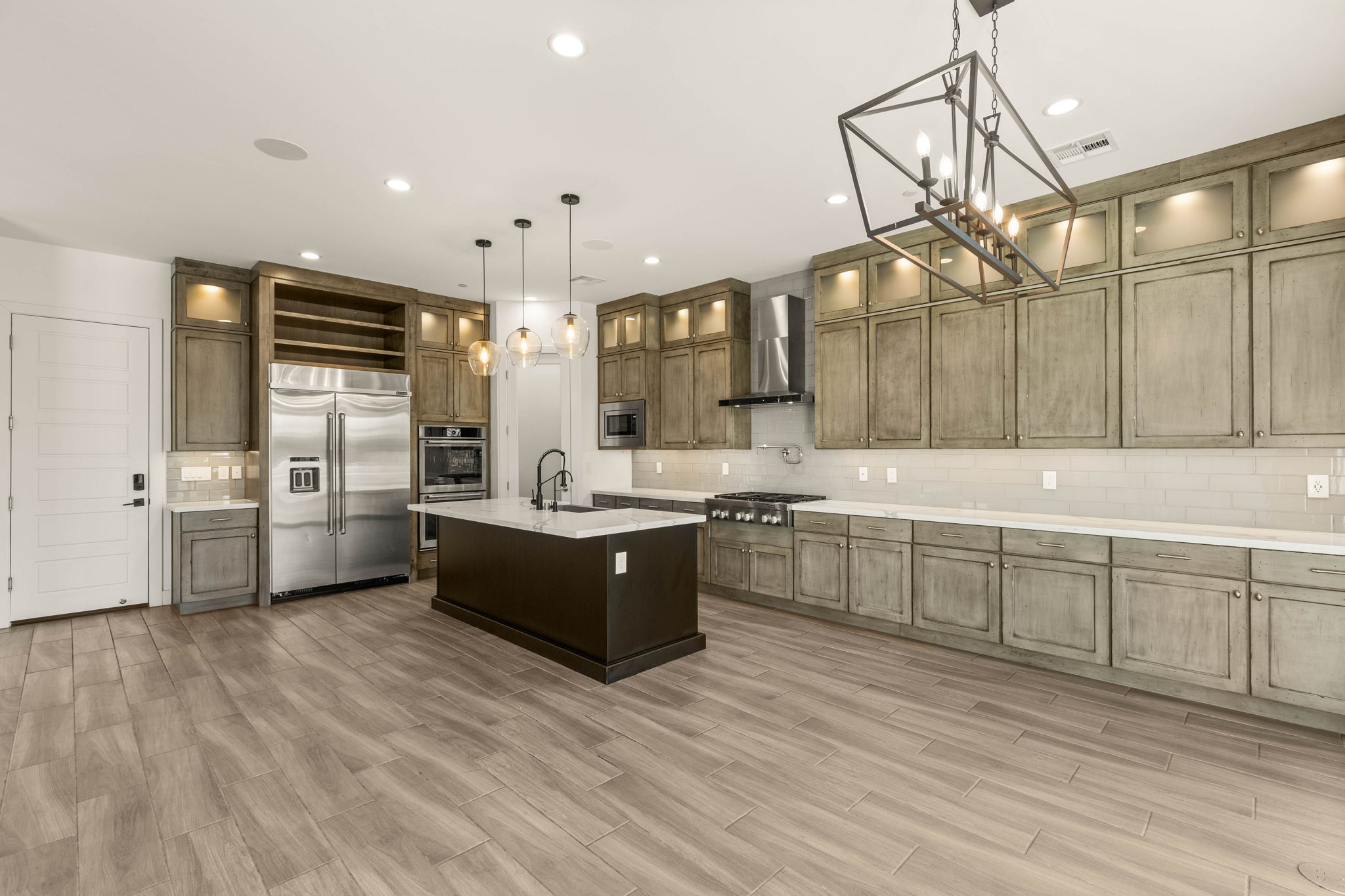 Inside, the open-concept layout seamlessly connects living, dining, and entertaining spaces. The heart of the home is the chefās kitchen, appointed with quartz countertops, a commercial-grade refrigerator and freezer, stainless steel appliances including double wall ovens, a generous apron-front sink, custom tile backsplash, and abundant storage. The adjoining great room, framed by a wall of glass sliding doors, opens to a stunning backyard retreatādesigned for both relaxation and lively gatherings.
