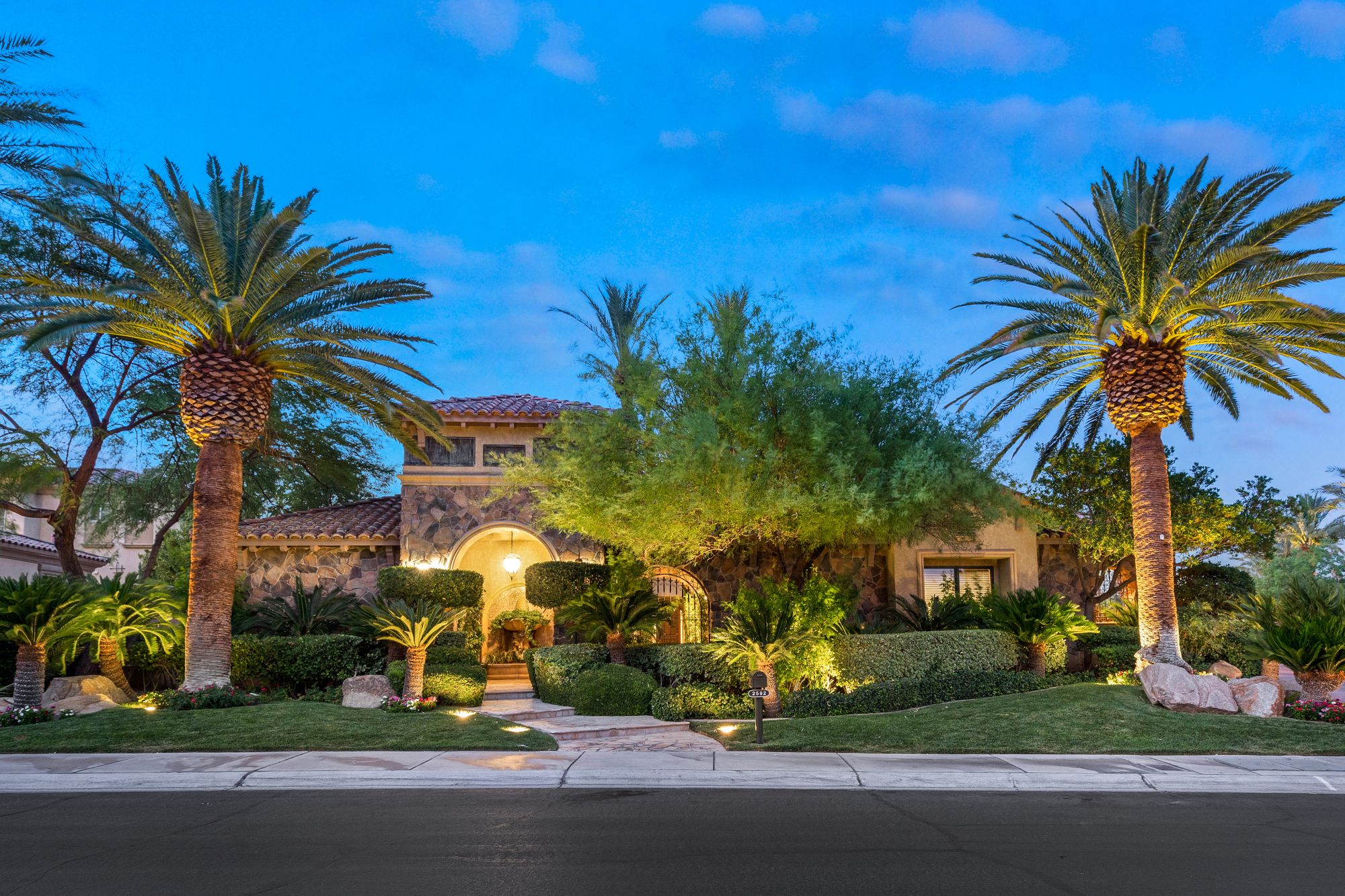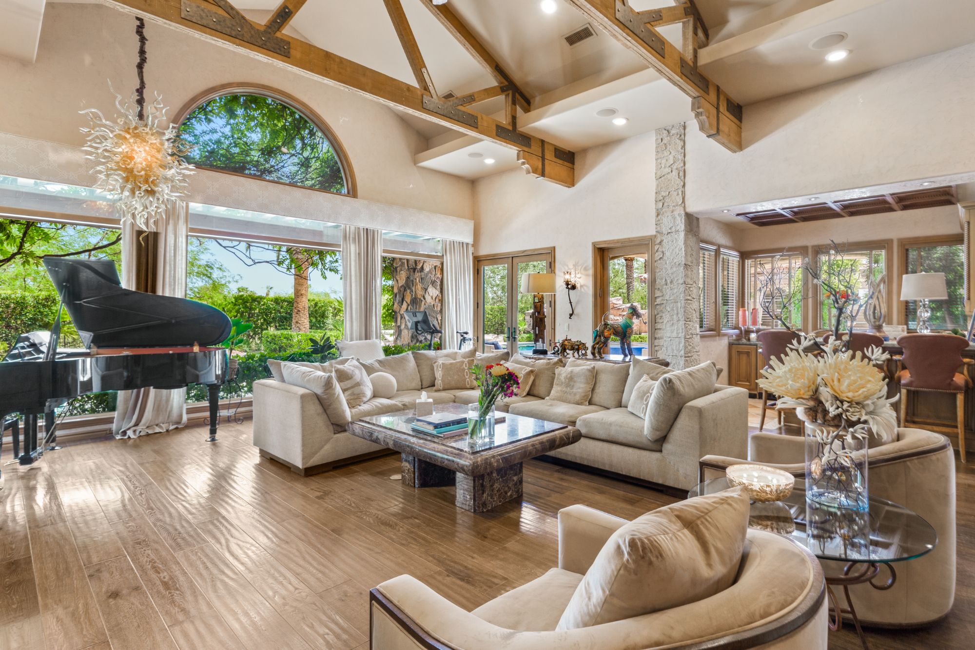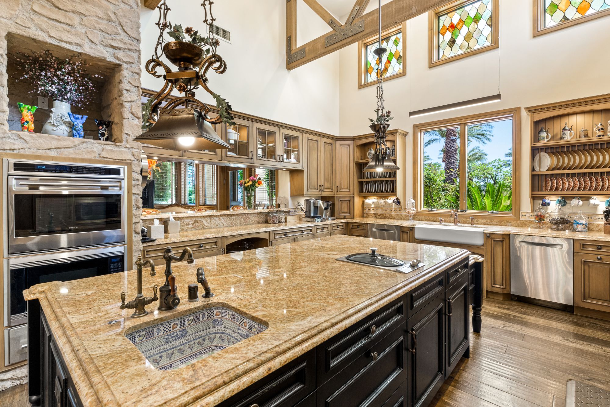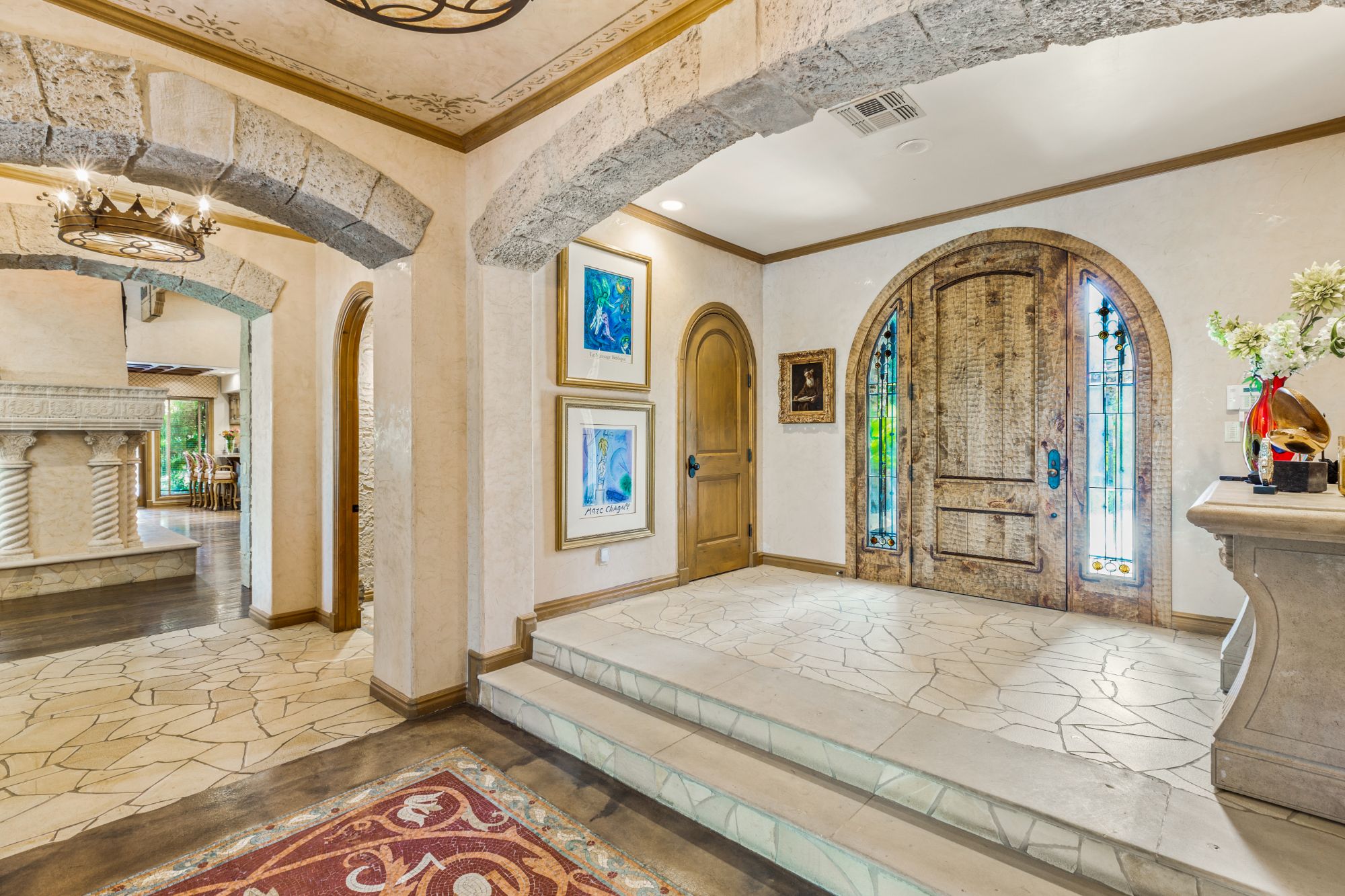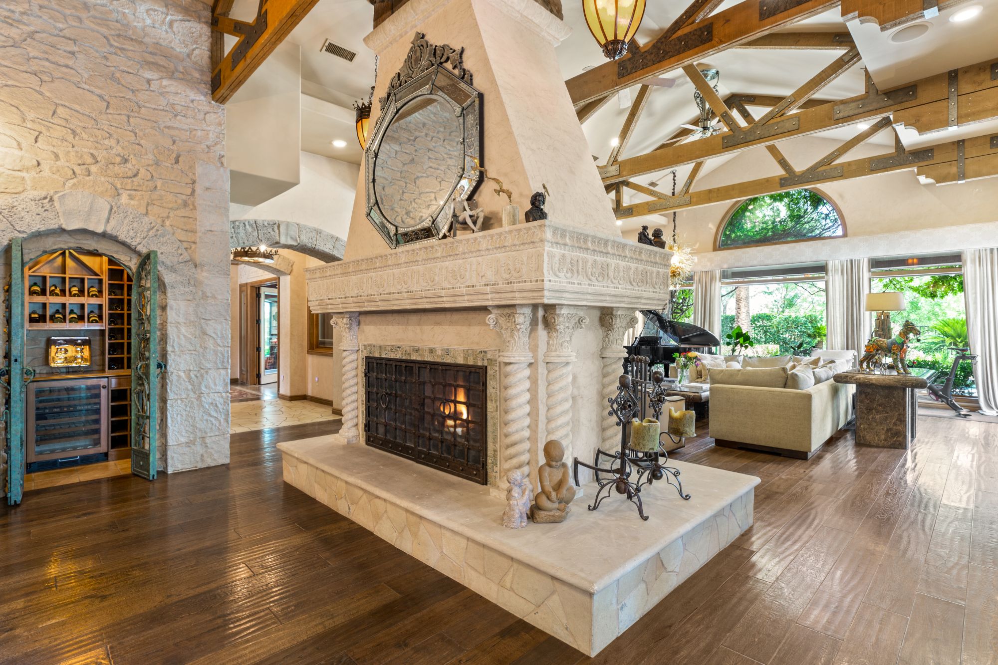 The approach to this home evokes a sense of wonder and discovery -- much like stumbling upon a desert oasis after a long journey. Stately palms and an art-filled cloistered walkway lead to the entrance. This five-bedroom, six-bath home at Red Rock Golf Club has luxury features throughout, with a pleasing balance between function and embellishment, rustic and artistic. Open truss ceilings co-exist happily with delicately-frescoed barrel vaults and fine wood-paneled walls and ceilings blend easily with both carved fireplace surrounds and walls that resemble chiseled stone.