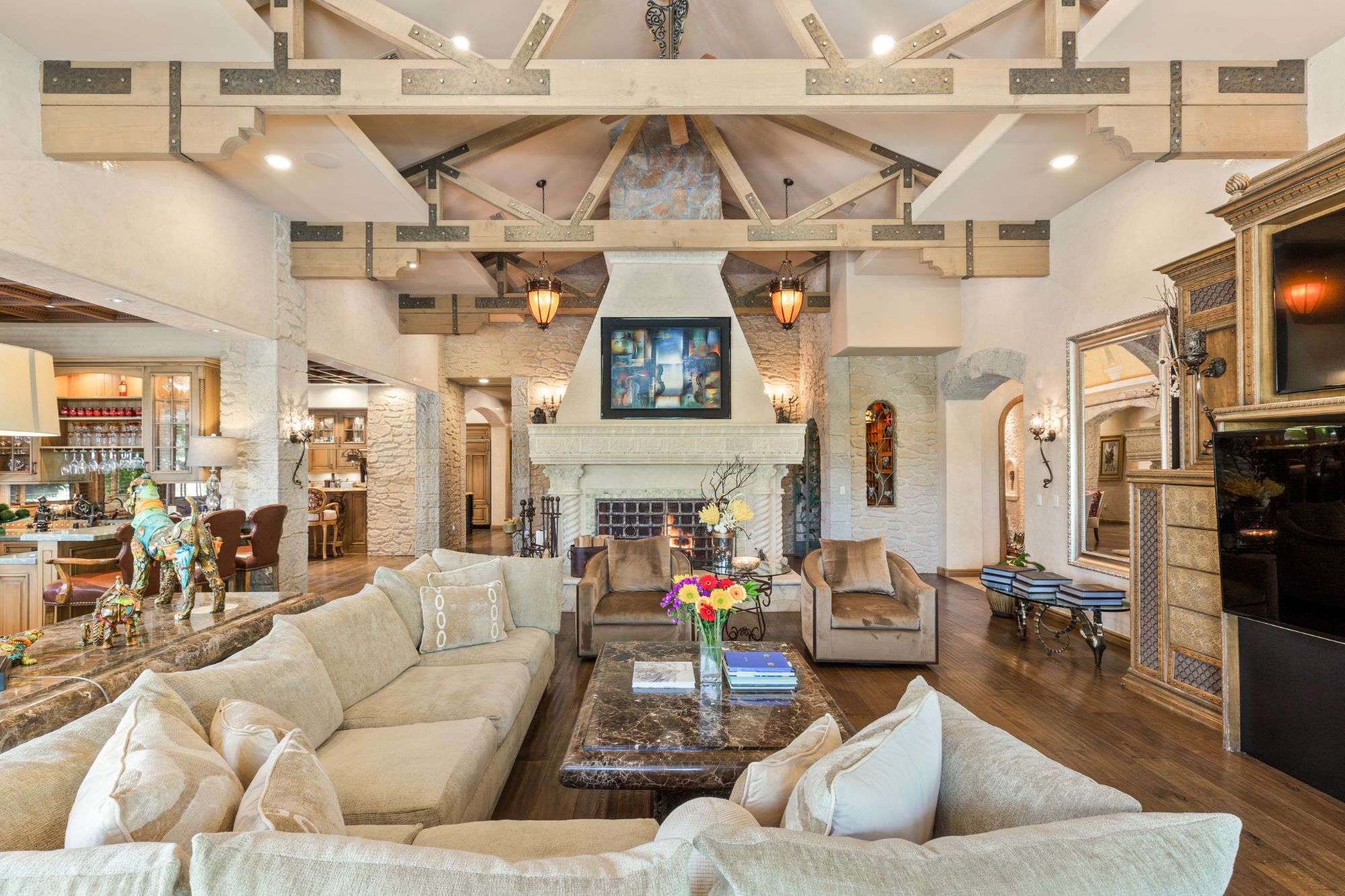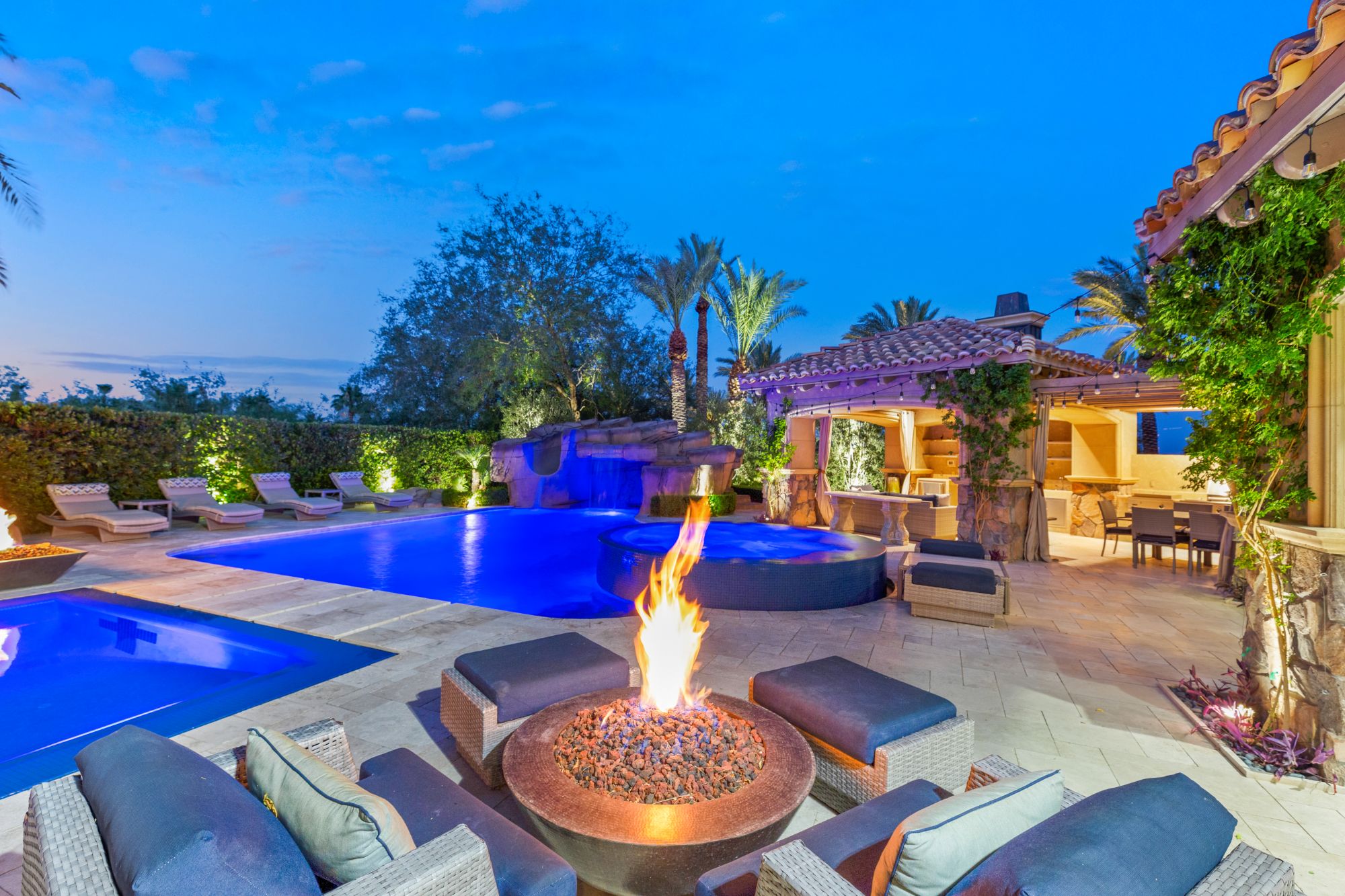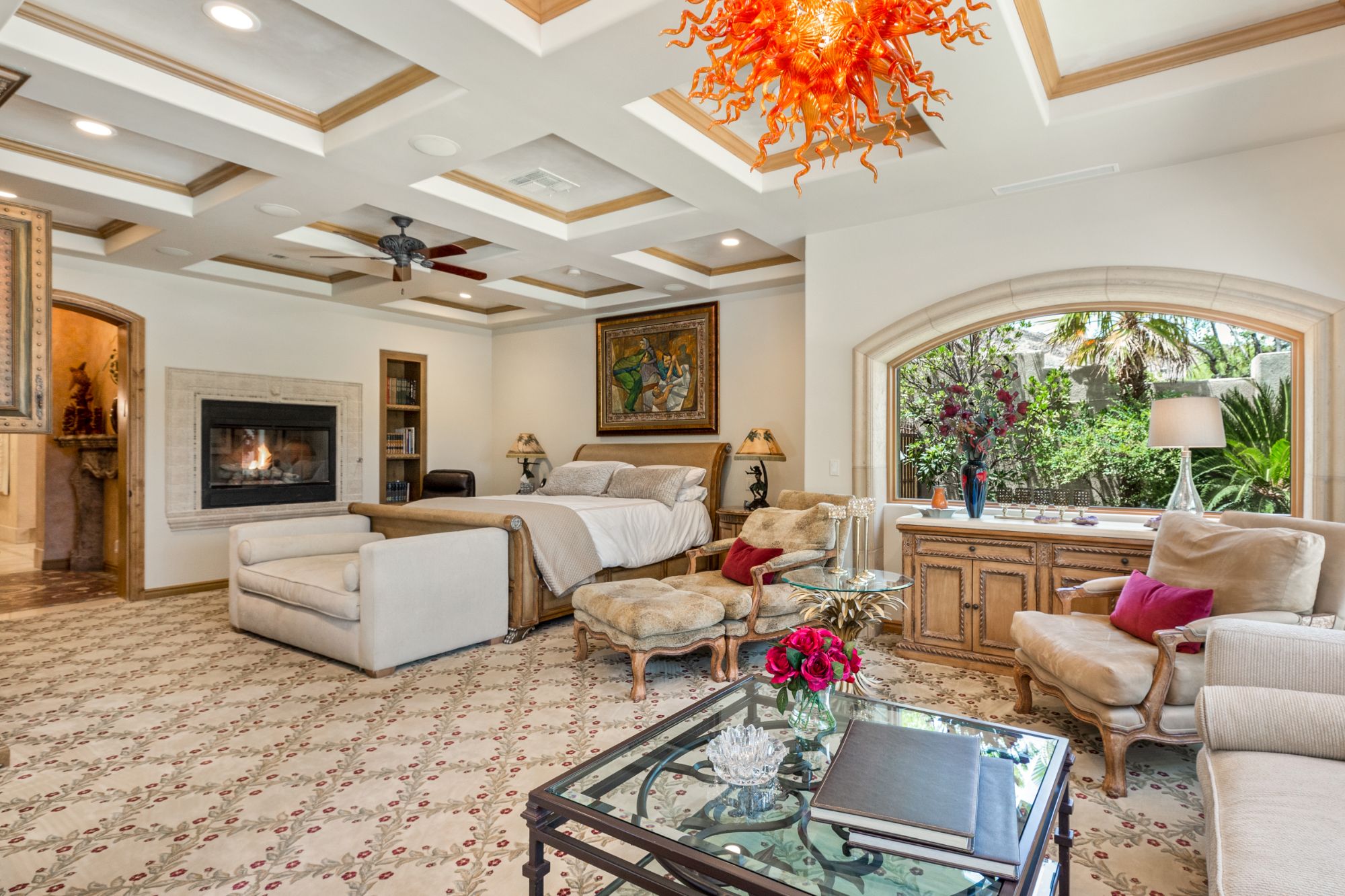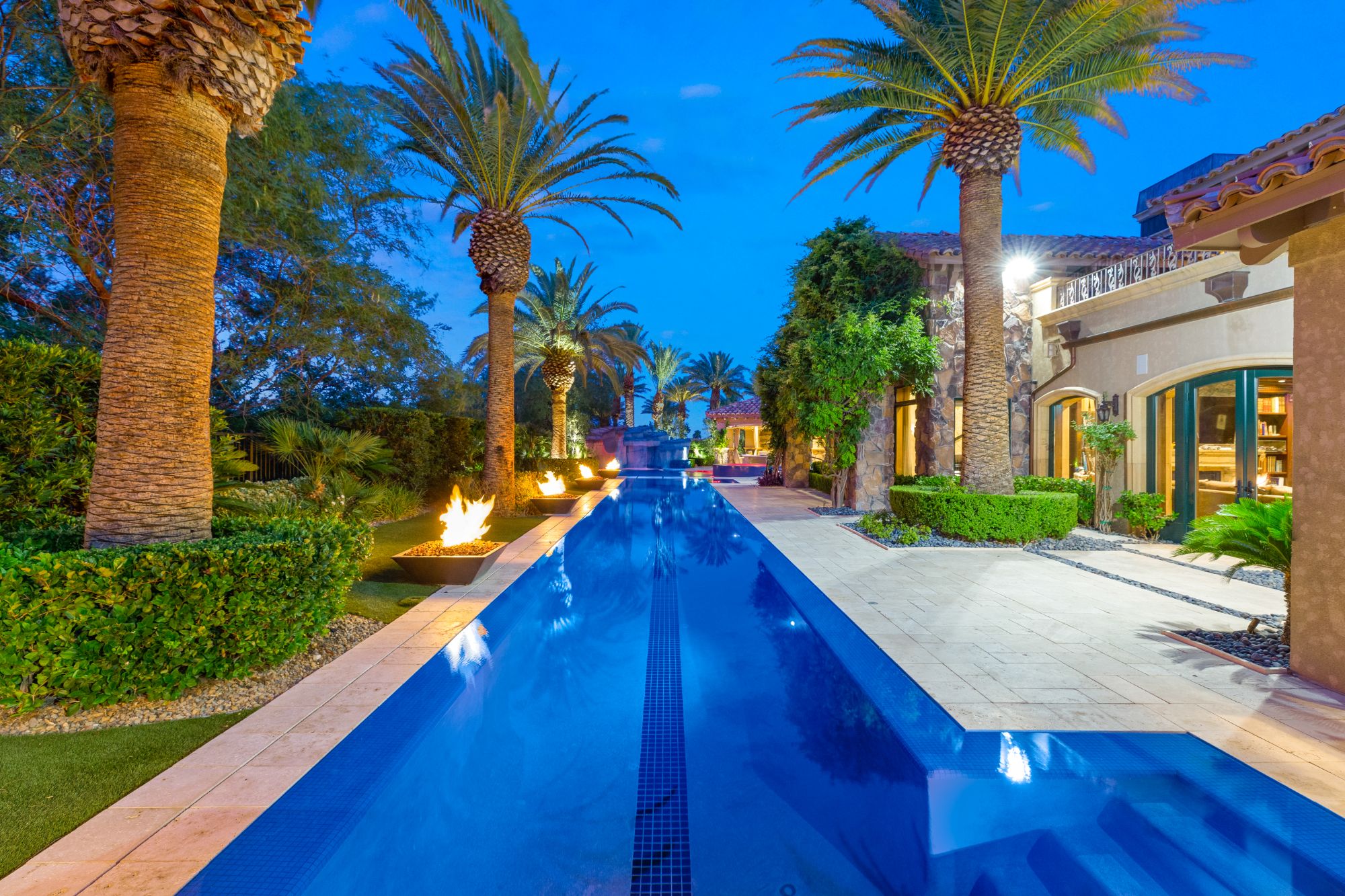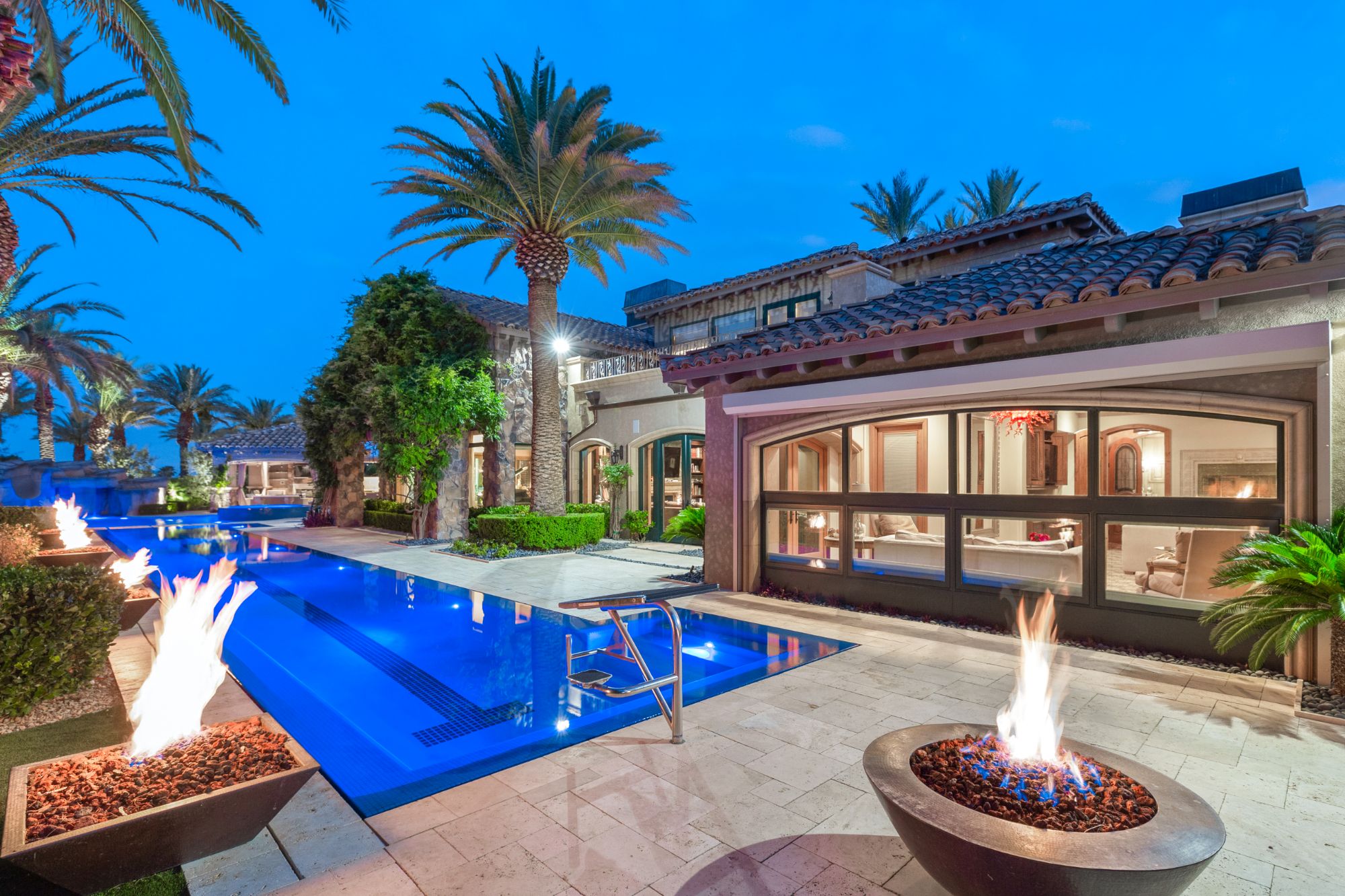 The master bedroom, with its own fireplace, features a wall of garage-door-style windows overlooking the rear yard, with a bath and dressing area to rival any spa. The closet opens directly to a fully-equipped laundry. Second-floor bedrooms and baths have access to an expansive balcony, and the home includes not only a media room with built-in cabinetry, a wall-size screen and upholstered walls, but a dedicated study/office and additional "bonus rooms." With just over 7,500 square feet of interior space, the home has 1,284 square feet of garage parking. Extensively-landscaped outdoor space includes both a free-form lagoon pool with a waterfall and hot tub, and an adjacent lap pool with diving board. There is seating around a large firepit, and a roofed living area complete with ceiling fan, fireplace and large-screen TV, adjacent grilling and dining space nestled under a sheltering ramada, and a nearby basketball court -- ready for all-weather use and large-scale entertainment.