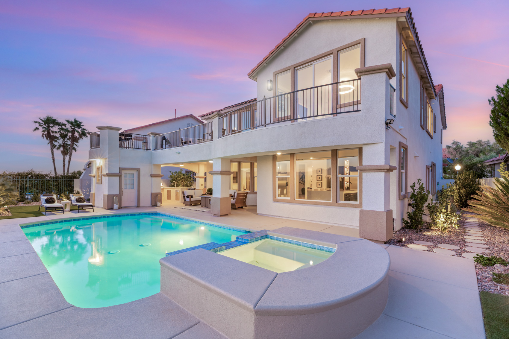 The heart of the home is the gourmet chefās kitchenāfeaturing sleek quartz countertops and backsplash, a stunning oversized waterfall island with custom niche lighting, and top-of-the-line professional stainless steel appliances. Hidden behind the cabinetry is a secret walk-in pantry offering extra storage without compromising the homeās clean, minimalist aesthetic. Adjacent is a lounge area currently used as a piano room, ideal for entertaining or relaxing. The living and family rooms are designed with comfort and atmosphere in mind, enhanced by dimmable lighting and motorized shades that adjust to suit any mood or time of day. A bar area with two wine refrigerators connects to the main living space and provides easy access for hosting. Upstairs, the primary suite is a serene retreat with its own fireplace, spa-inspired bathroom, and private balcony that captures unobstructed views of the city lights and mountains. The ensuite bath features a free-standing soaking tub, spa shower with bench seating, skylight, and elegant finishes throughout. Motorized shades offer effortless privacy and light control. The home theater is equipped with immersive surround sound and offers direct access to the upper balcony, creating a seamless indoor-outdoor entertainment experience. Step outside to your private resort-style backyard, where a sparkling pool and spa are surrounded by lush landscaping, fruit trees, and brand-new exterior lighting with motion sensors. The full outdoor kitchenācomplete with built-in TV and covered patioāis perfect for alfresco dining and entertaining. An outdoor pool house with a bathroom adds functionality and charm. The oversized 3-car garage includes epoxy flooring and an EV charging station. In addition to owned solar panels, the home features a Tesla Powerwall, which stores solar energy and provides seamless backup power during an outageāadding peace of mind and energy efficiency. Nestled in Seven Hills, one of Hendersonās most exclusive communities, this home is surrounded by scenic trails, golf courses, top-rated schools, and just minutes from world-class dining and shopping. Homes like thisāfully remodeled, move-in ready, and offering views this spectacularārarely come to market. 2736 Botticelli Drive presents a rare opportunity to own a one-of-a-kind modern estate that redefines luxury desert living.